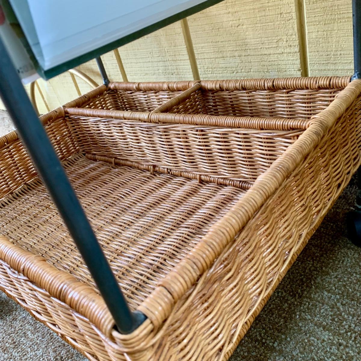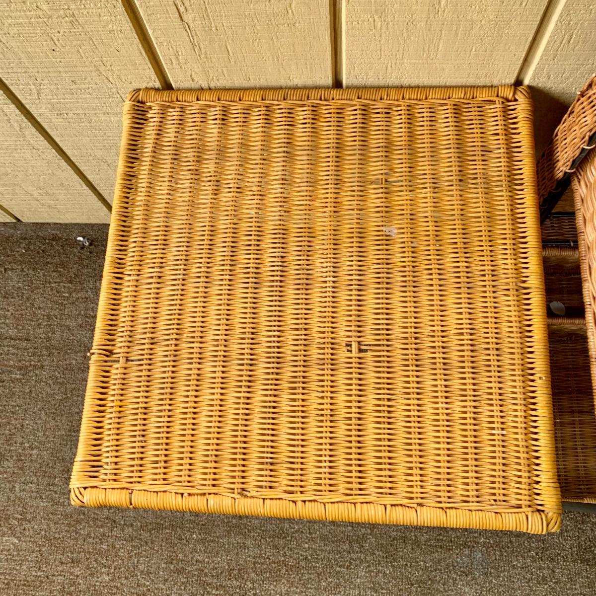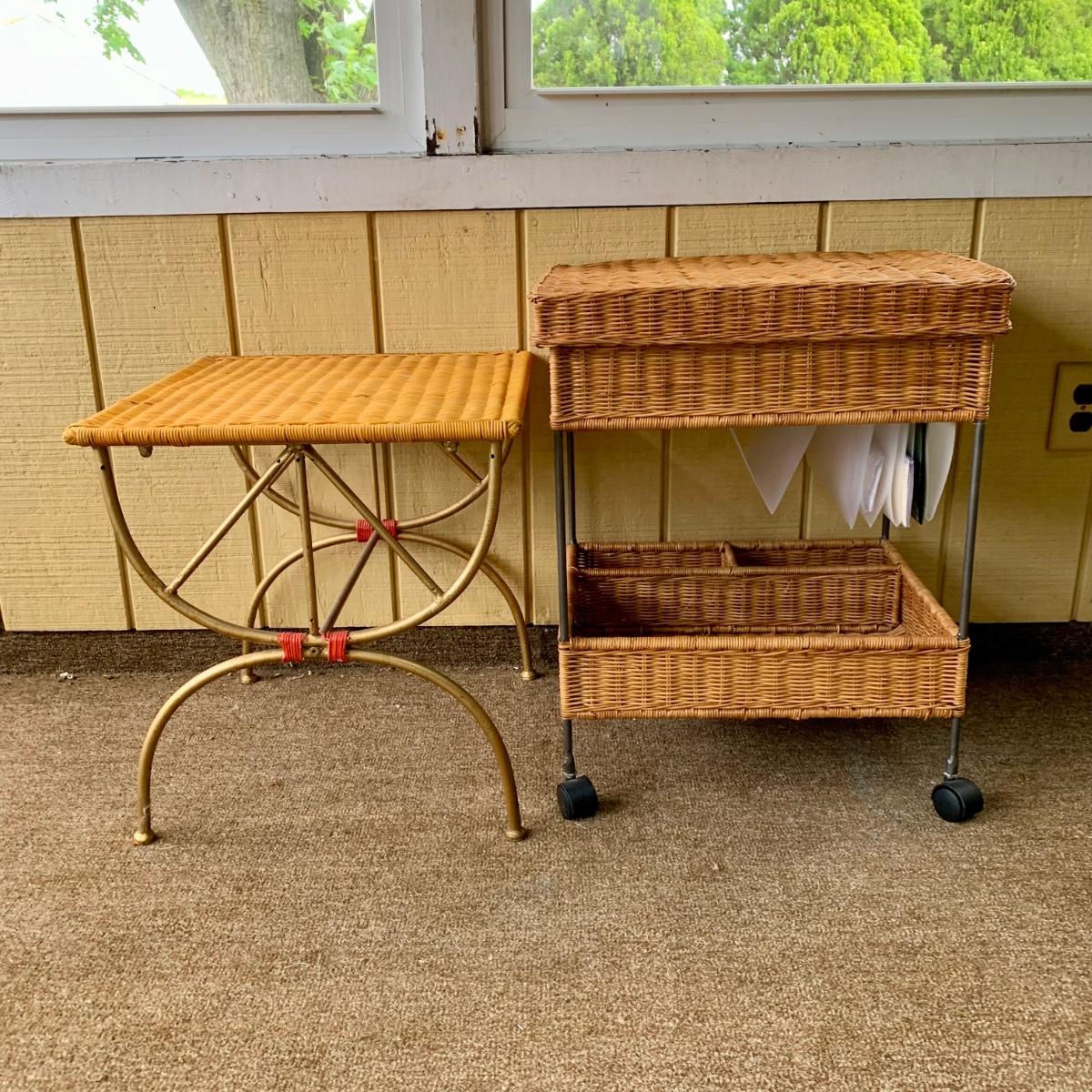 LOT 109 P: Rolling Wicker Filing Cabinet/Desk Organiser W/ Lid & Wicker/Metal Side Table