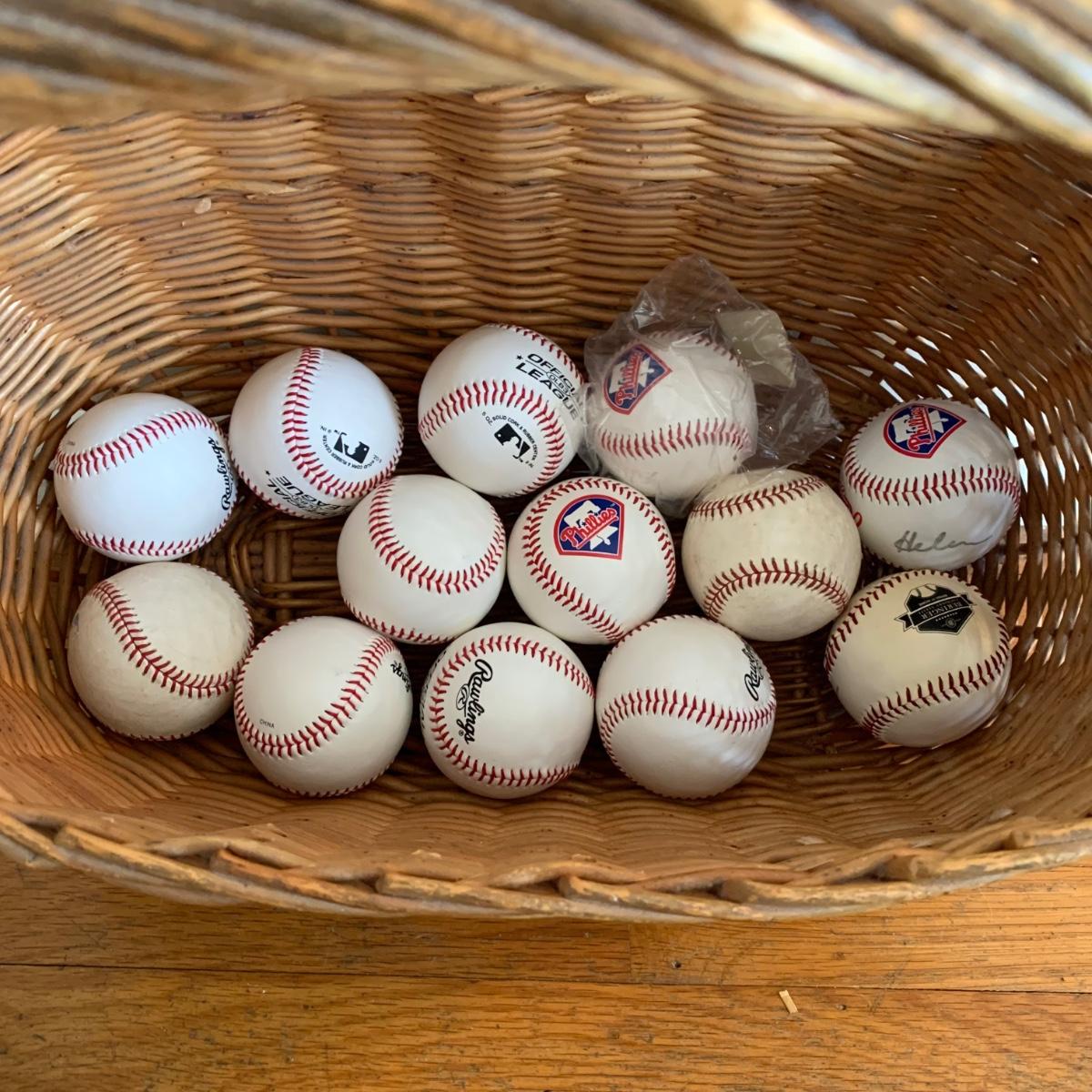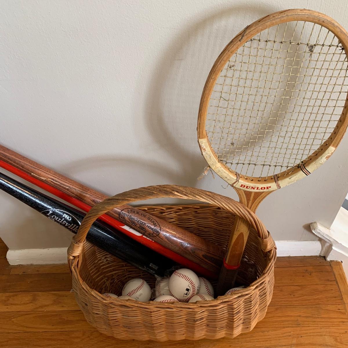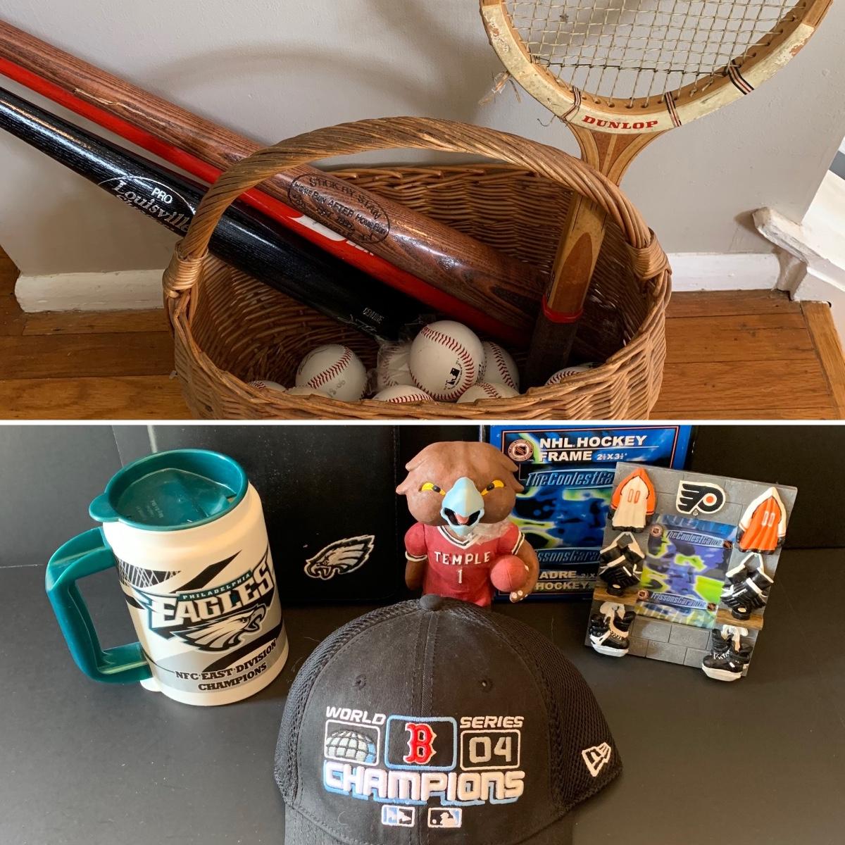 LOT 119 L: Sports Collection: Philadelphia Eagles, Flyers, Boston Red Sox, Temple University Owls, Baseball Bats, Baseballs, & Tennis Racket