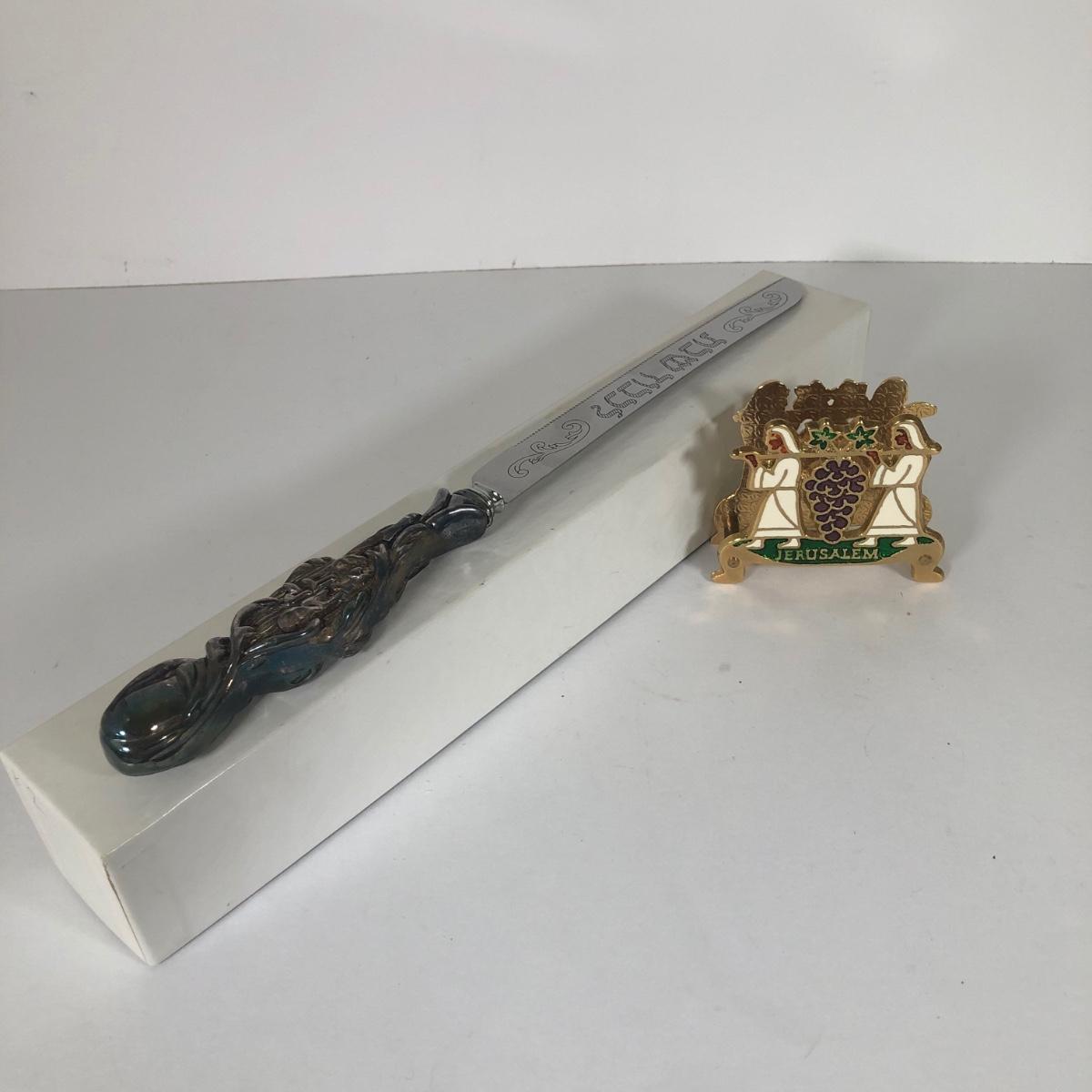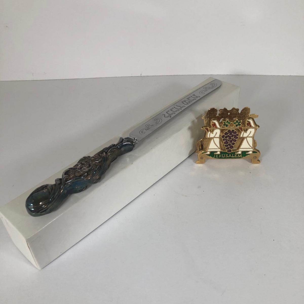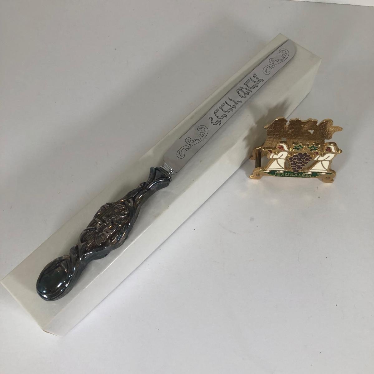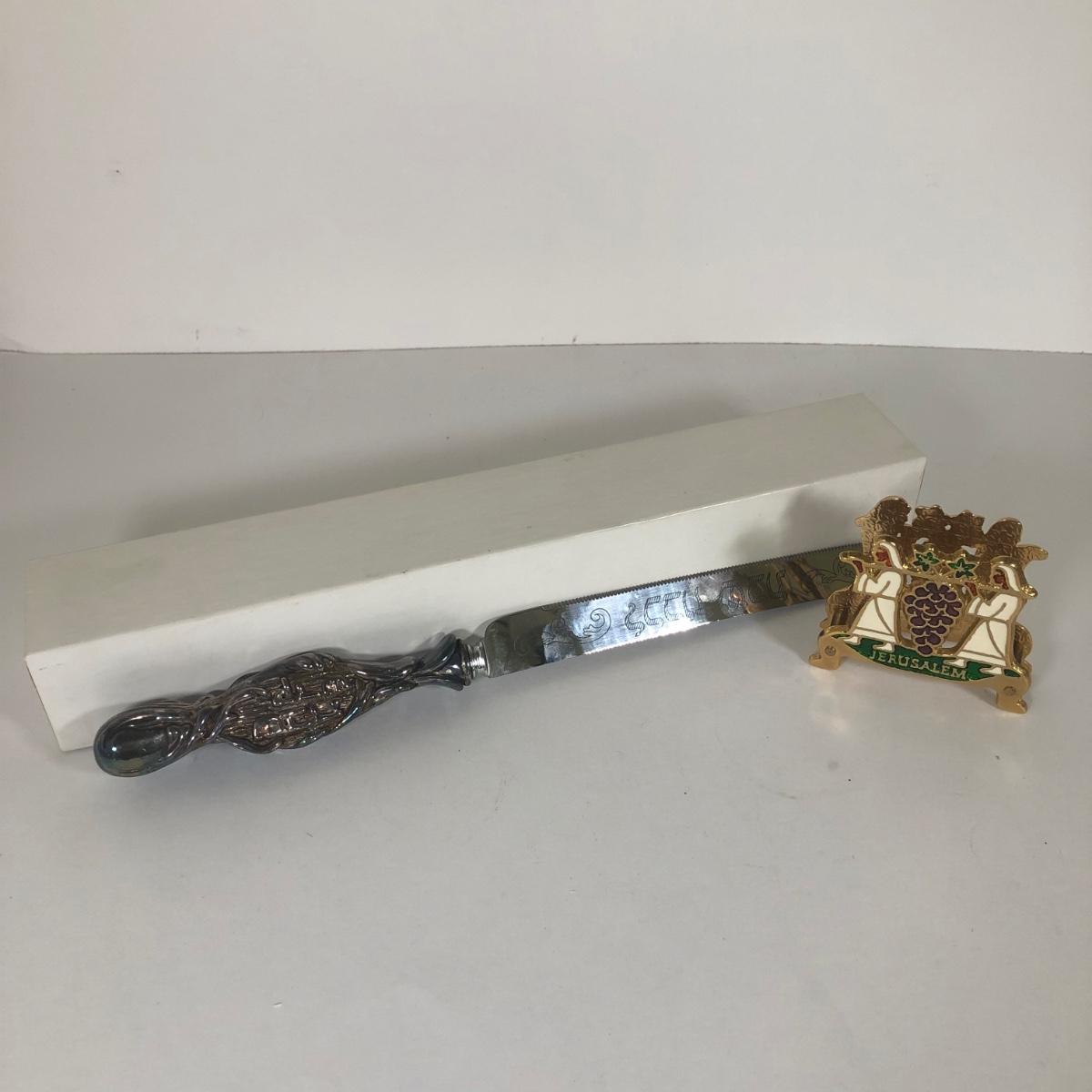 LOT 176L: Vintage Challah Knive 925 Sterling Silver Handle & Brass Jerusalem Napkin Holder