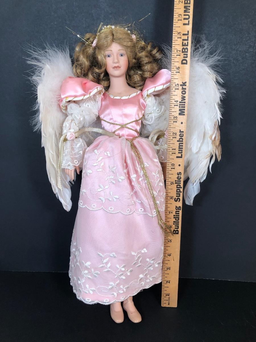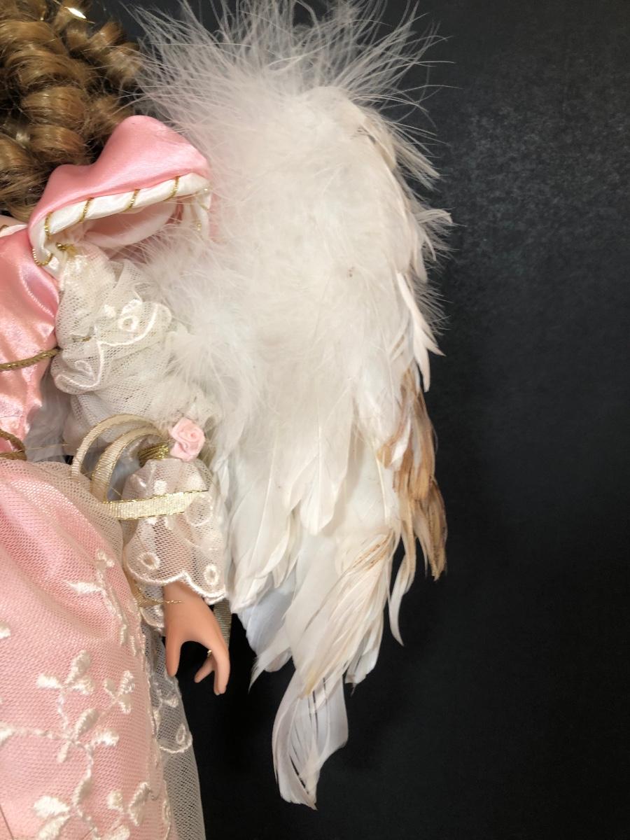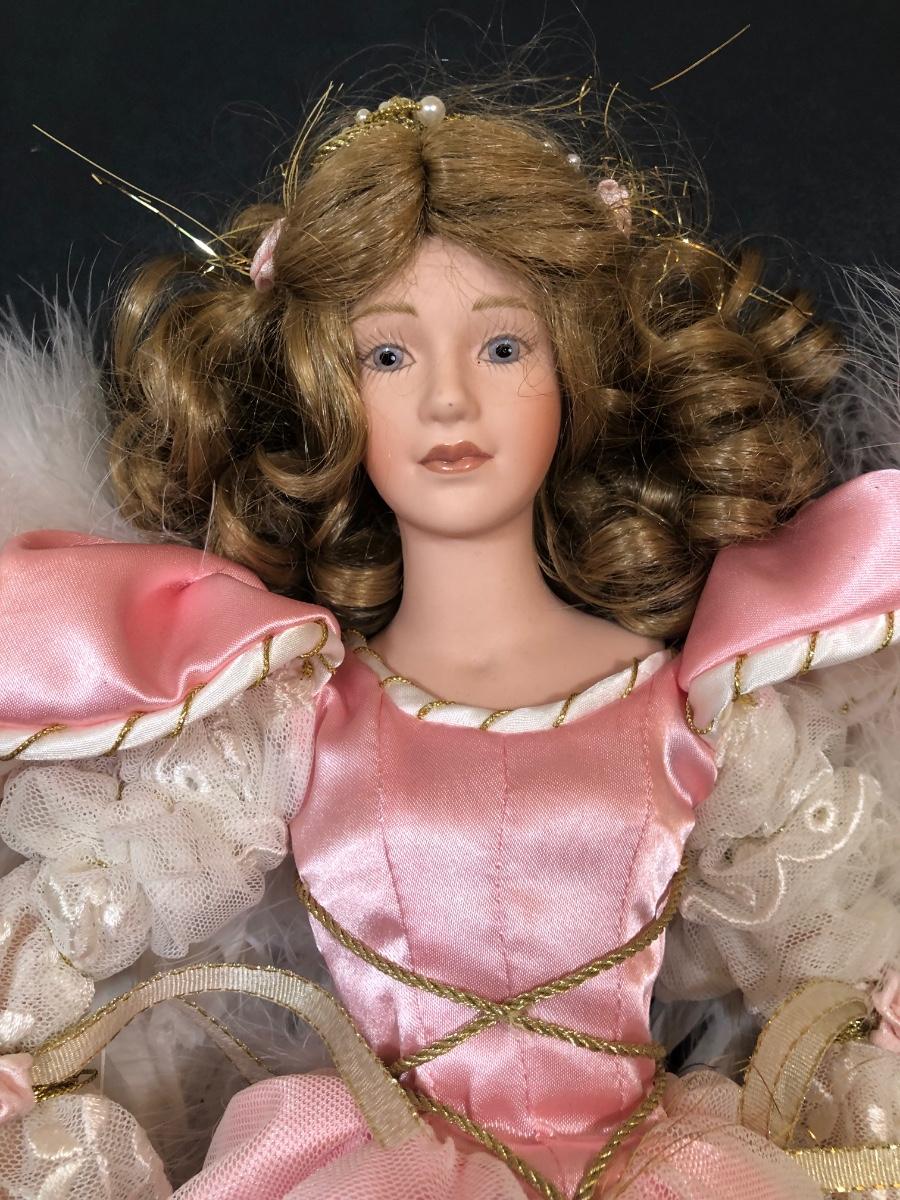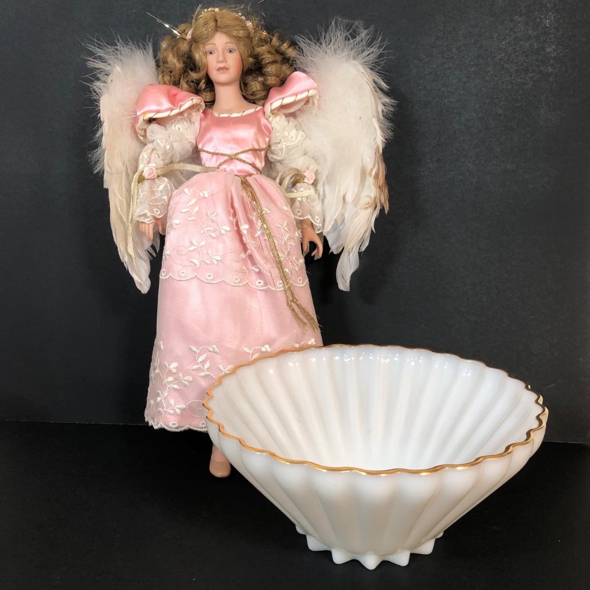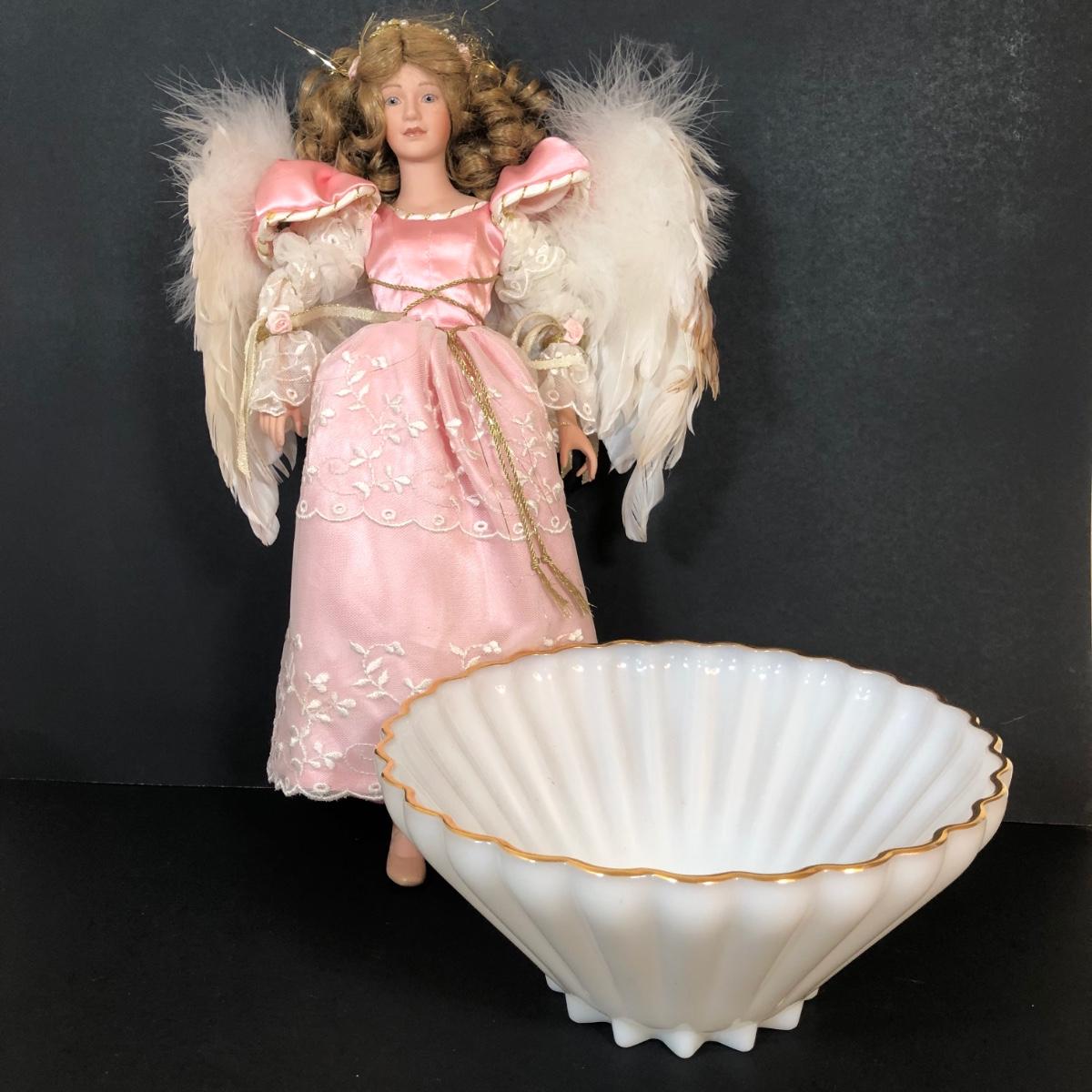 LOT 196L: 1998 Devon Park Studios Lenox Angel Doll in Pink Dress w/ Milk Glass Ribbed Bowl