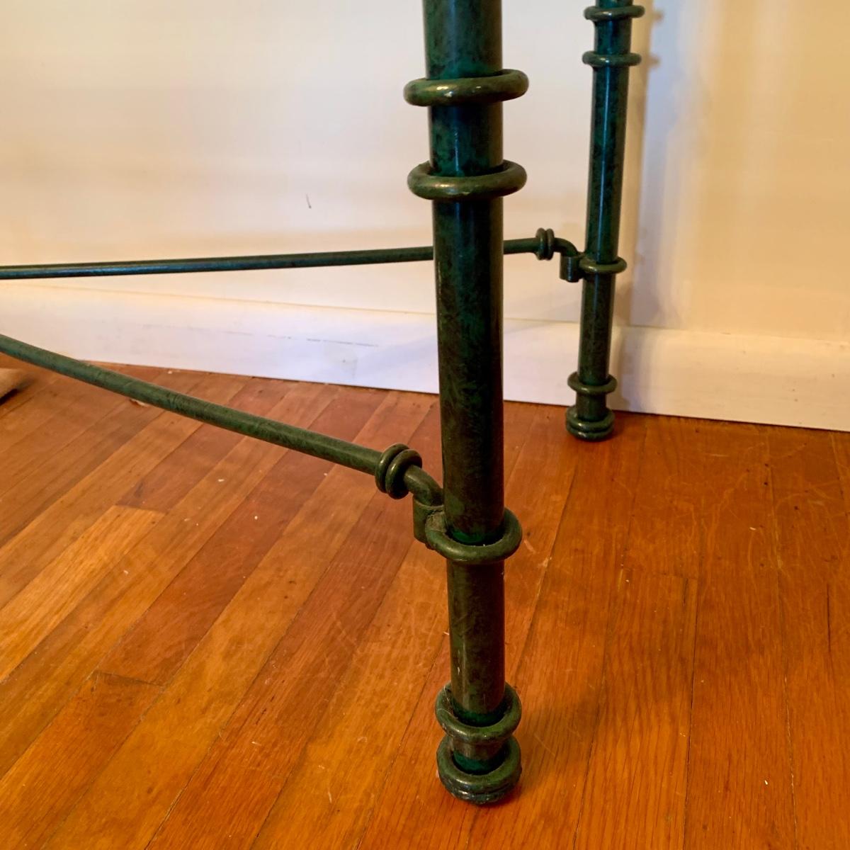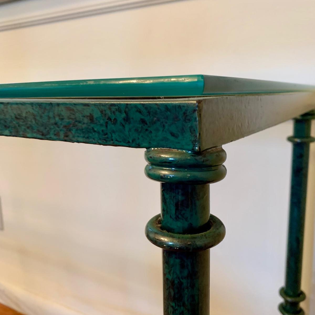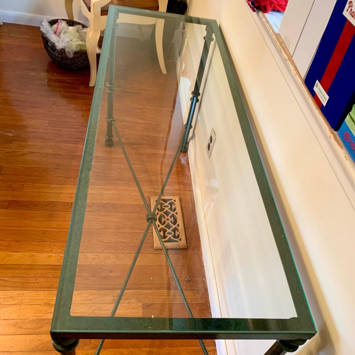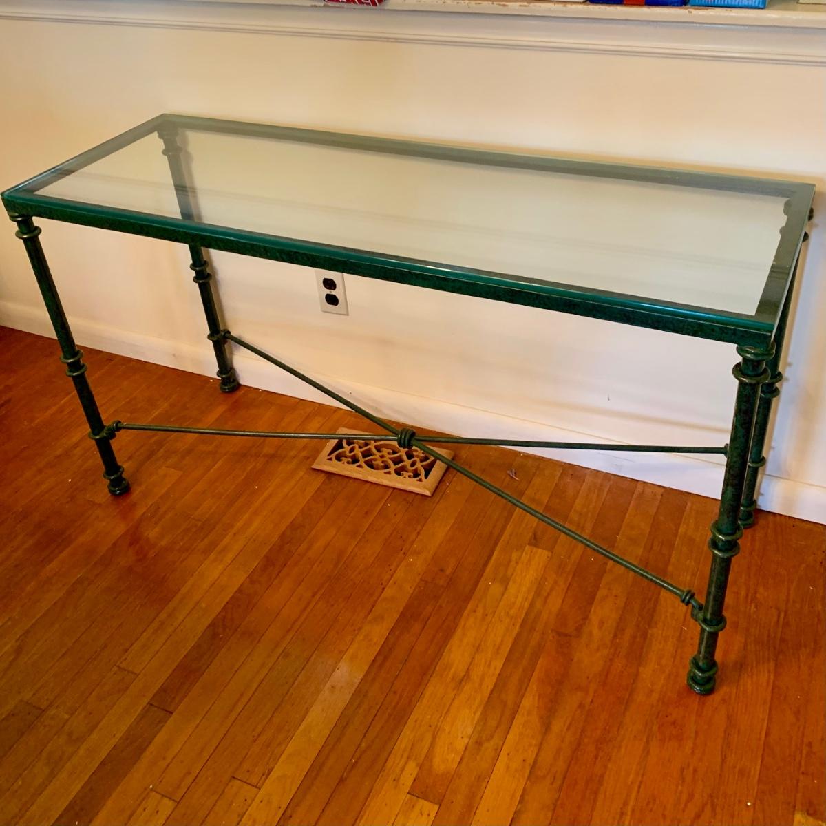 LOT 208 K: Vintage 1980's Post Modern Thick Glass Top W/Metal Base Console Table