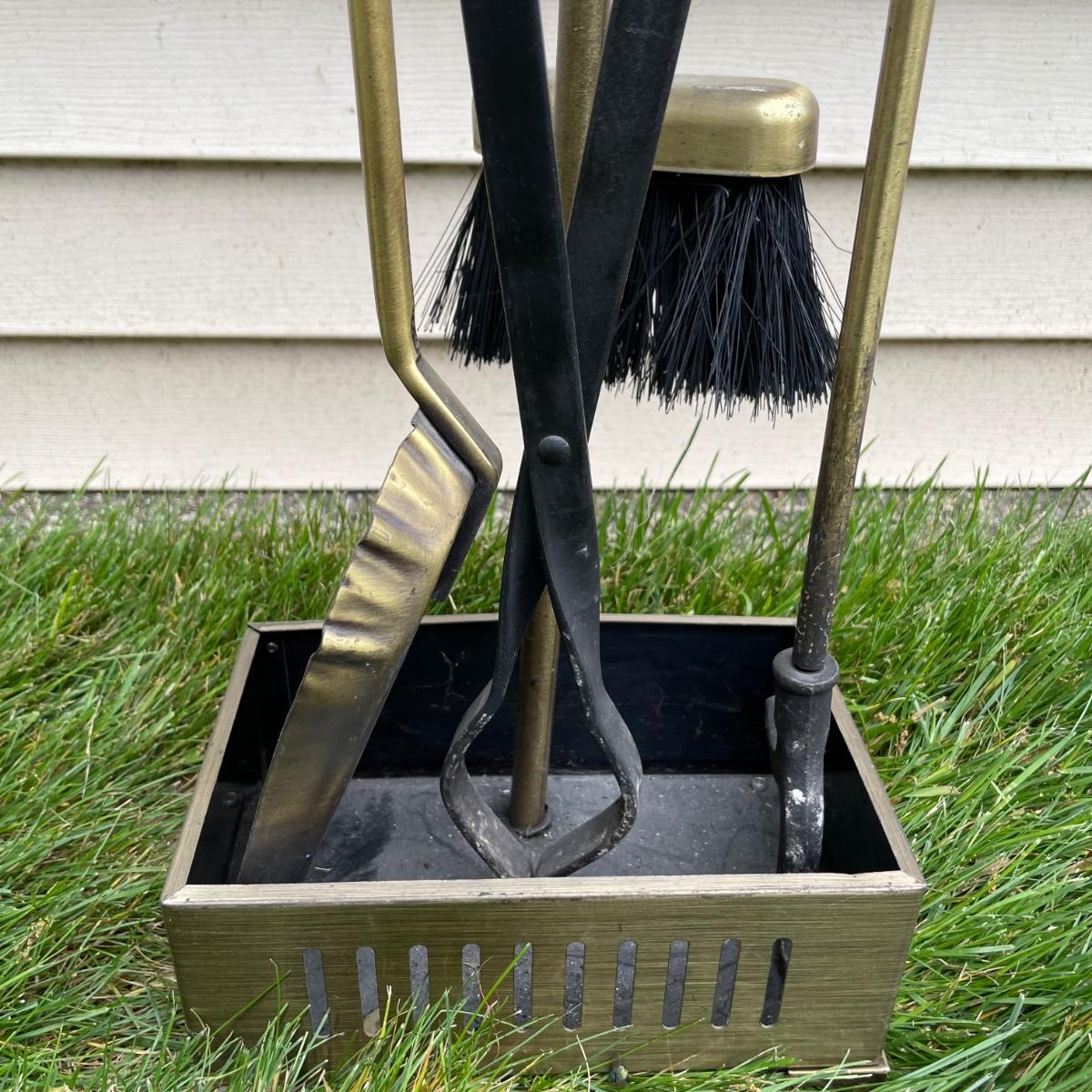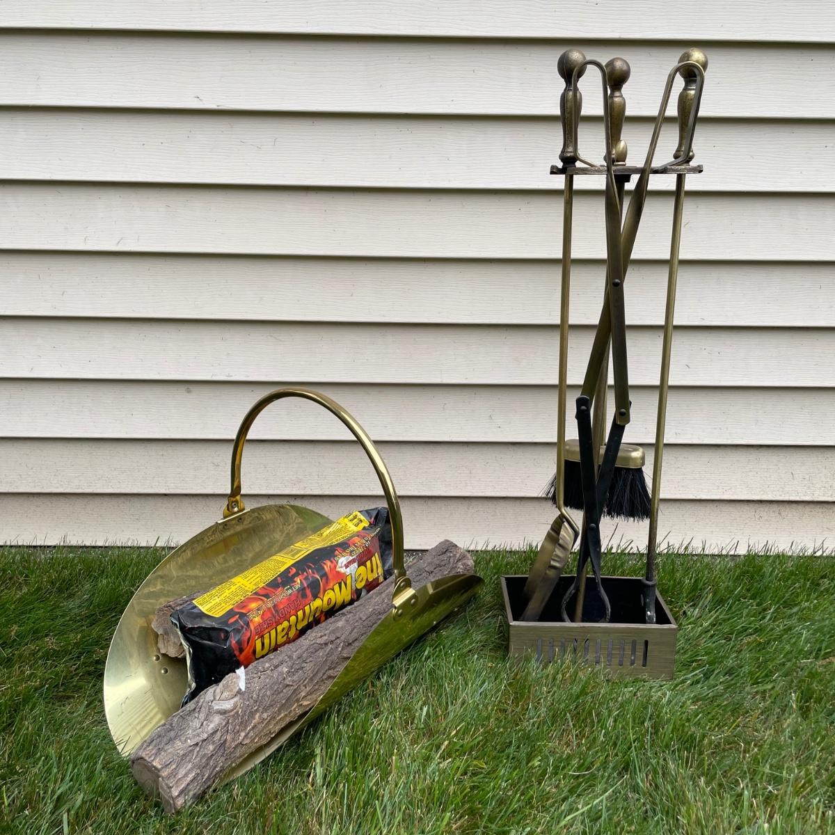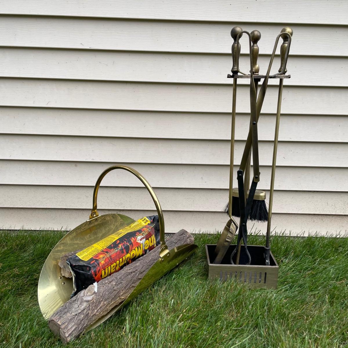 LOT 17L: Vintage Brass Fireplace Tools & Fire Wood Holder