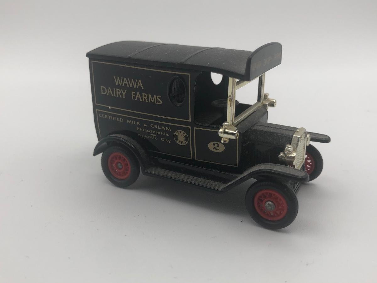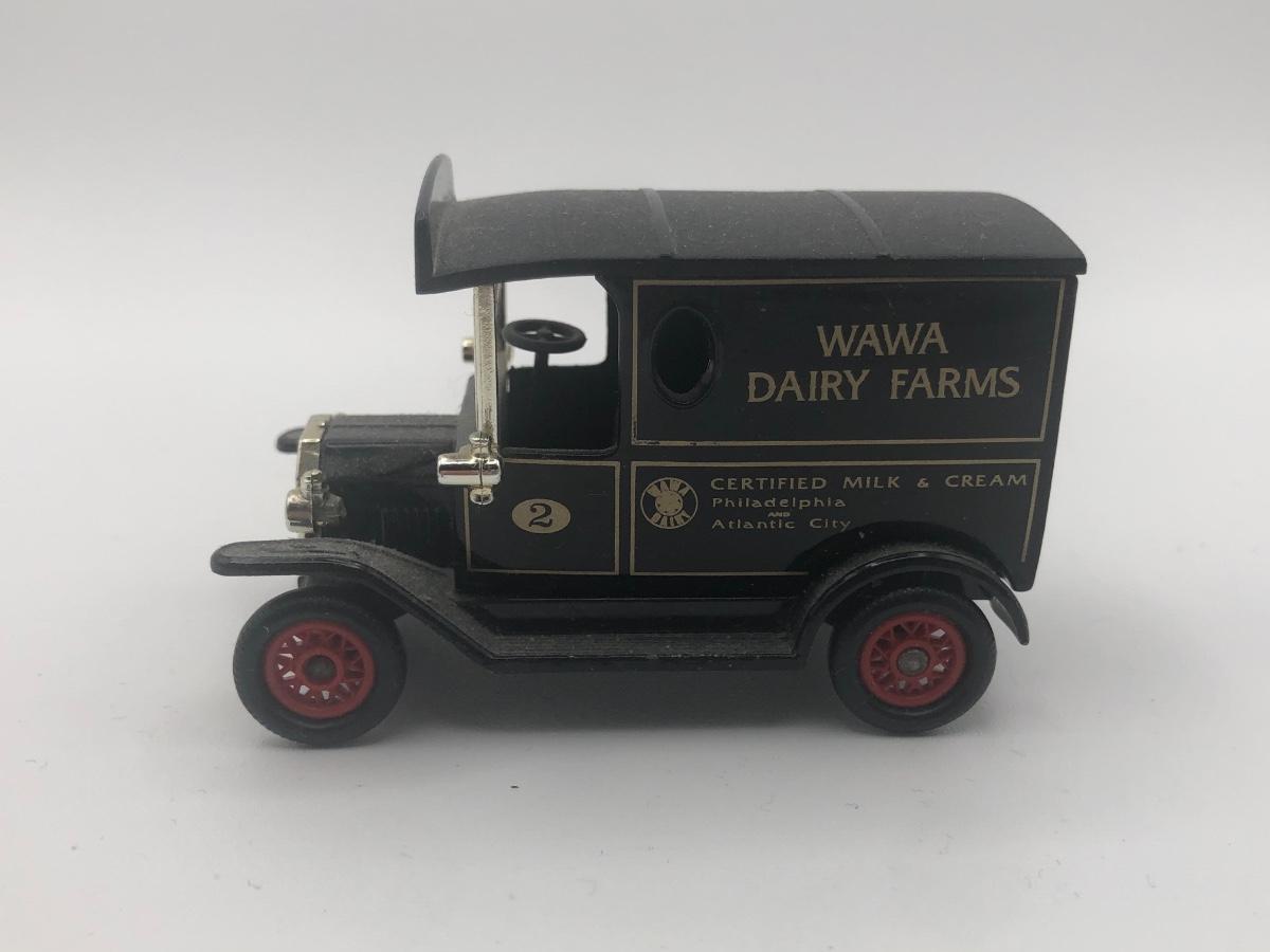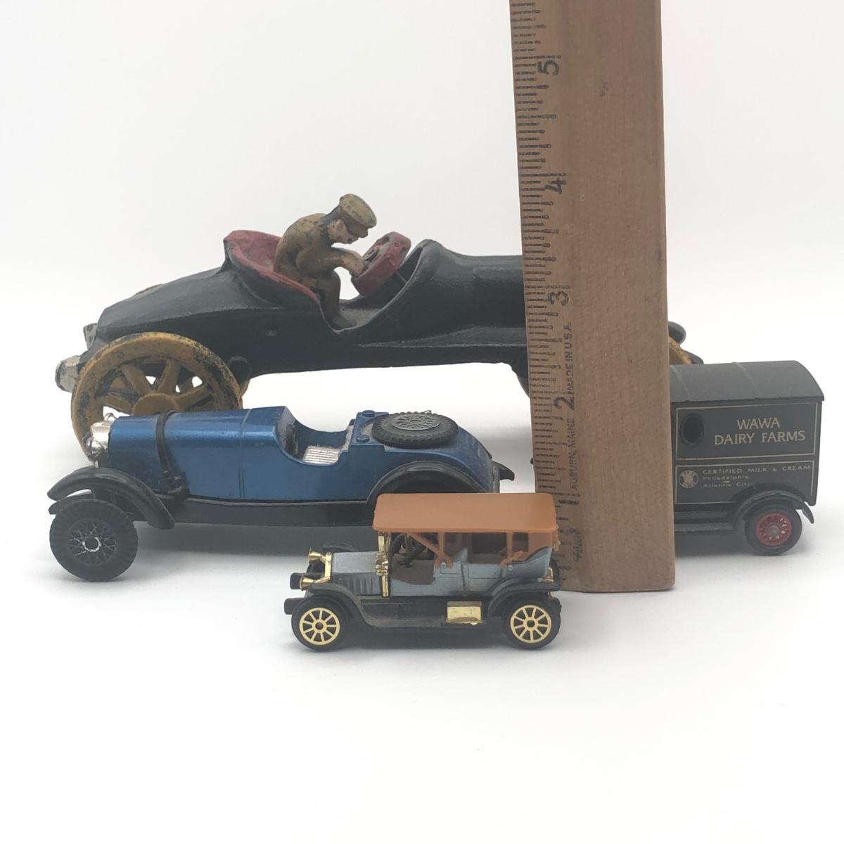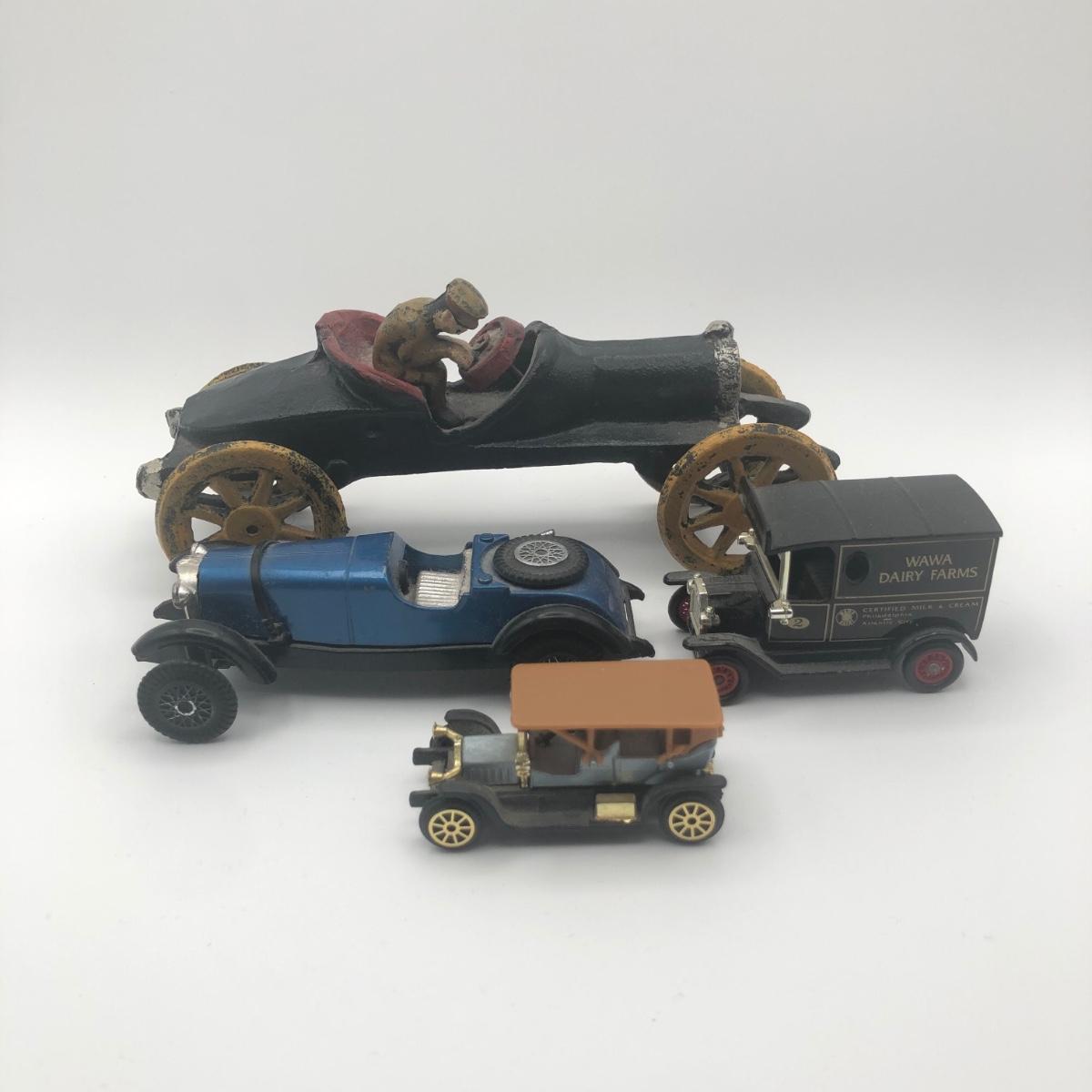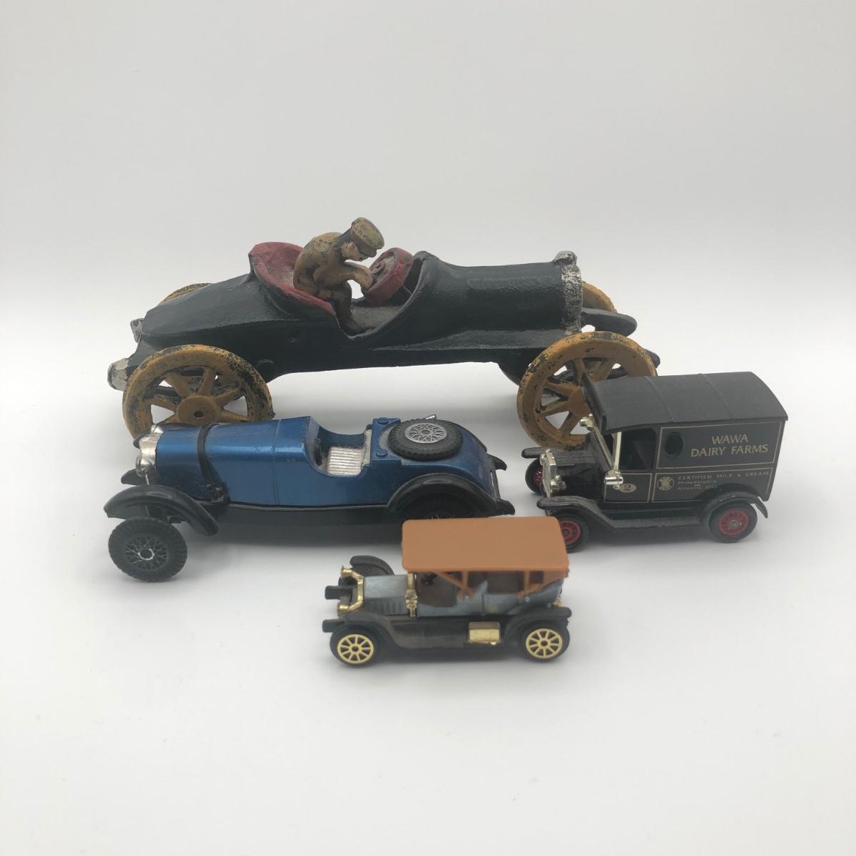 LOT 28L: Reproduction Cast Iron Boat Tail Race Car, Blue Mercedes Benz Model, Lledo 1995 Wawa Dairy Farms Delivery Truck & More