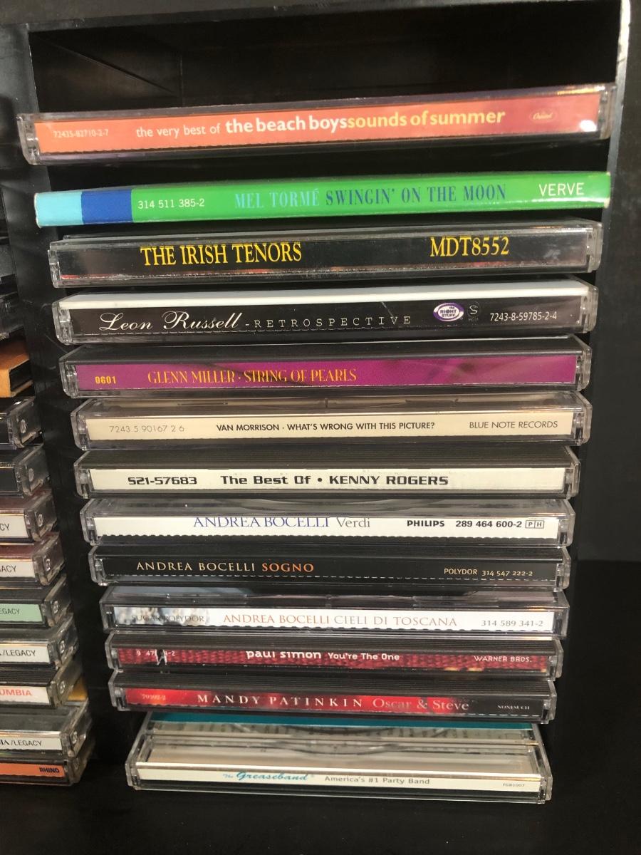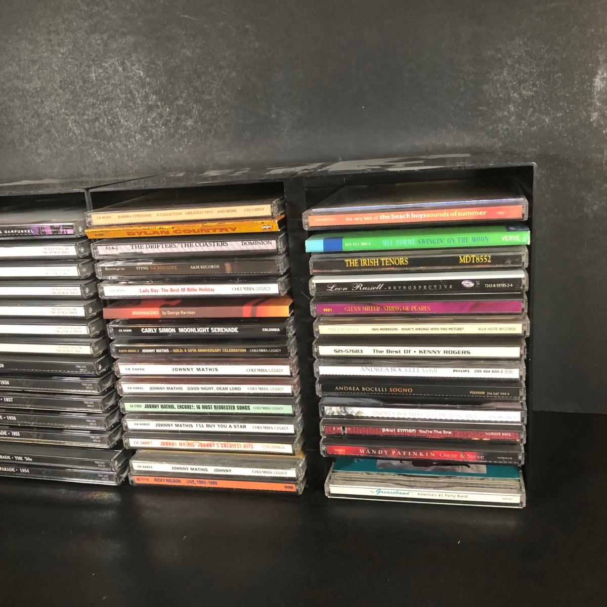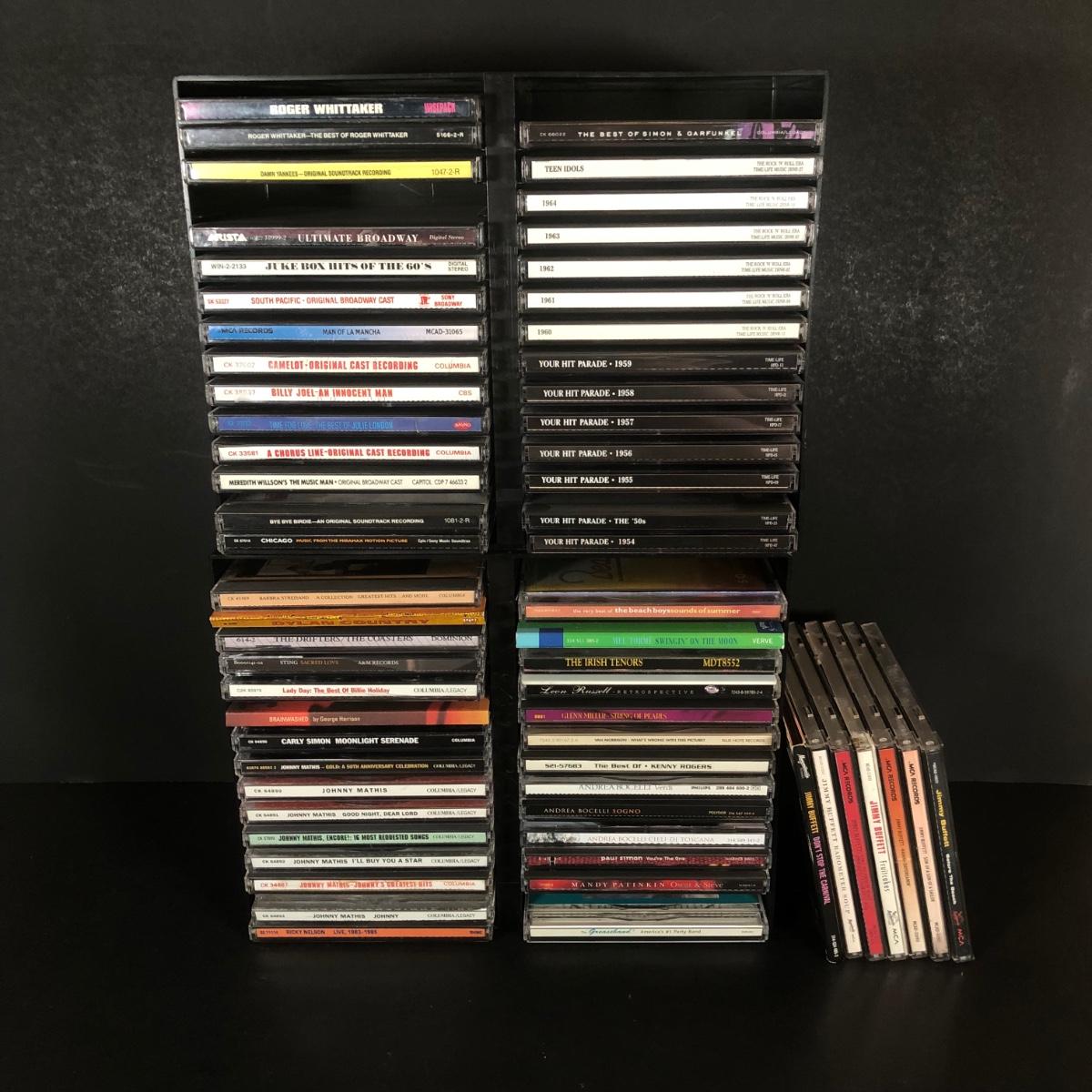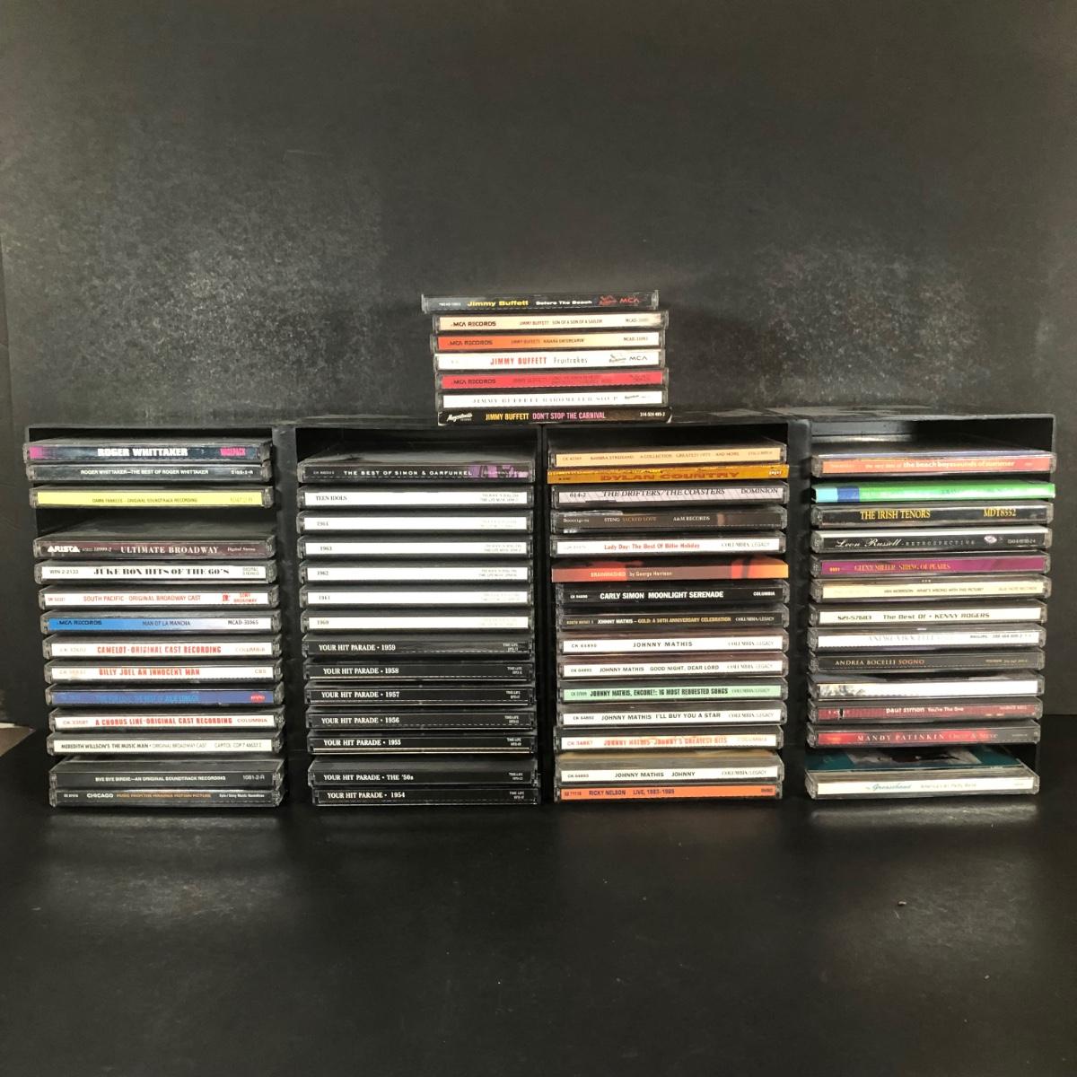 LOT 39L: Collection of CDs w/ 2 CD Racks - Jimmy Buffett, Andrea Bocceli, Johnny Mathis & More