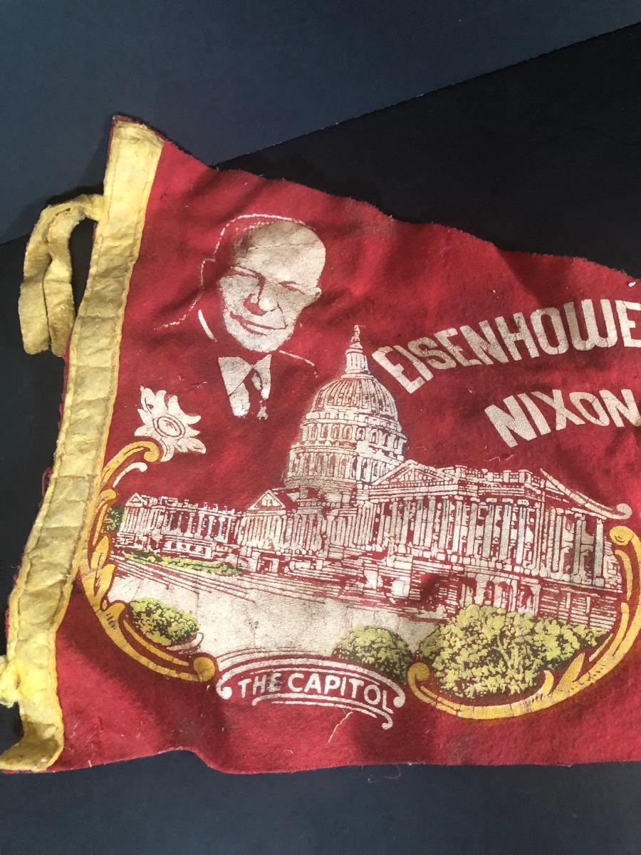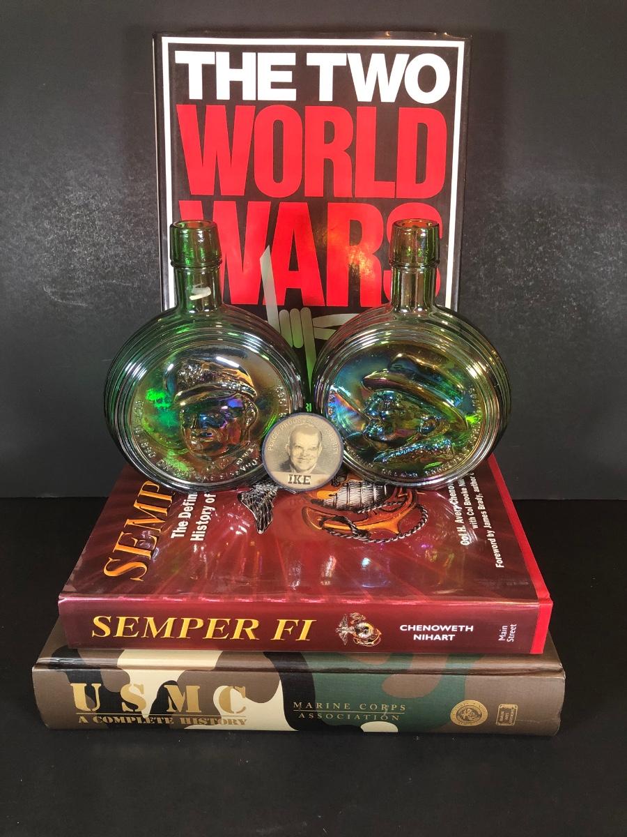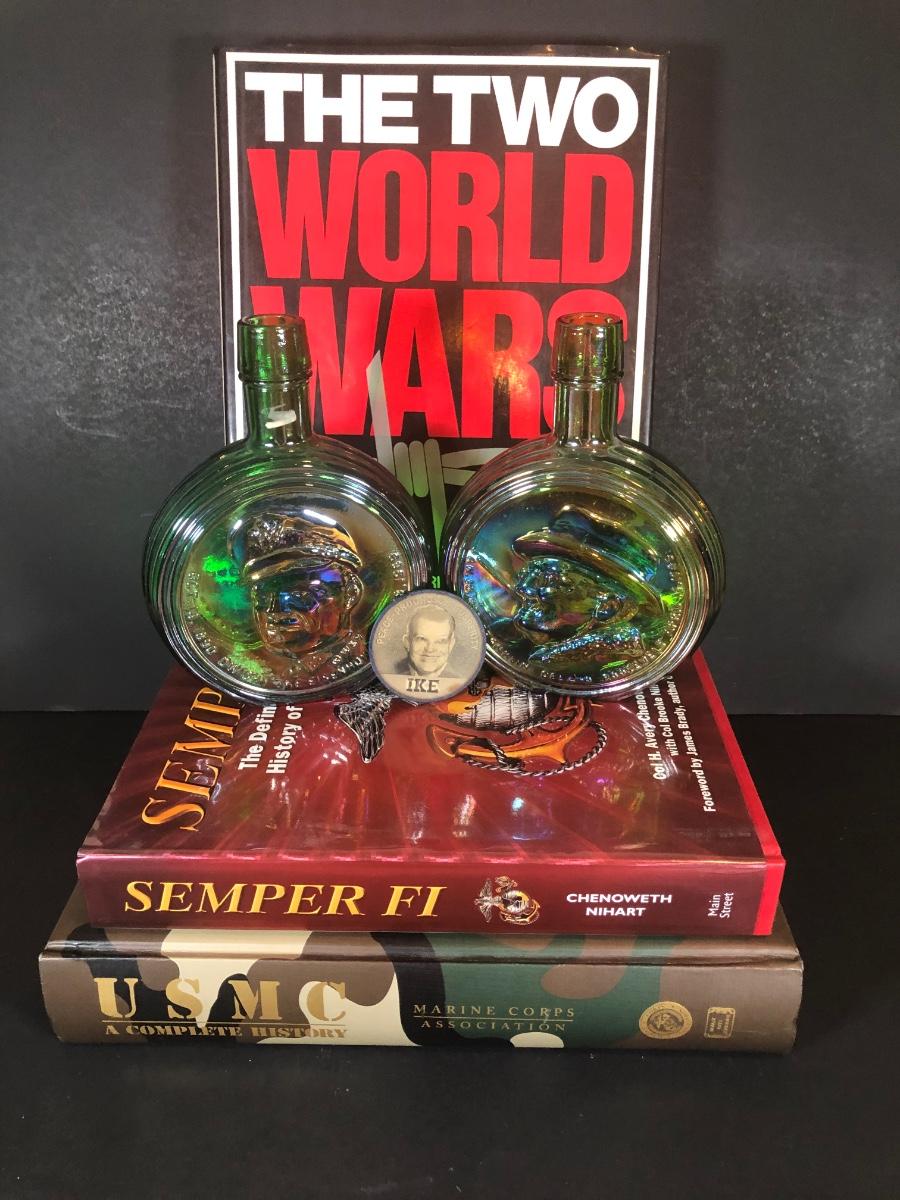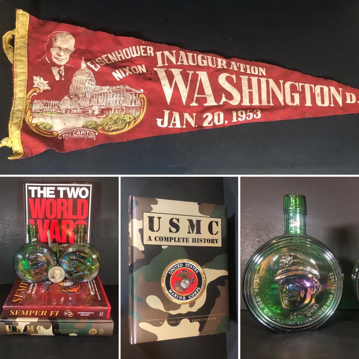 LOT 43L: Dwight Eisenhower First Edition Wheaton Bottle, Franklin Roosevelt First Edition Wheaton Bottle, Eisenhower / Nixon 1953 Inauguration Pennant, USMC History Book & More