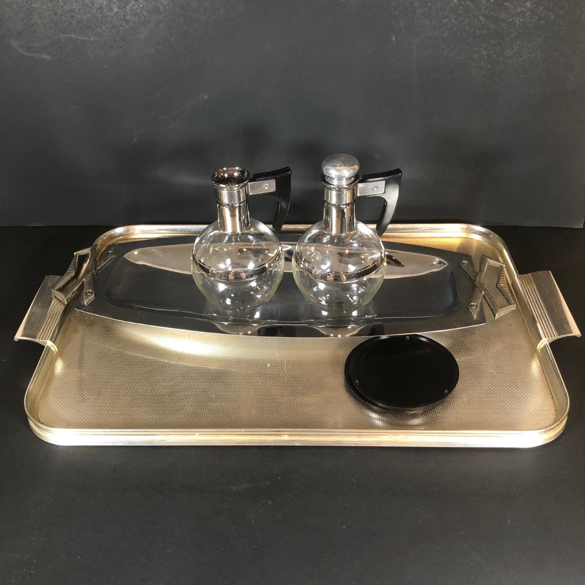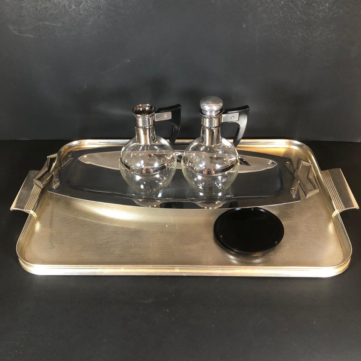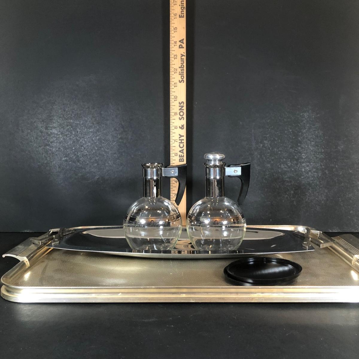 LOT 45L: Woodmet Metal Tray, Inland Glass Works Carafes in Box & More