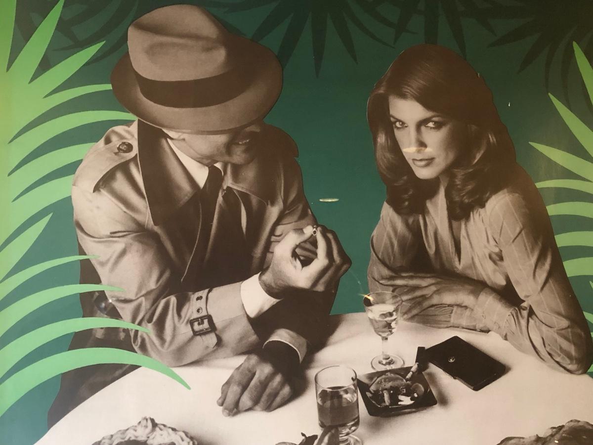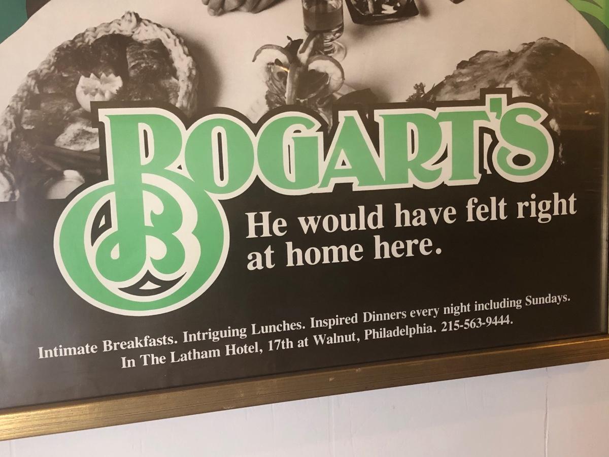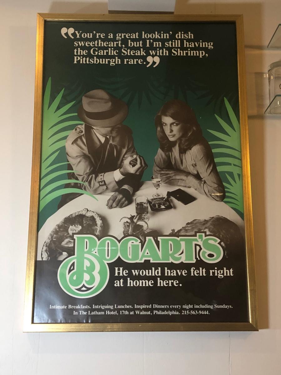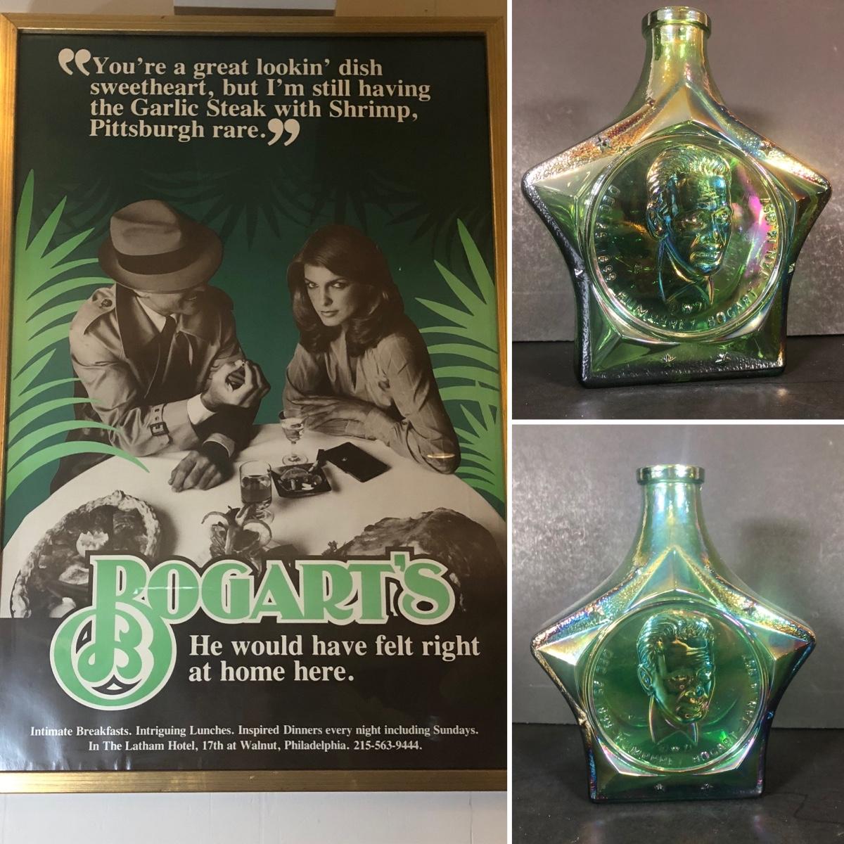 LOT 46L: Vintage Framed Bogart's Restaurant Philadelphia Poster w/ Humphrey Bogart Wheaton Bottles