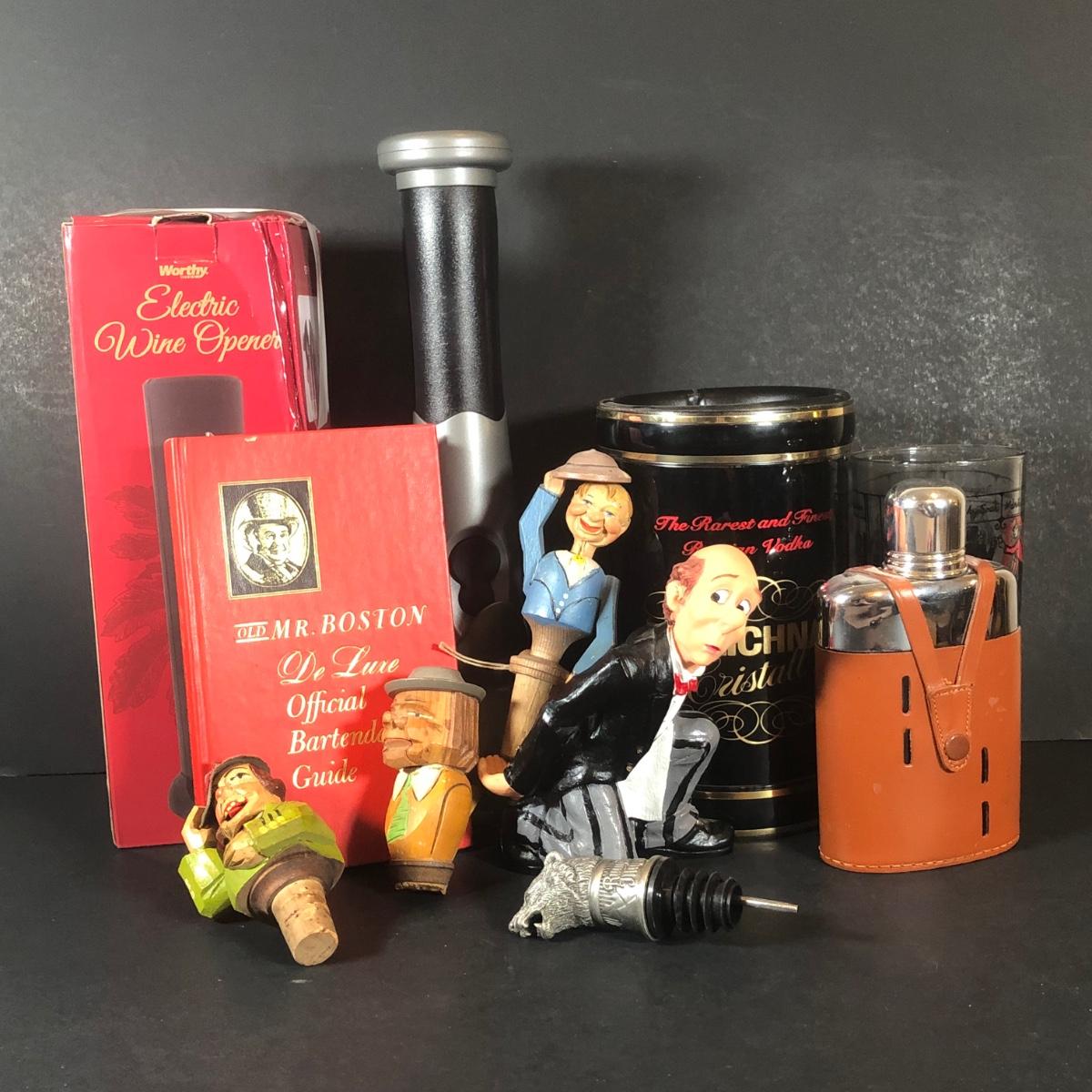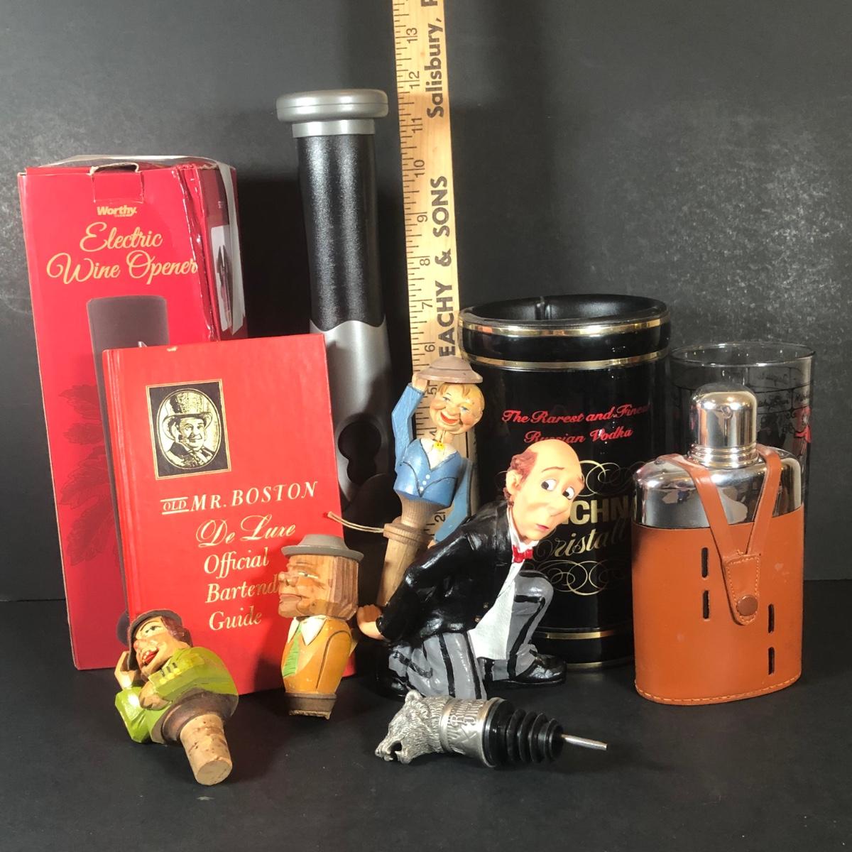 LOT 51L: Vintage & Modern Bar Collection: Wooden Spouts / Stoppers, Bartender's Guide, Electric Wine Openers & More
