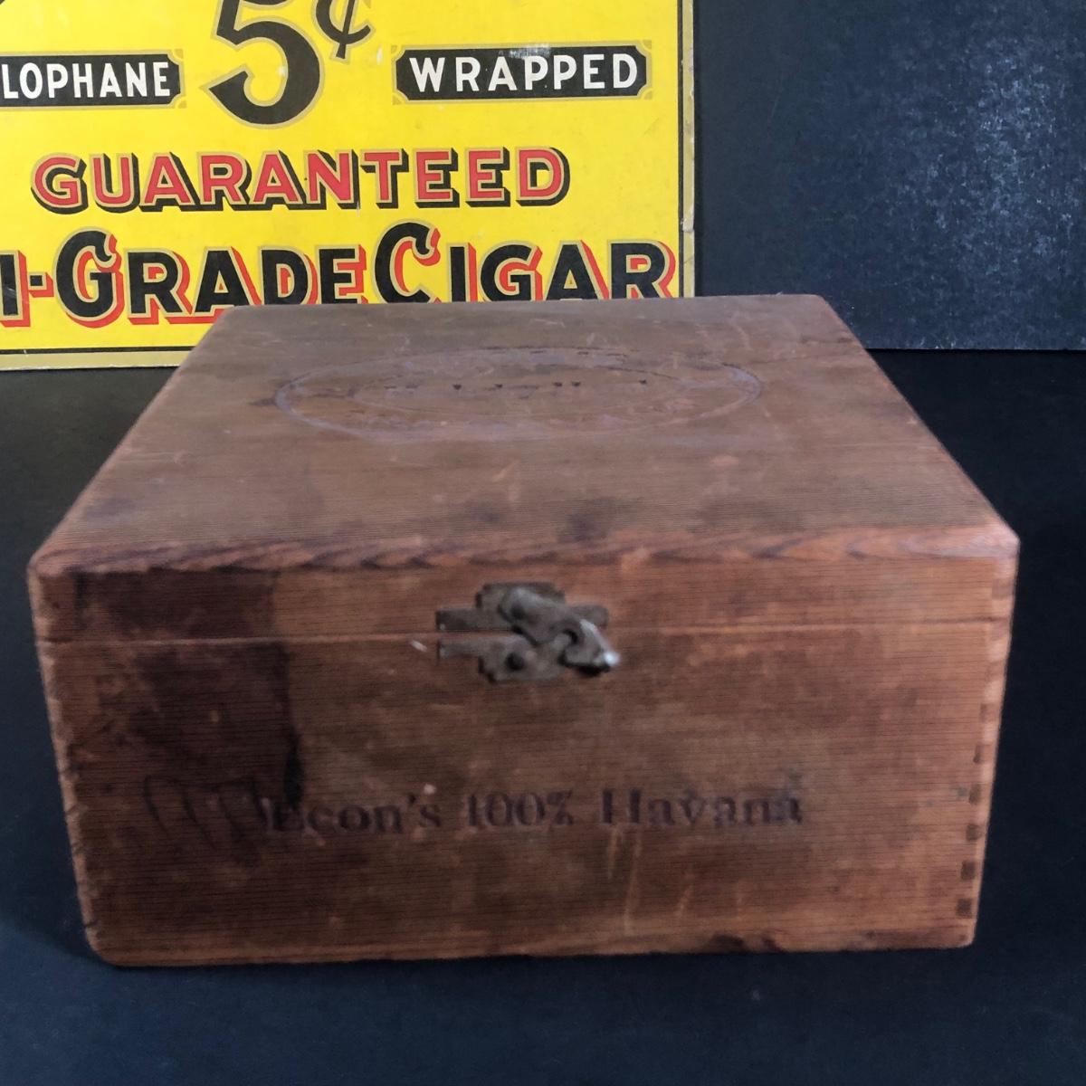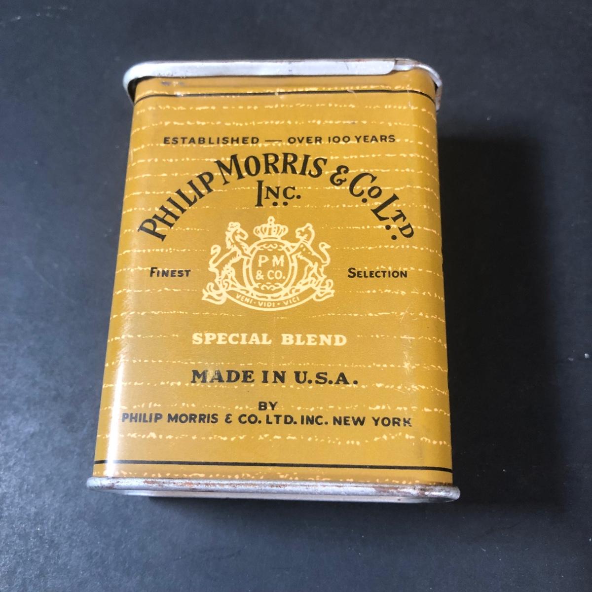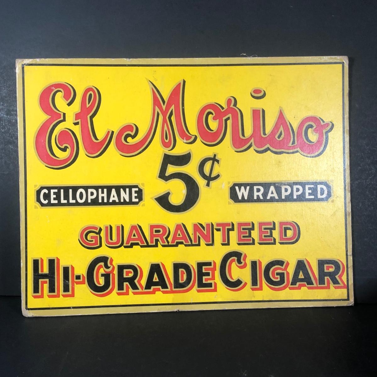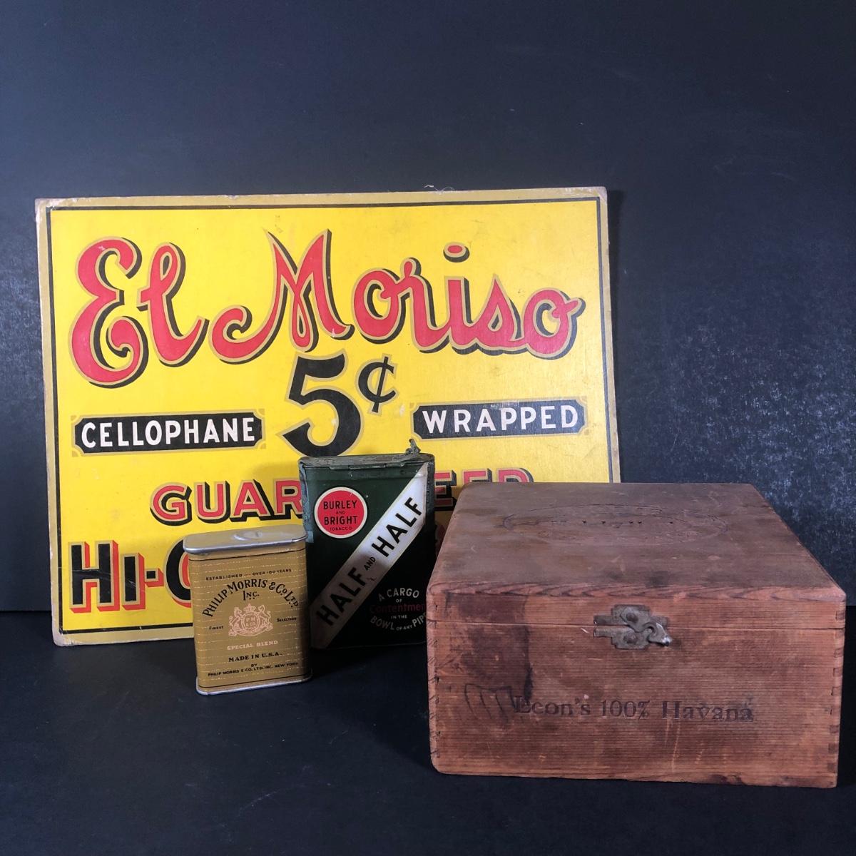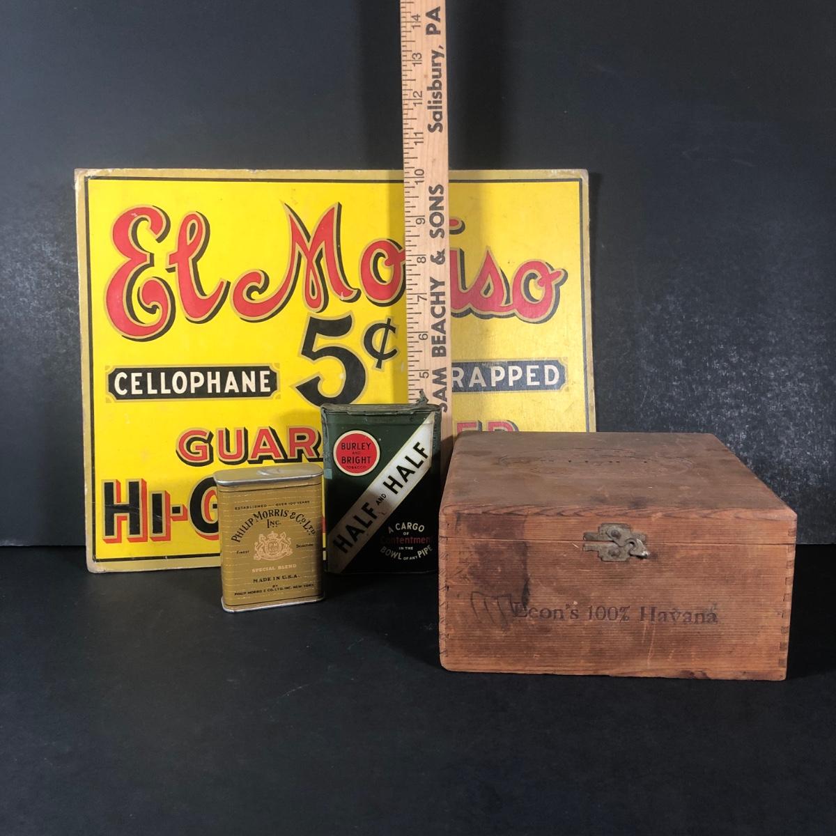 LOT 56L: Vintage Tobacco Collection: El Moriso Sign, Wooden Box, Burley and Bright Tin & Philip Morris & Co Ltd Inc Tin