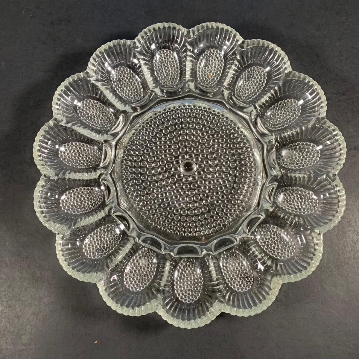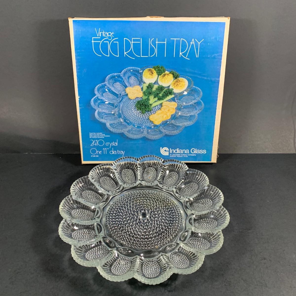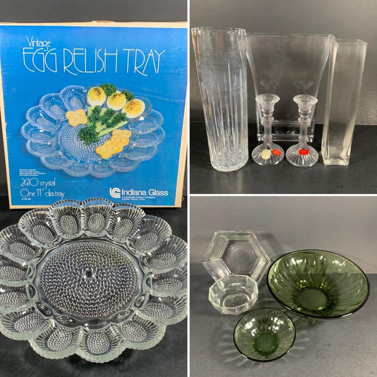 LOT 95 B: Vintage Indiana Glass Egg Relish Tray, Lenox Crystal Candlestick Holders, Hazel Atlas Avocado Green Chip & Dip Bowls, & More