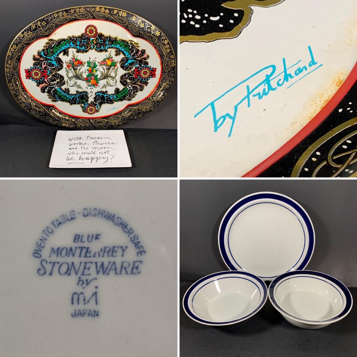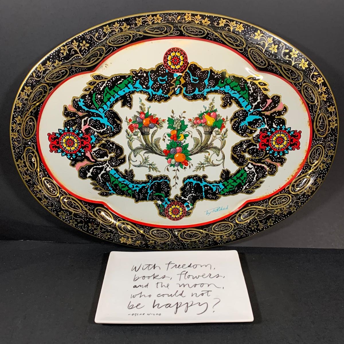 LOT 99 B: Daher Decorated Ware by Pritchard Tin Serving Tray, Blue Monterrey Stoneware by MI Serving Bowls, & Fringe Dish W/ Oscar Wilde Quote
