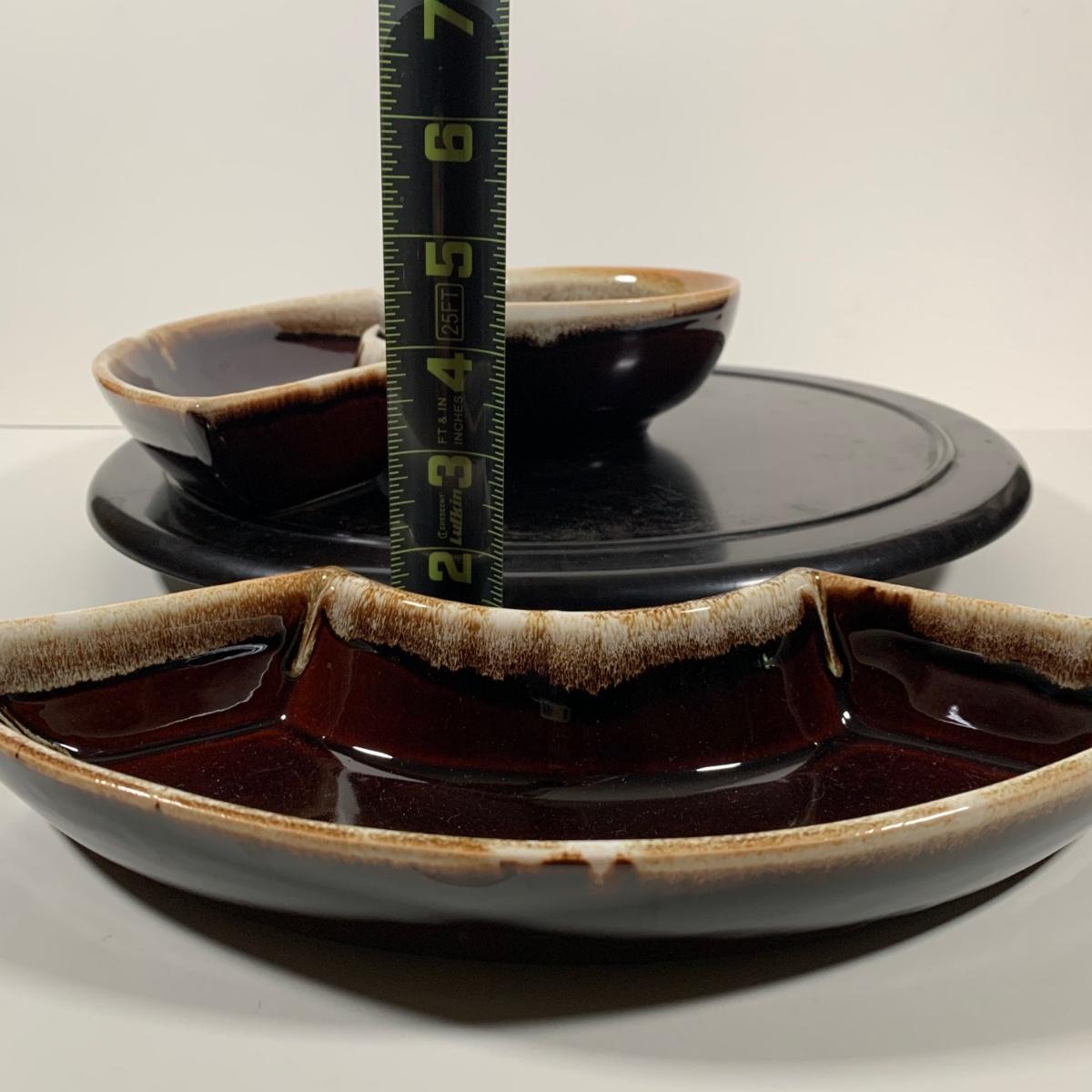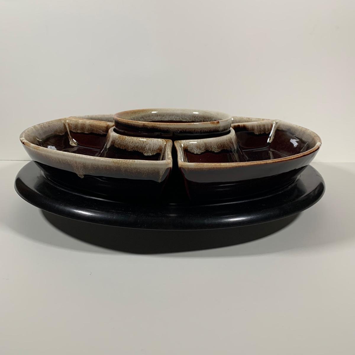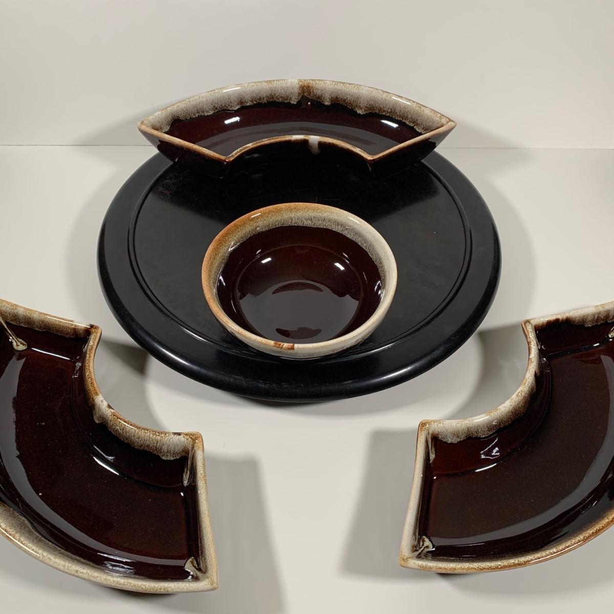 LOT 100 B: Vintage Pfaltzgraff Brown Drip Ceramic Veggie/Chip & Dip 4 Piece Set W/ Lazy Susan Stand, Tastefully Simple Crock/Casserole Baking Dip Dish W/ Lid & Wire Caddy, & More