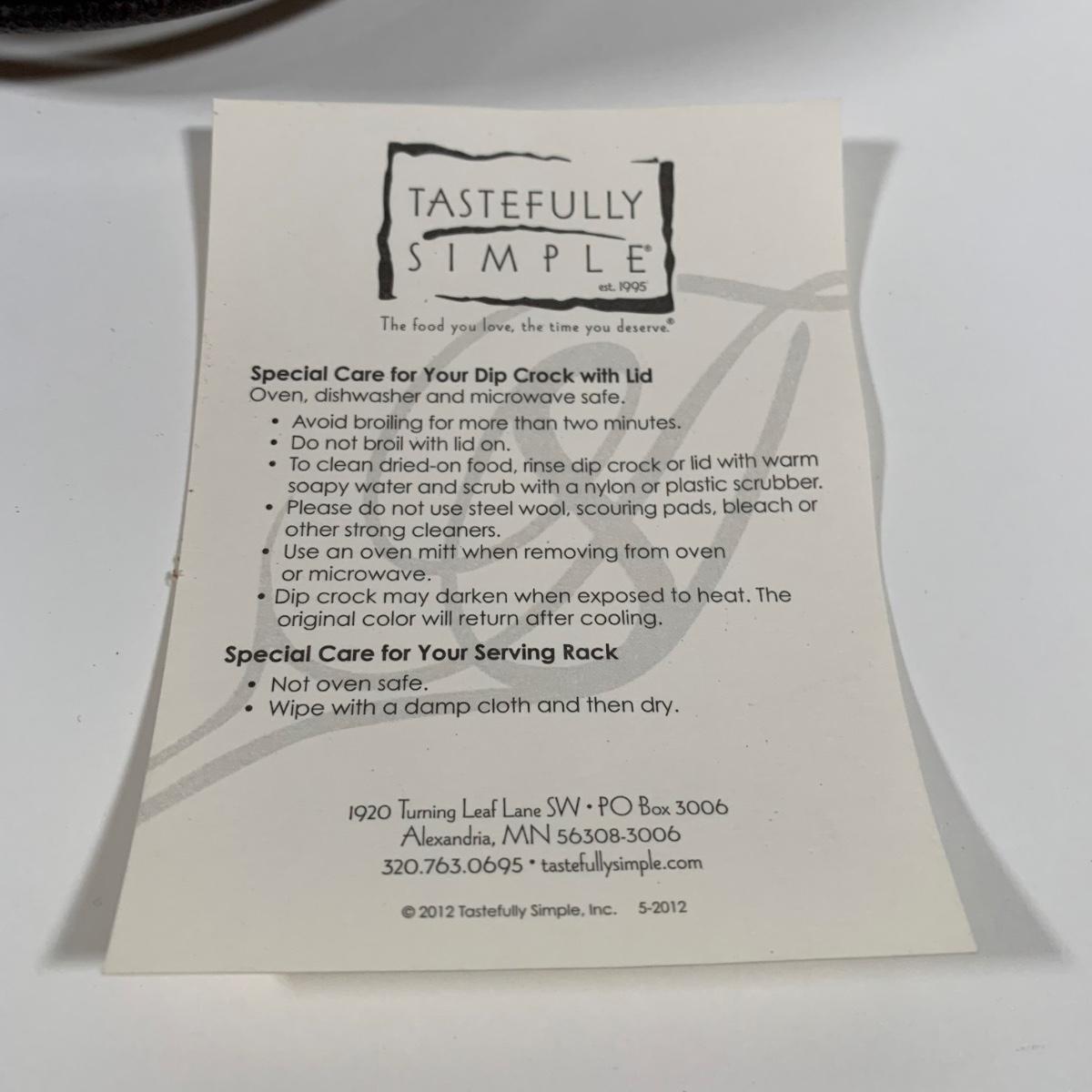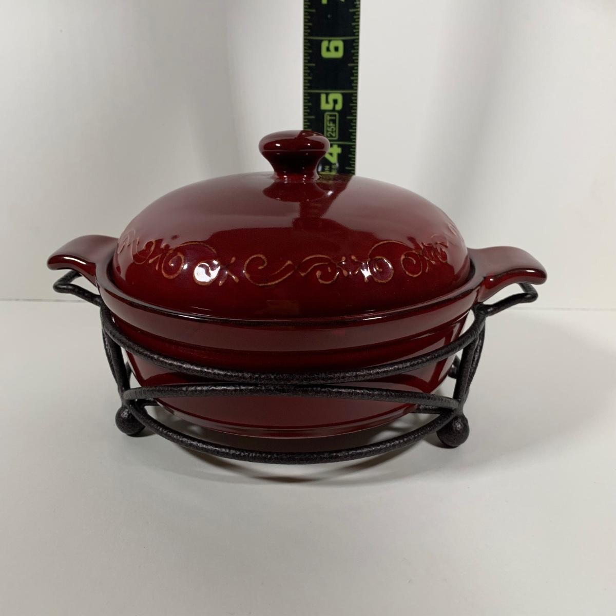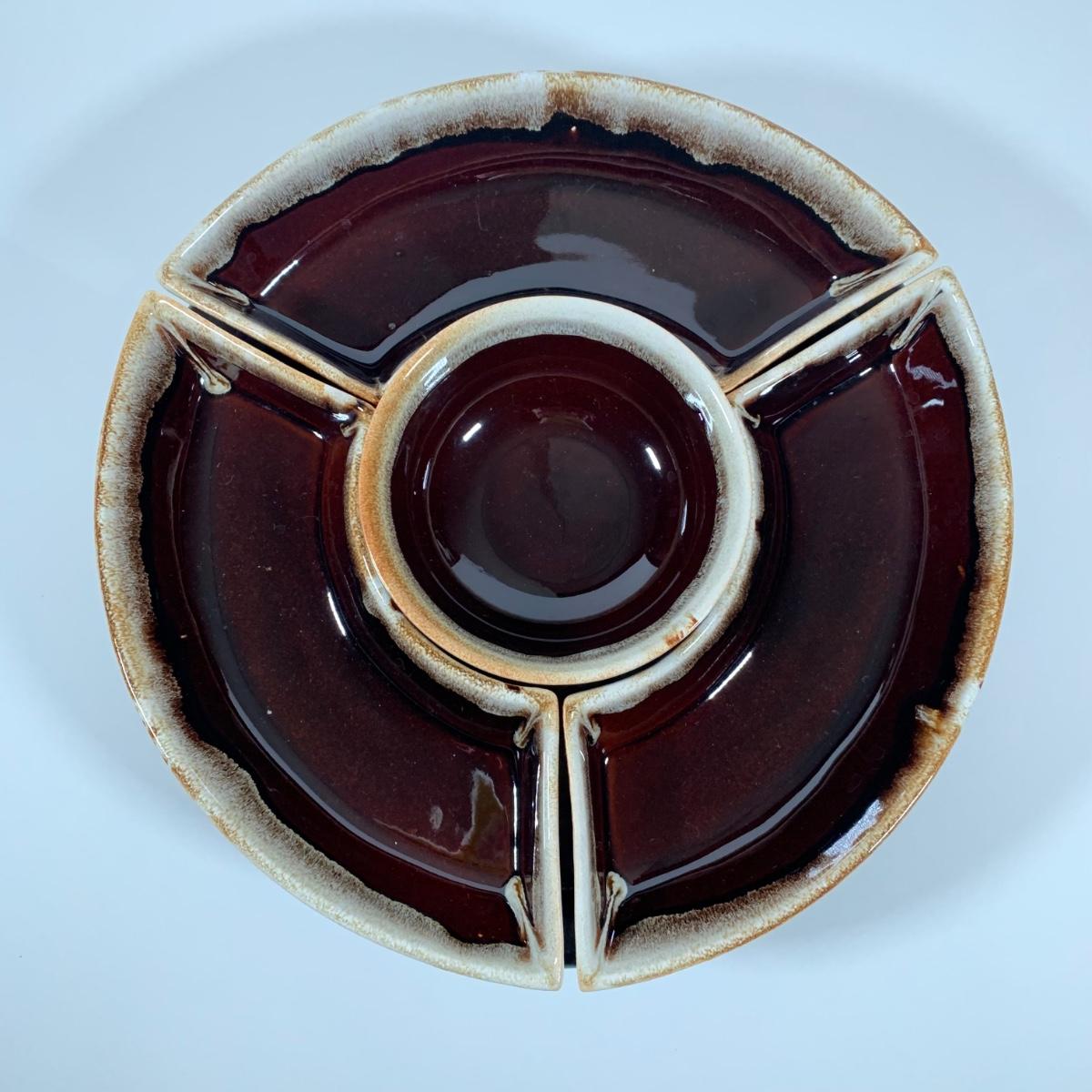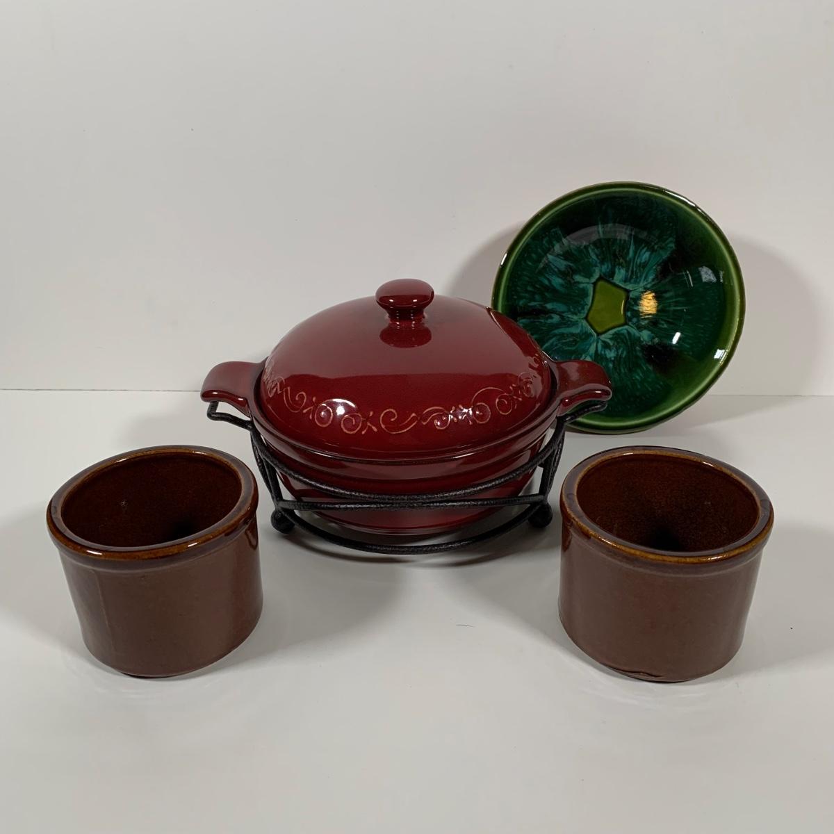 LOT 100 B: Vintage Pfaltzgraff Brown Drip Ceramic Veggie/Chip & Dip 4 Piece Set W/ Lazy Susan Stand, Tastefully Simple Crock/Casserole Baking Dip Dish W/ Lid & Wire Caddy, & More
