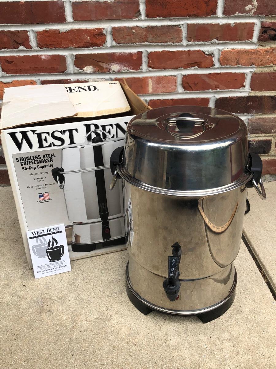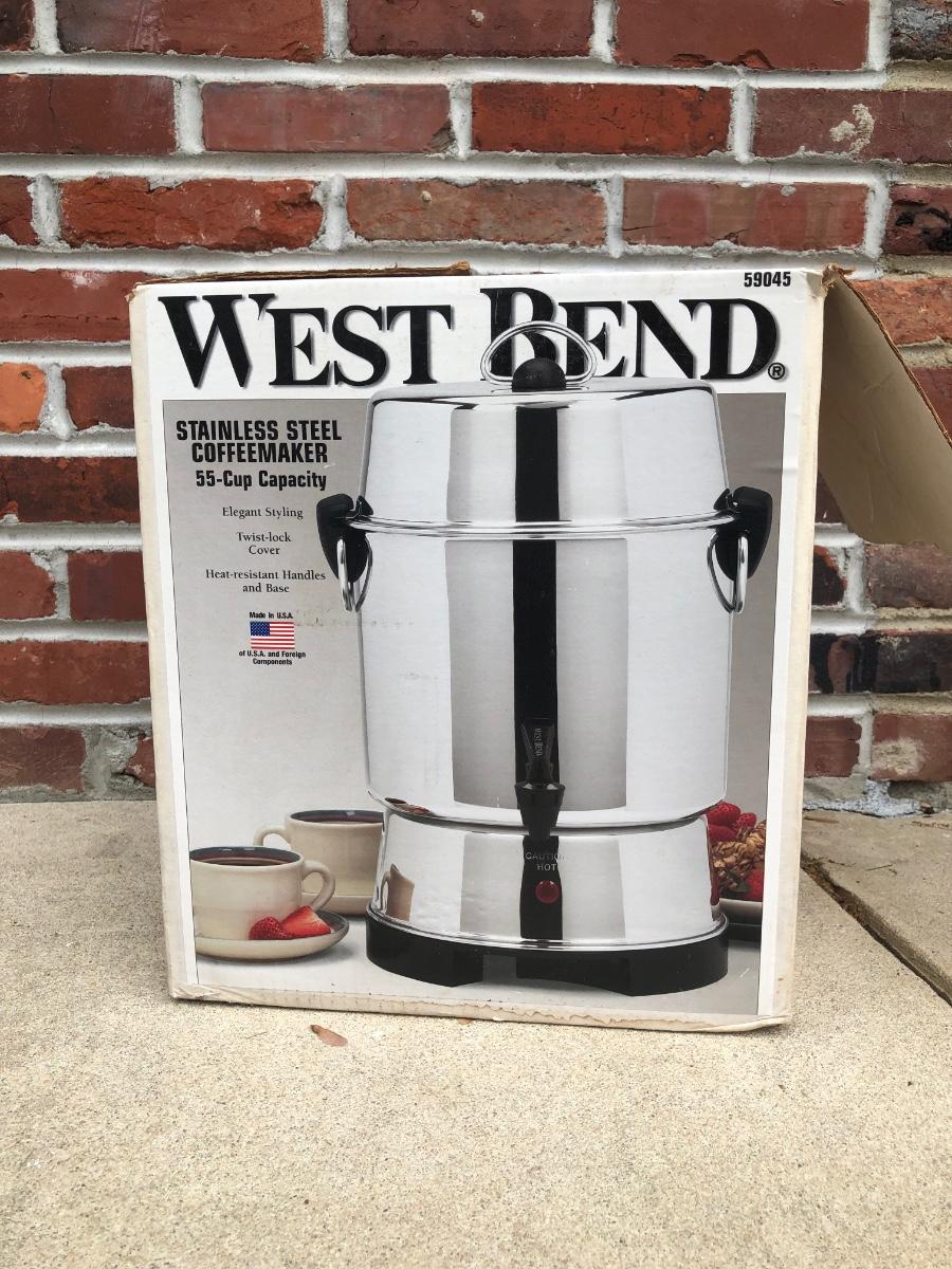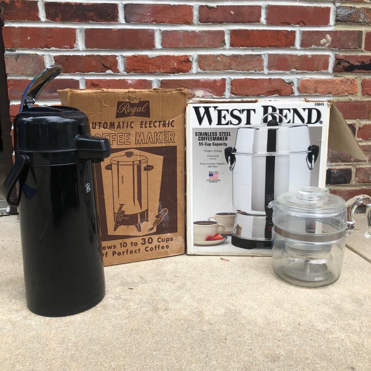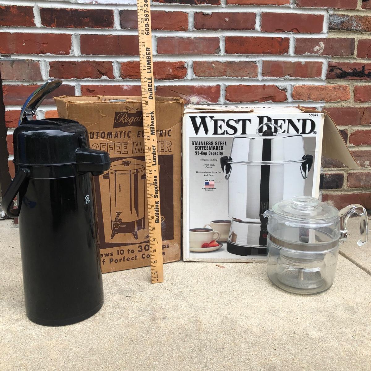 LOT 121G: Coffee Collection: West Bend 55-Cup Stainless Steel Coffee Maker, Plastic Pump Carafe & More