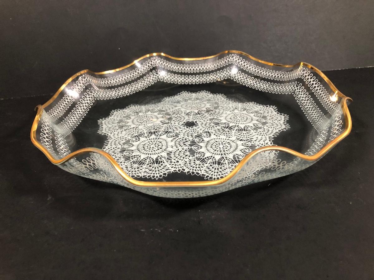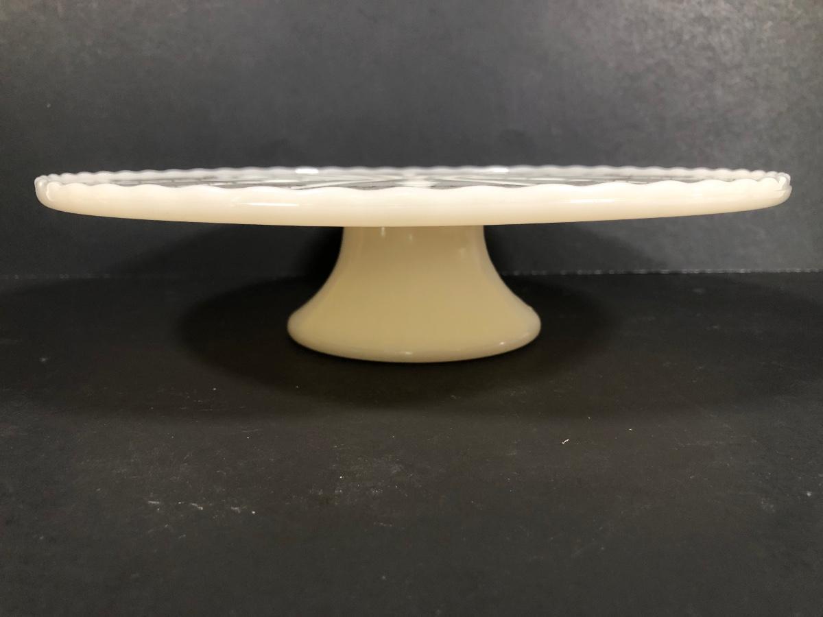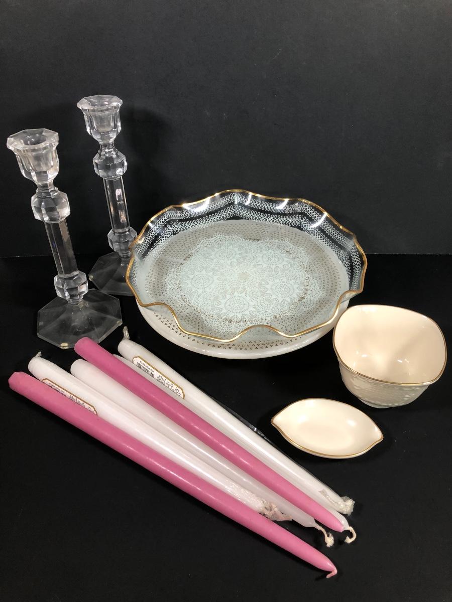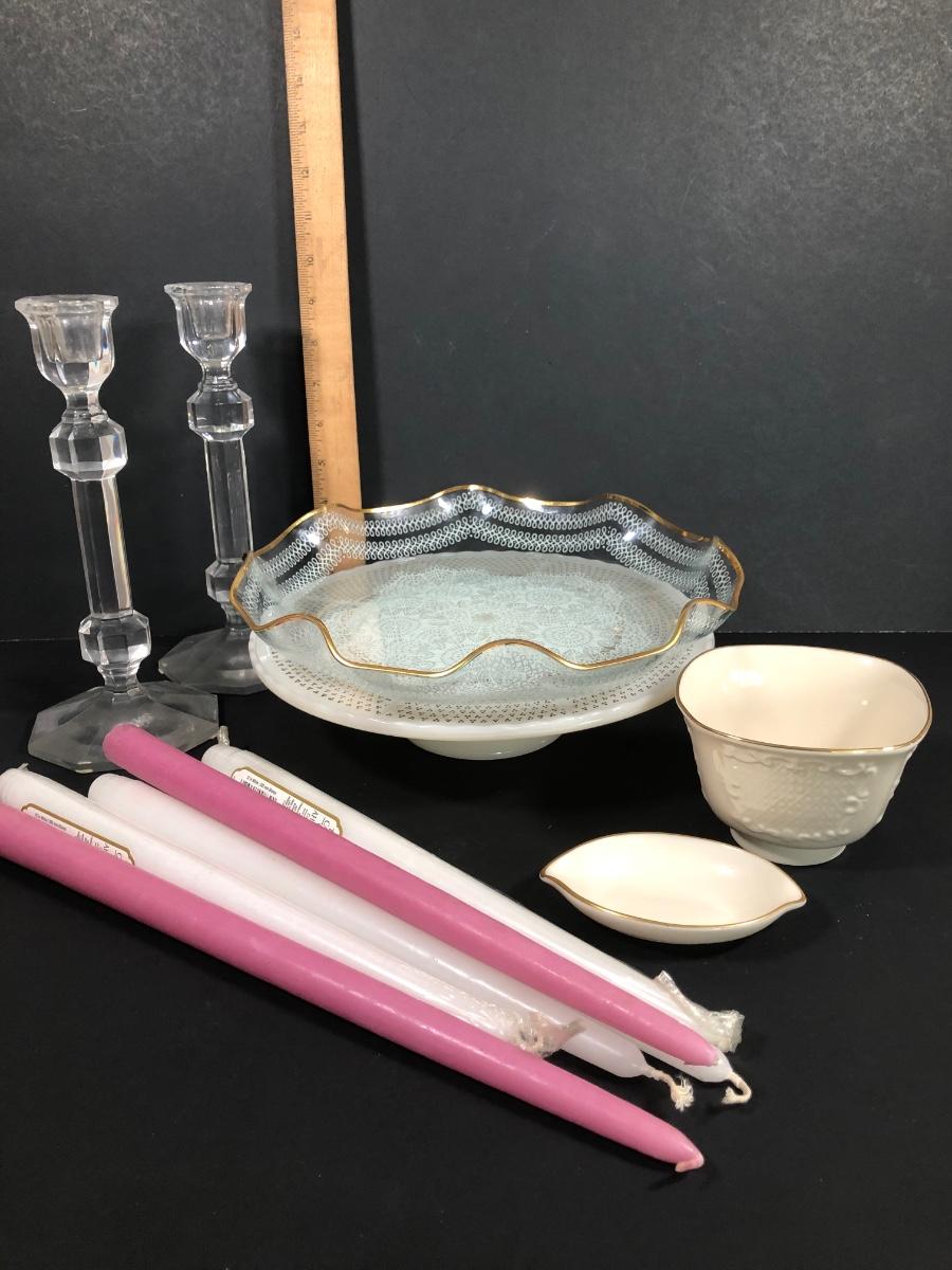 LOT 136D: Vintage White Cake Plate, Lace Ruffled Edge Glass Dish, Crystal Candlesticks, Lenox & Candlesticks