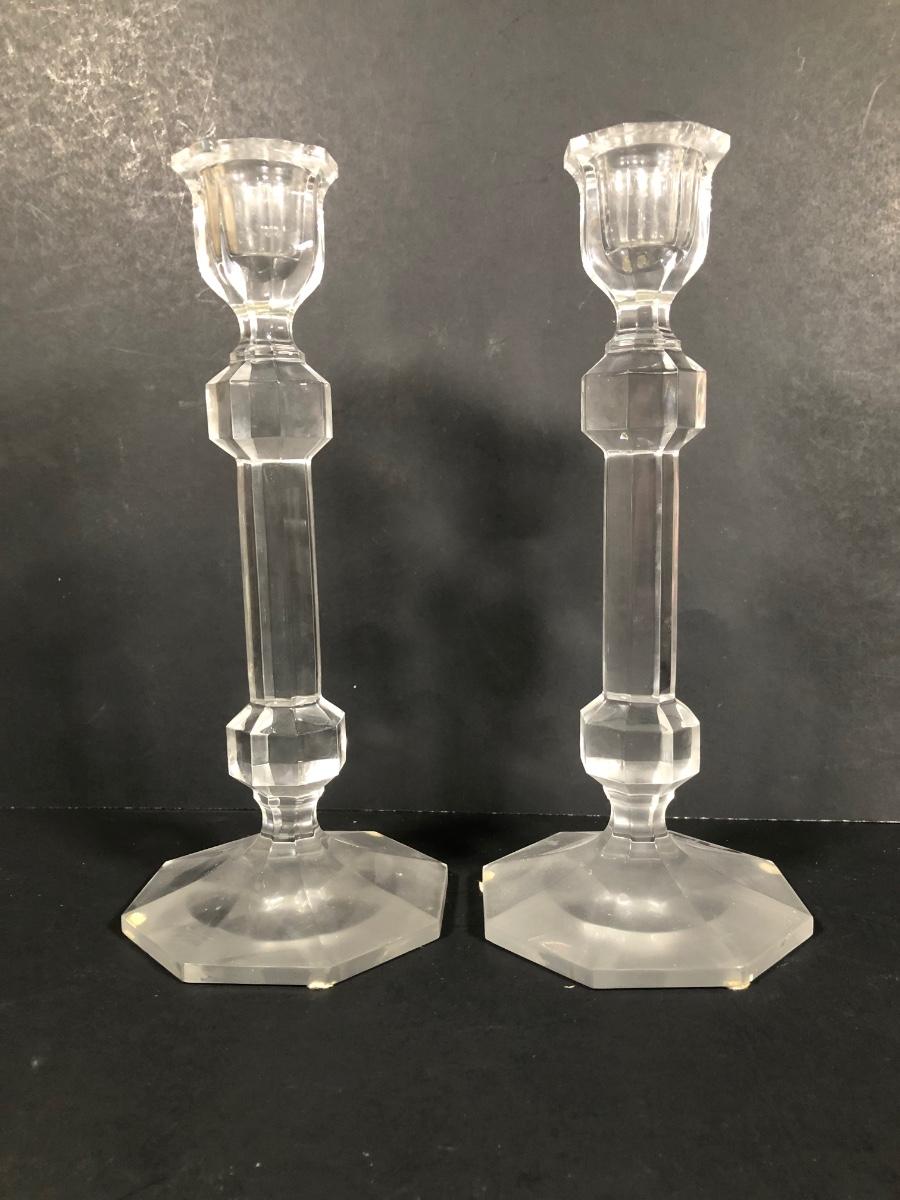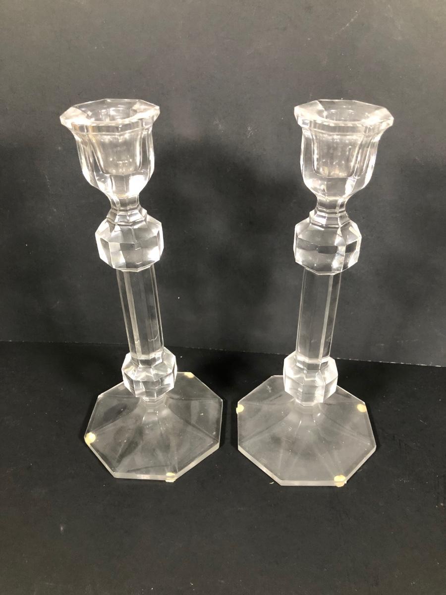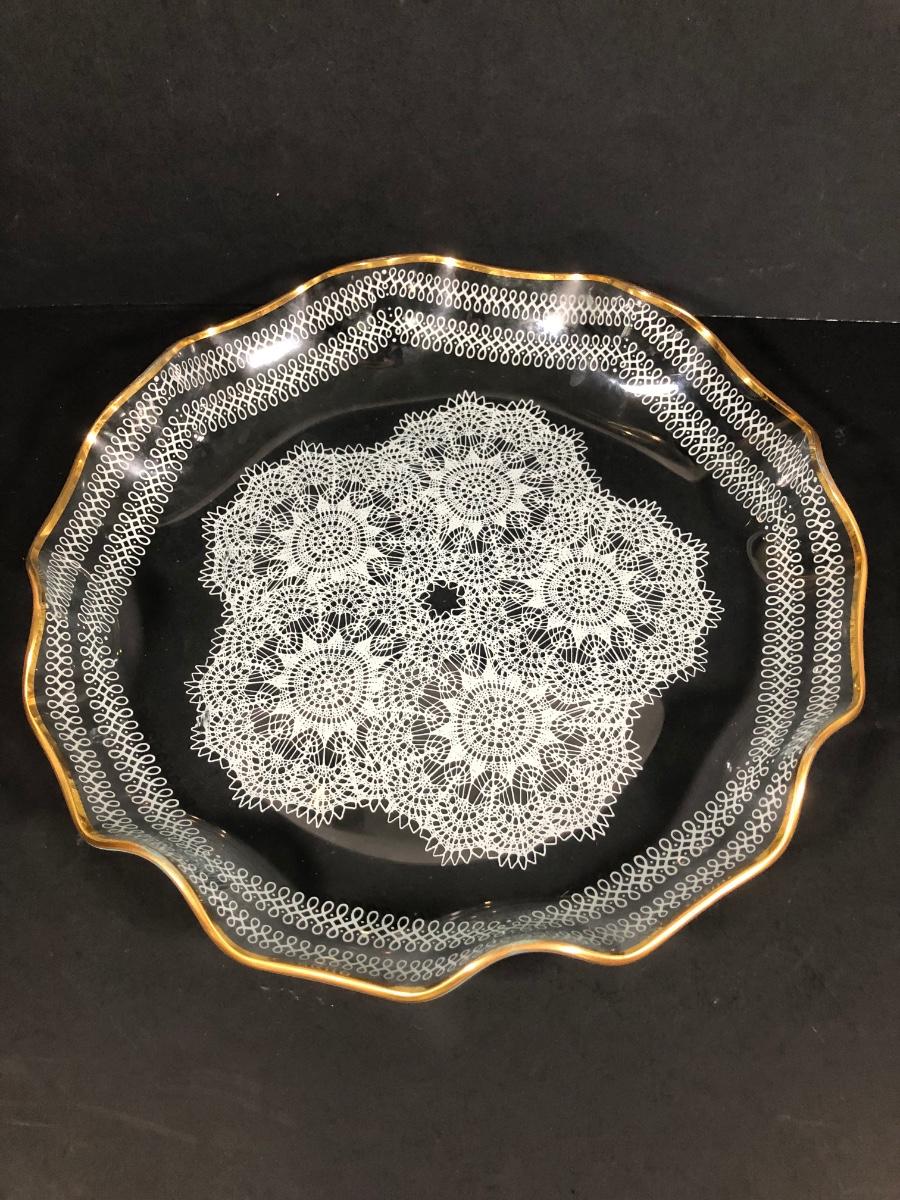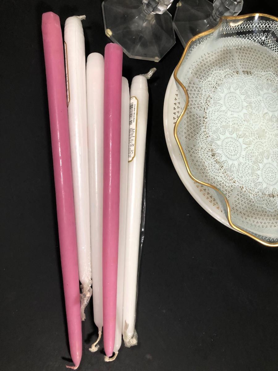 LOT 136D: Vintage White Cake Plate, Lace Ruffled Edge Glass Dish, Crystal Candlesticks, Lenox & Candlesticks