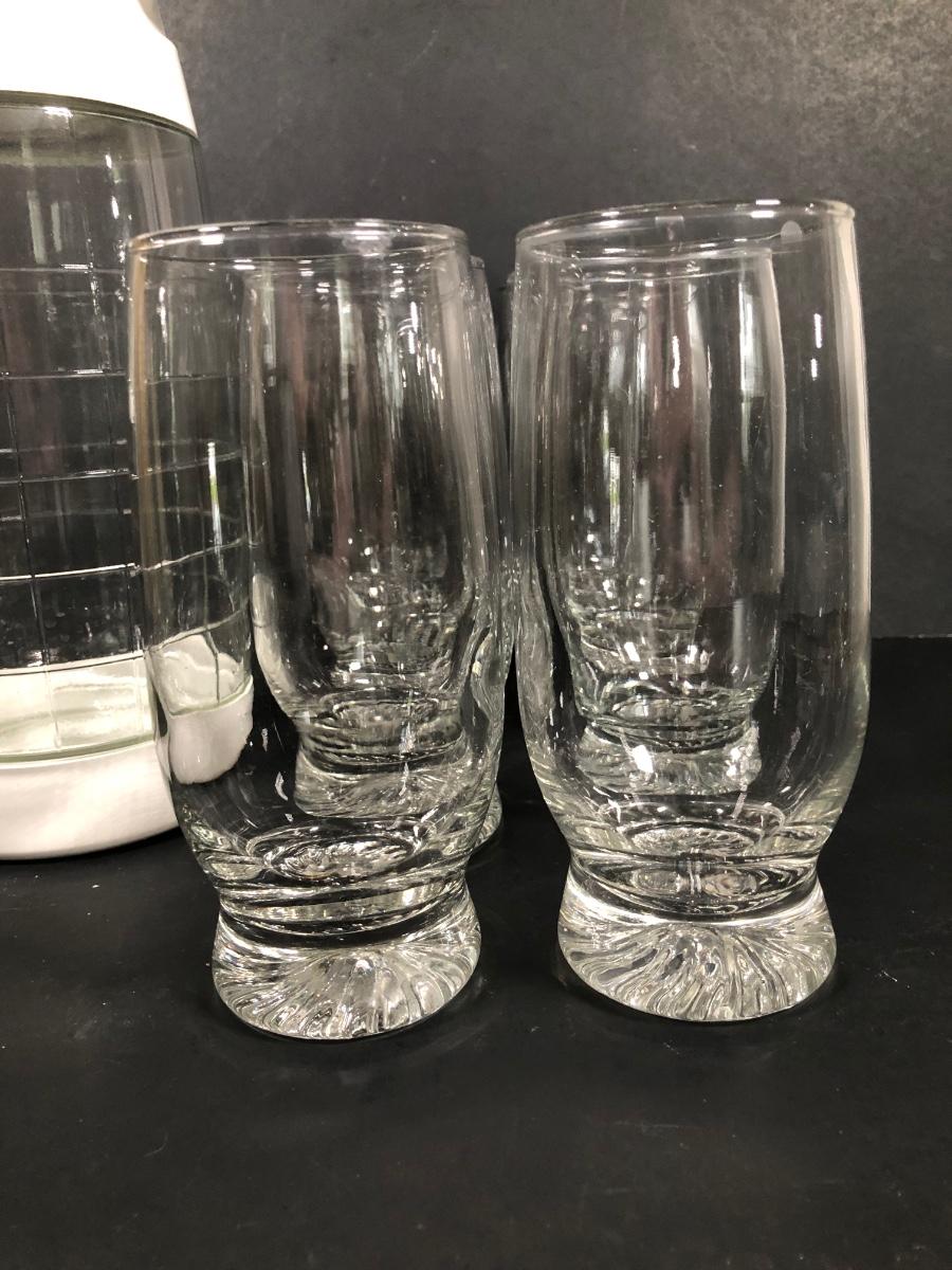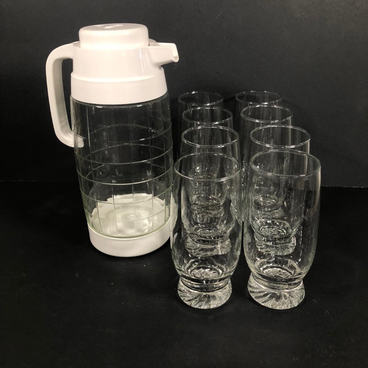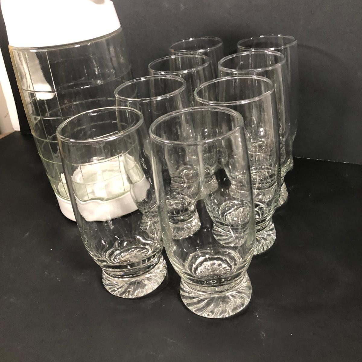 LOT 139D: Glass Pitcher w/ Tall Clear Glasses (8)