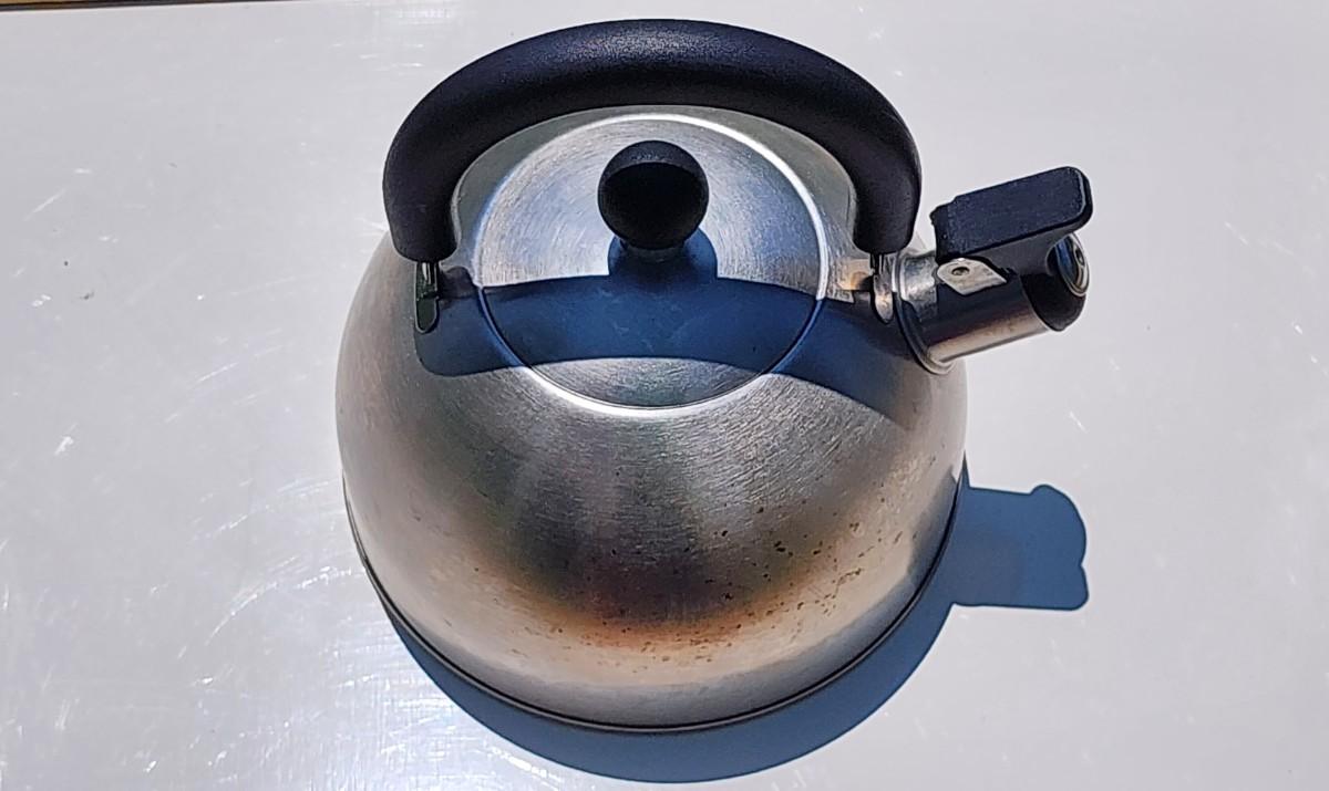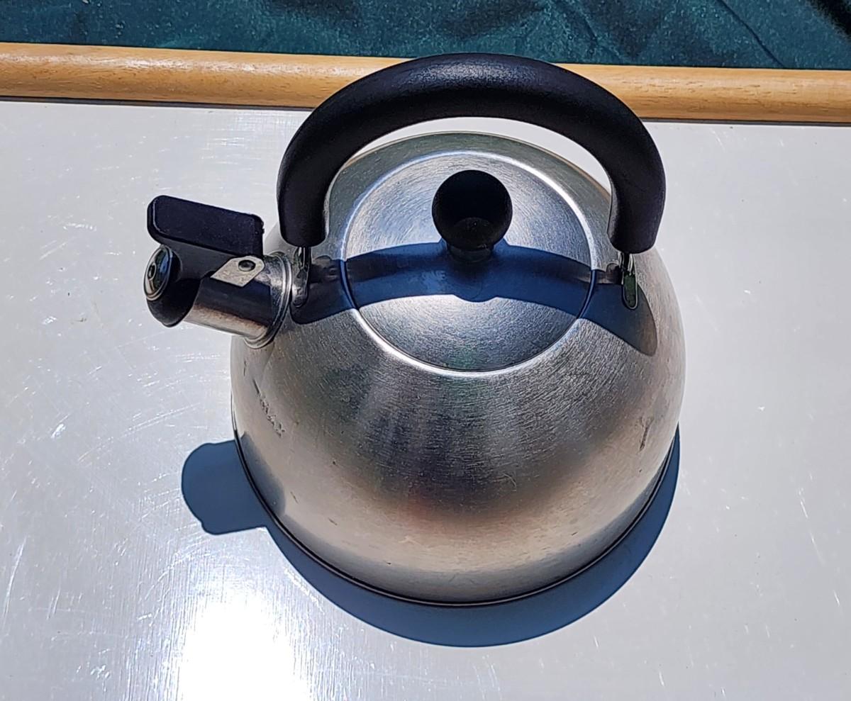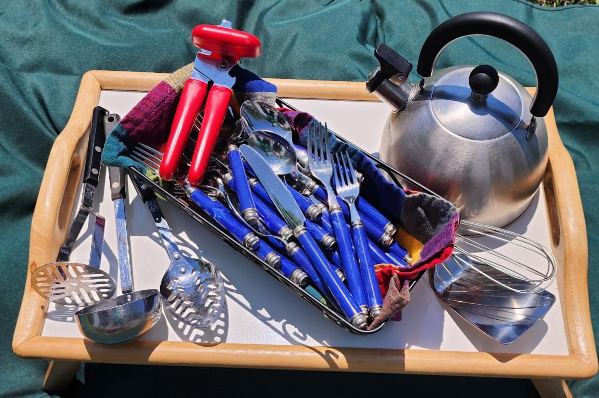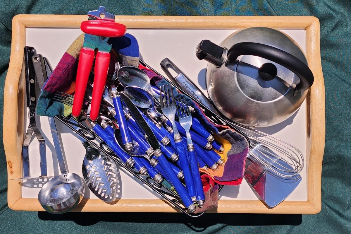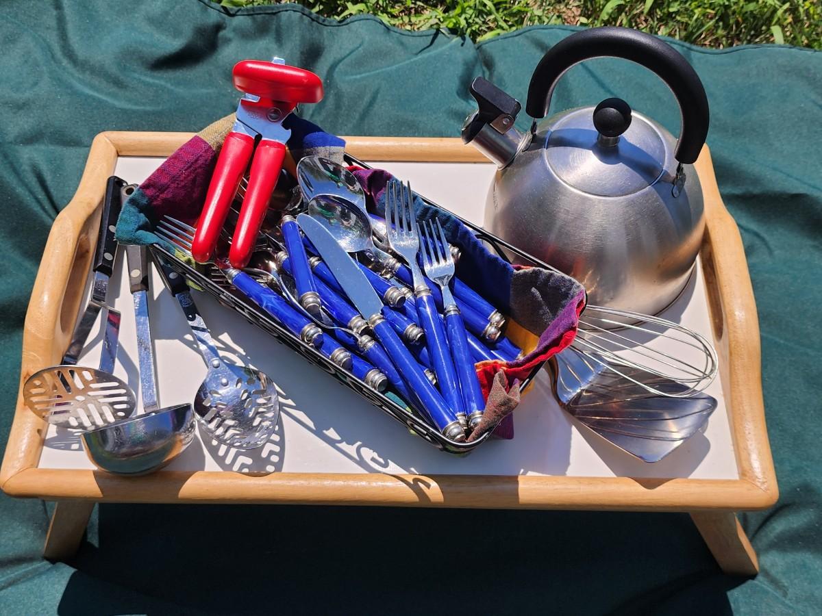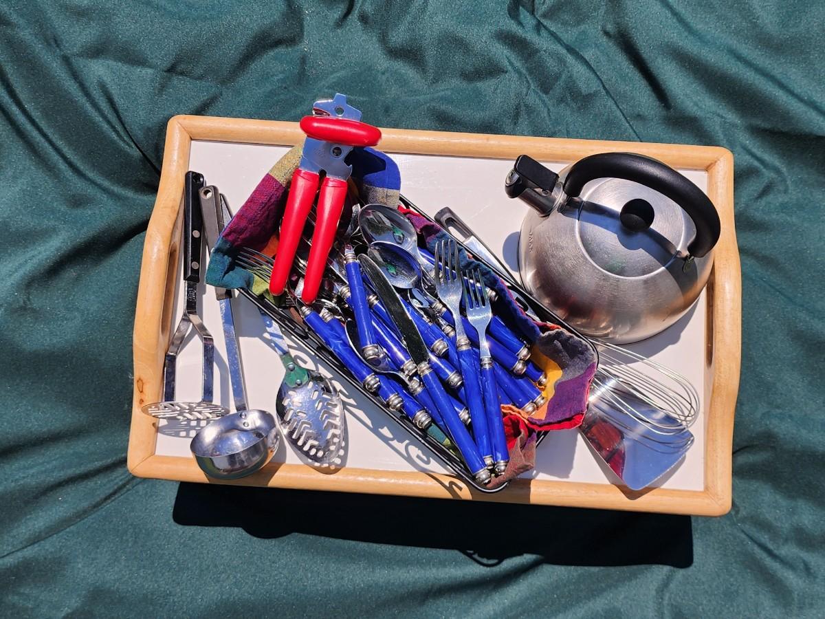 LOT 3:: Stsinless Steel Whistle Tea pot, 37 pc Stainless flatware with blue handles, can opener and more