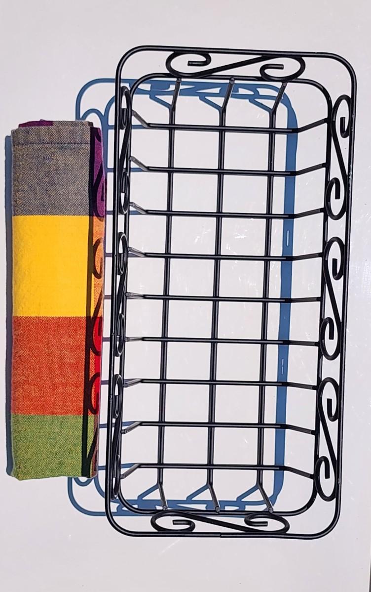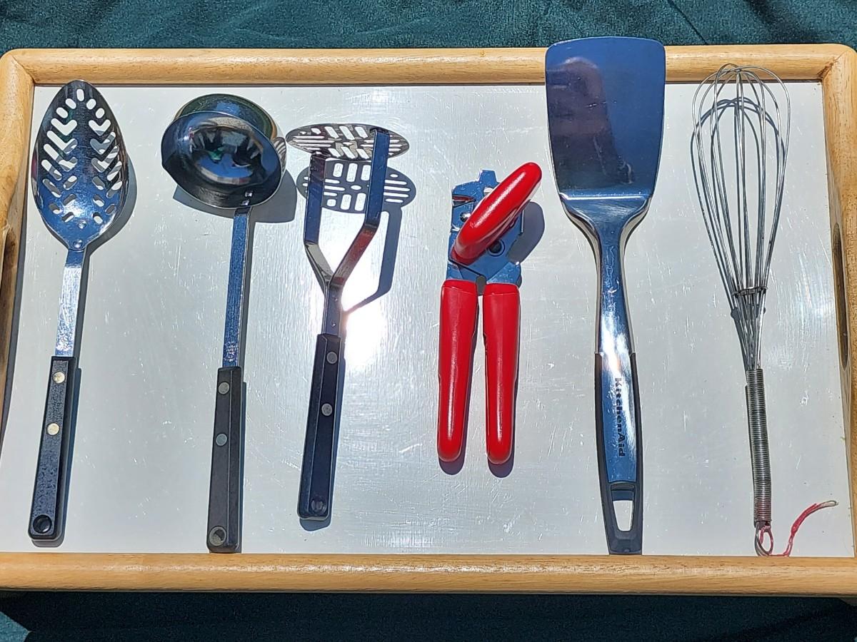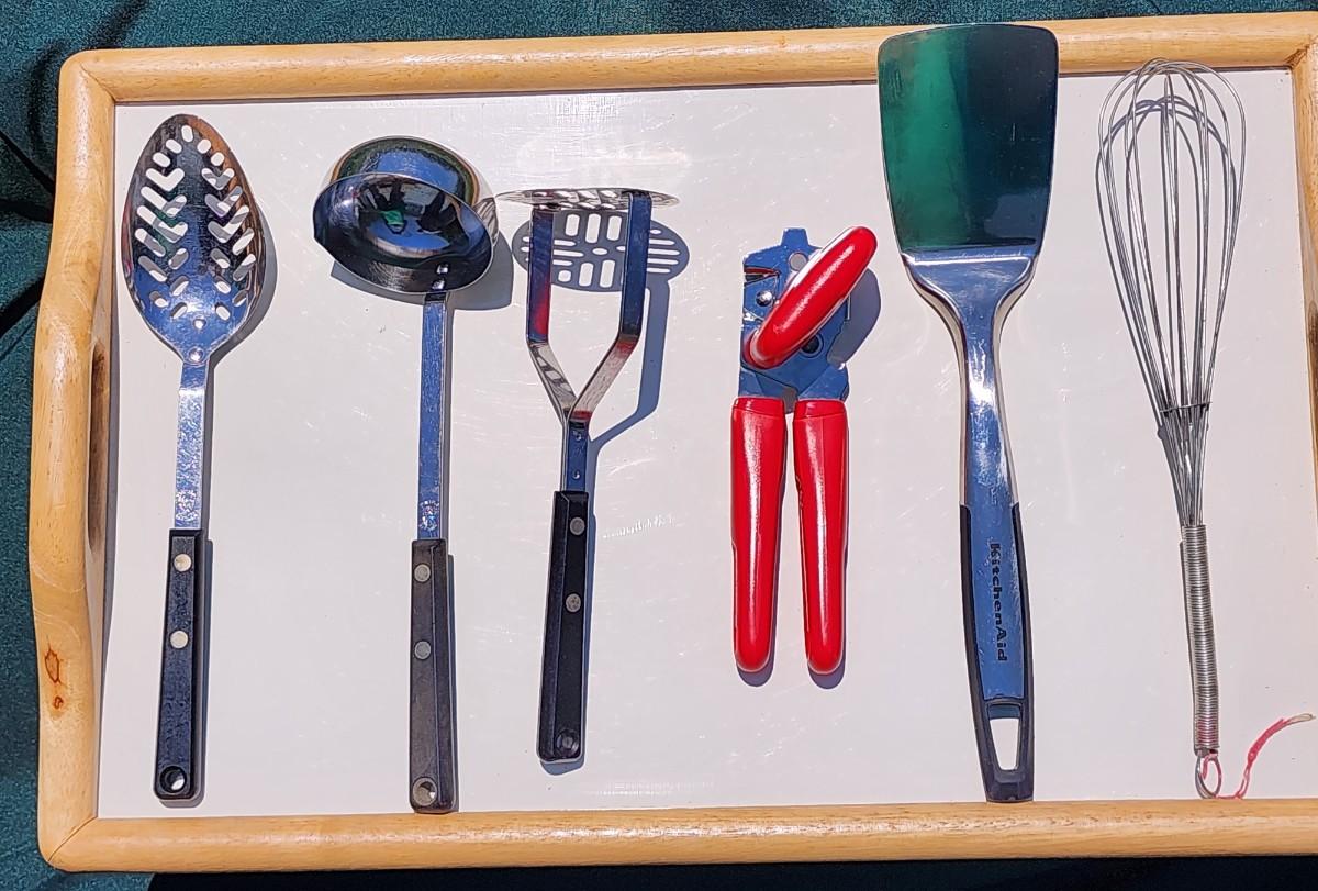 Heavy wire basket with dishtowel, 3 pc set ladle with lip, slotted spoon and potato masher, a wisk and a Kitchen Aid heavy duty stainless spatula.