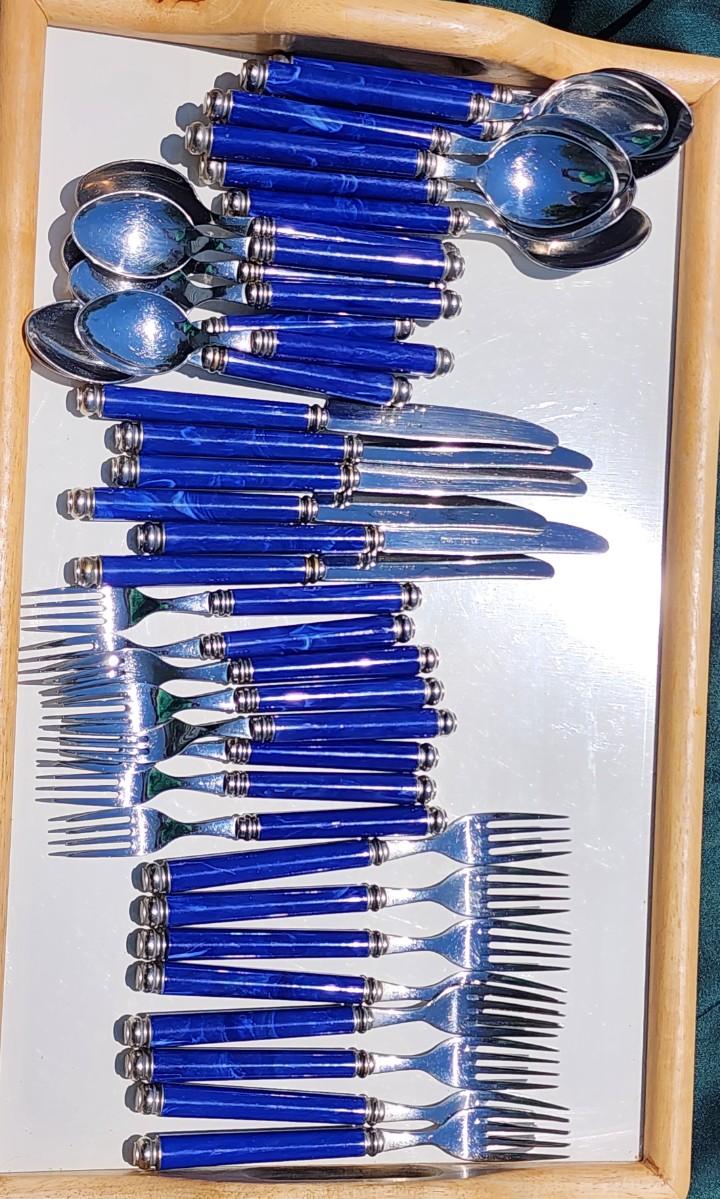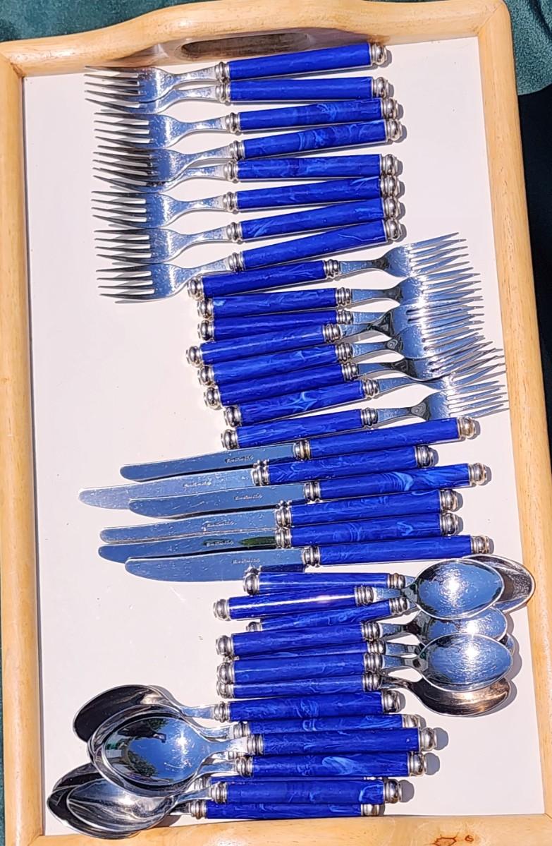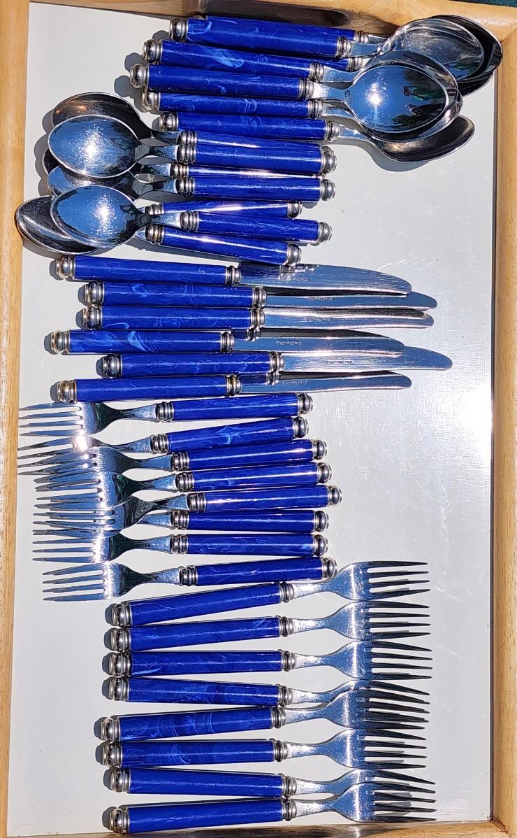 Flatware is Eight dinner forks eight salad forks six bread knives seven dessert spoons and eight tablespoons.