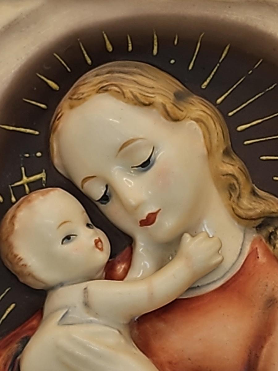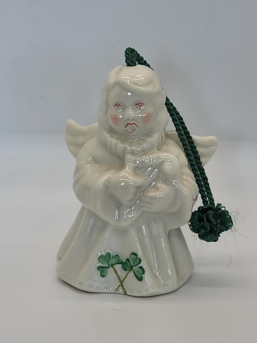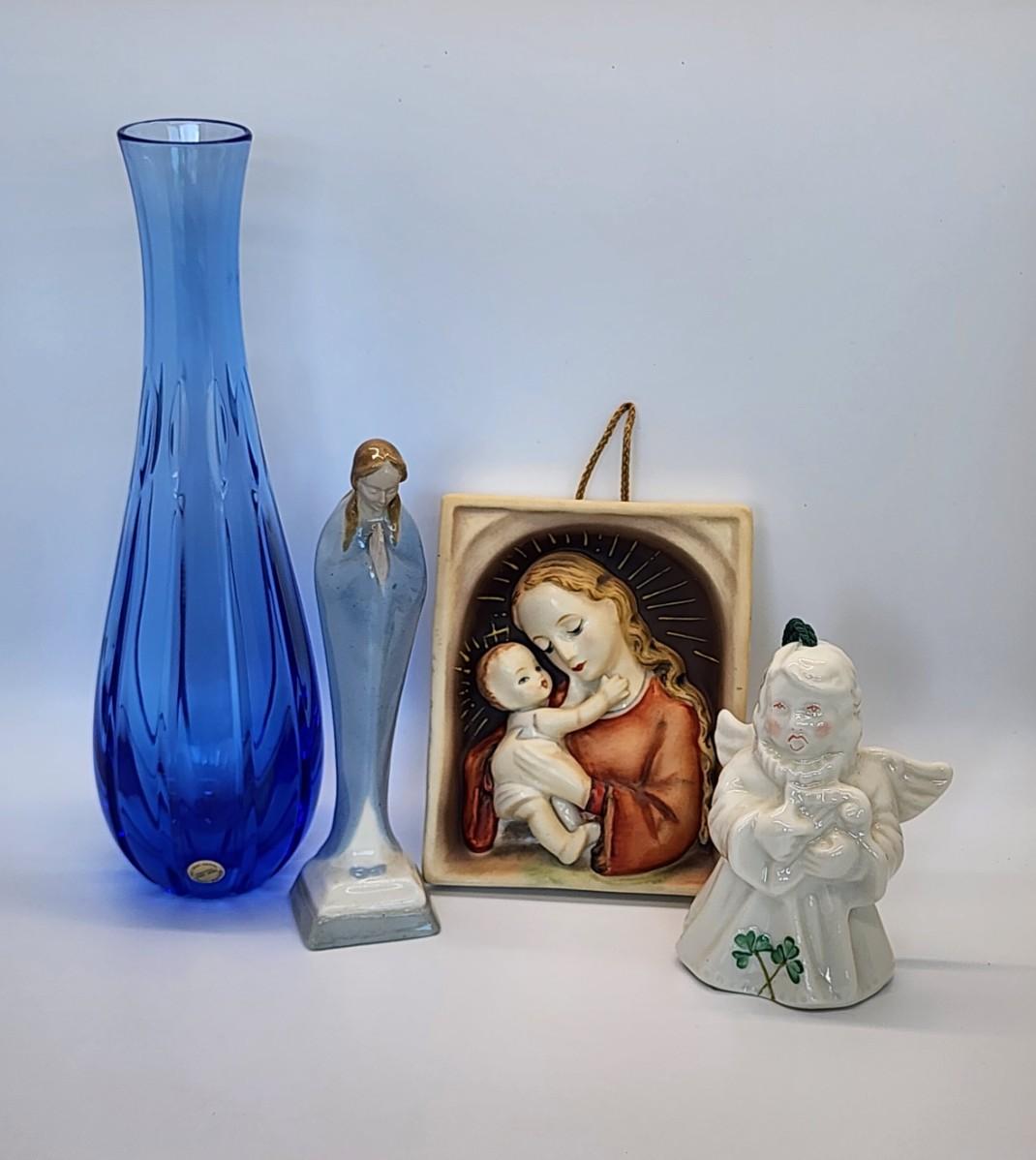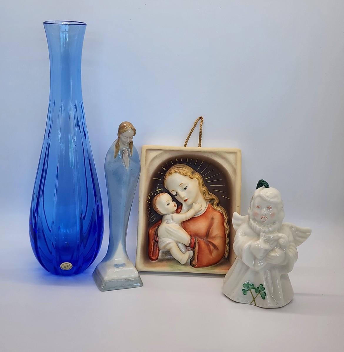 LOT 6:: Virginia Mary fiqurine bone china England, MJ Hummel Madonna&Child plaque, Belleek China Angel Bell and Portuguese handmade lead crystal Blue Bud vase