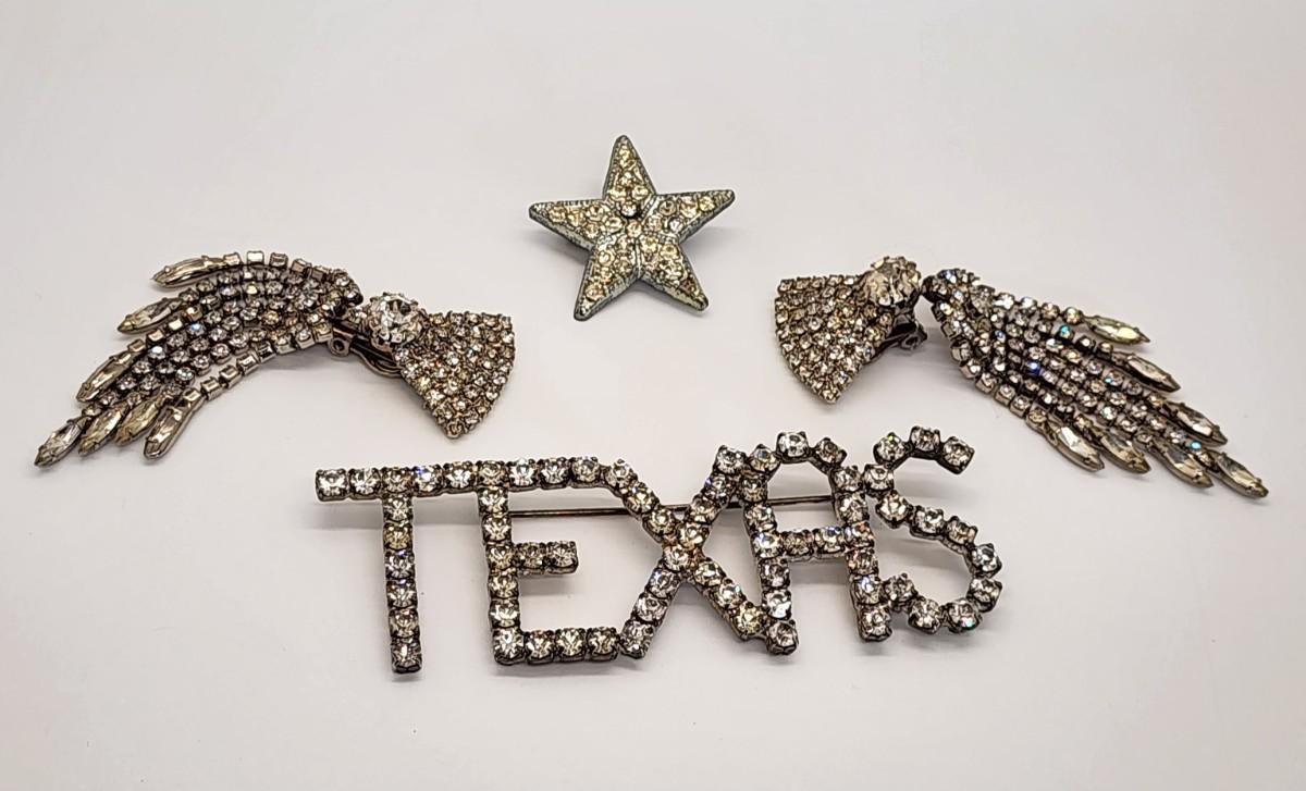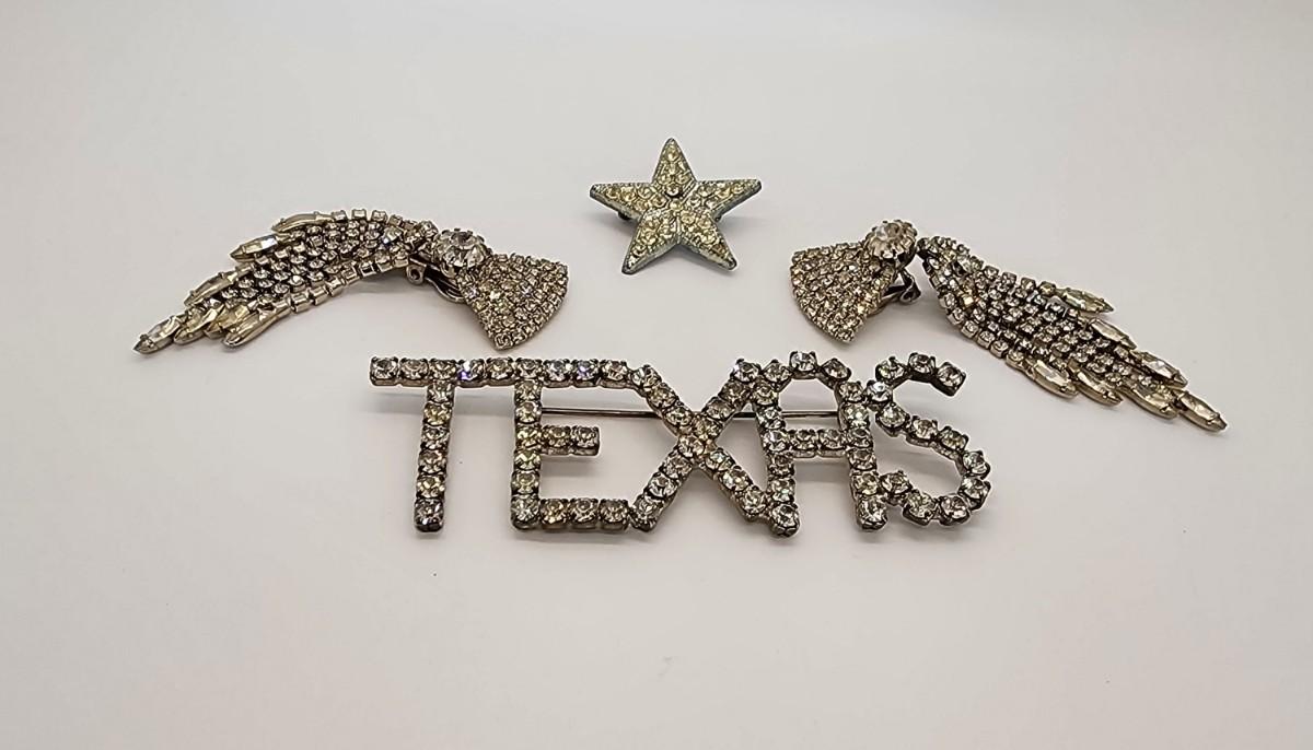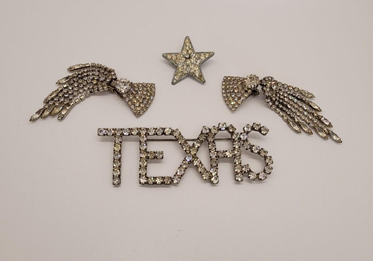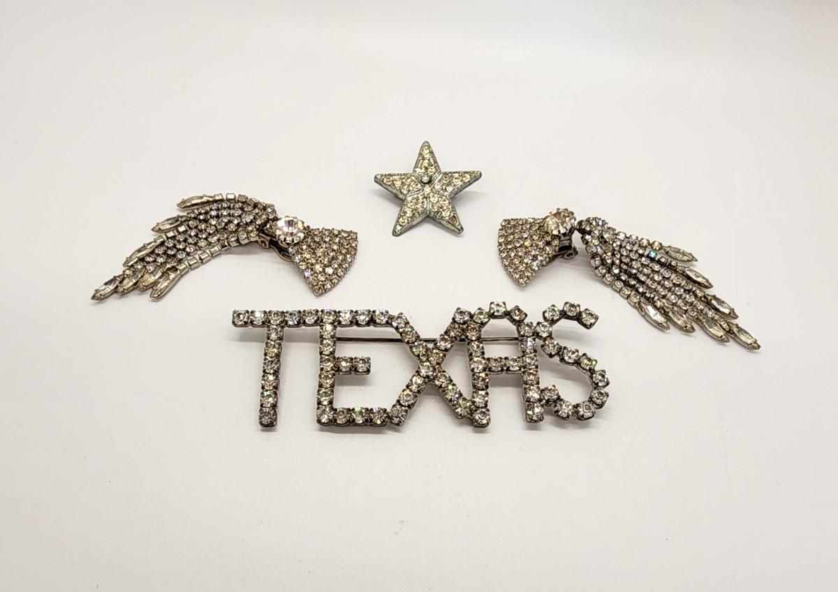LOT 16 :: Rhinestone Lot- Huge Texas Brooch, Large pair Dangling clip-on Earrings and a lone Star Pin