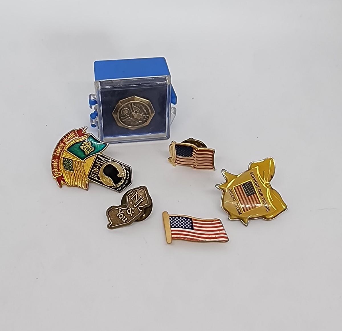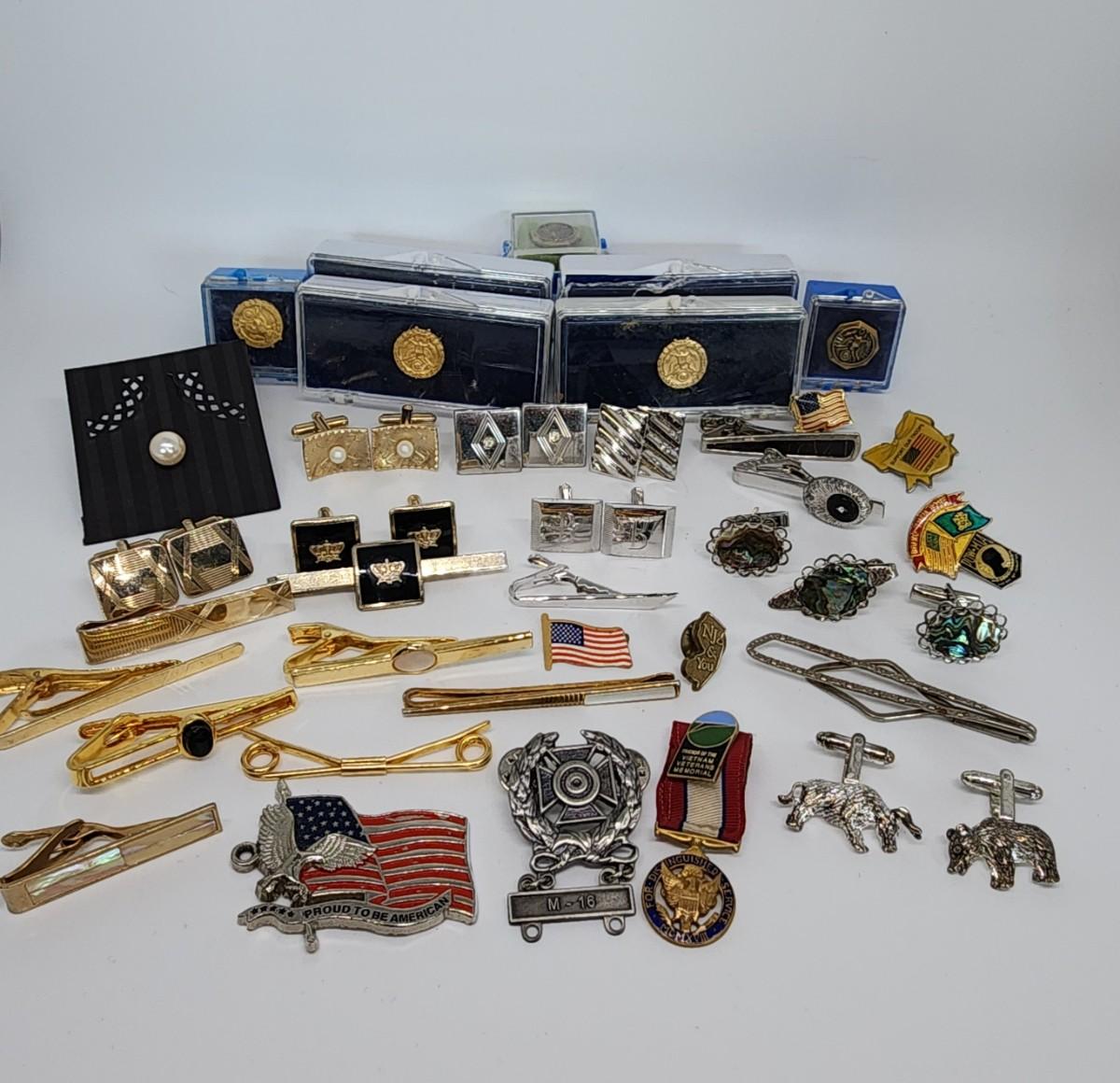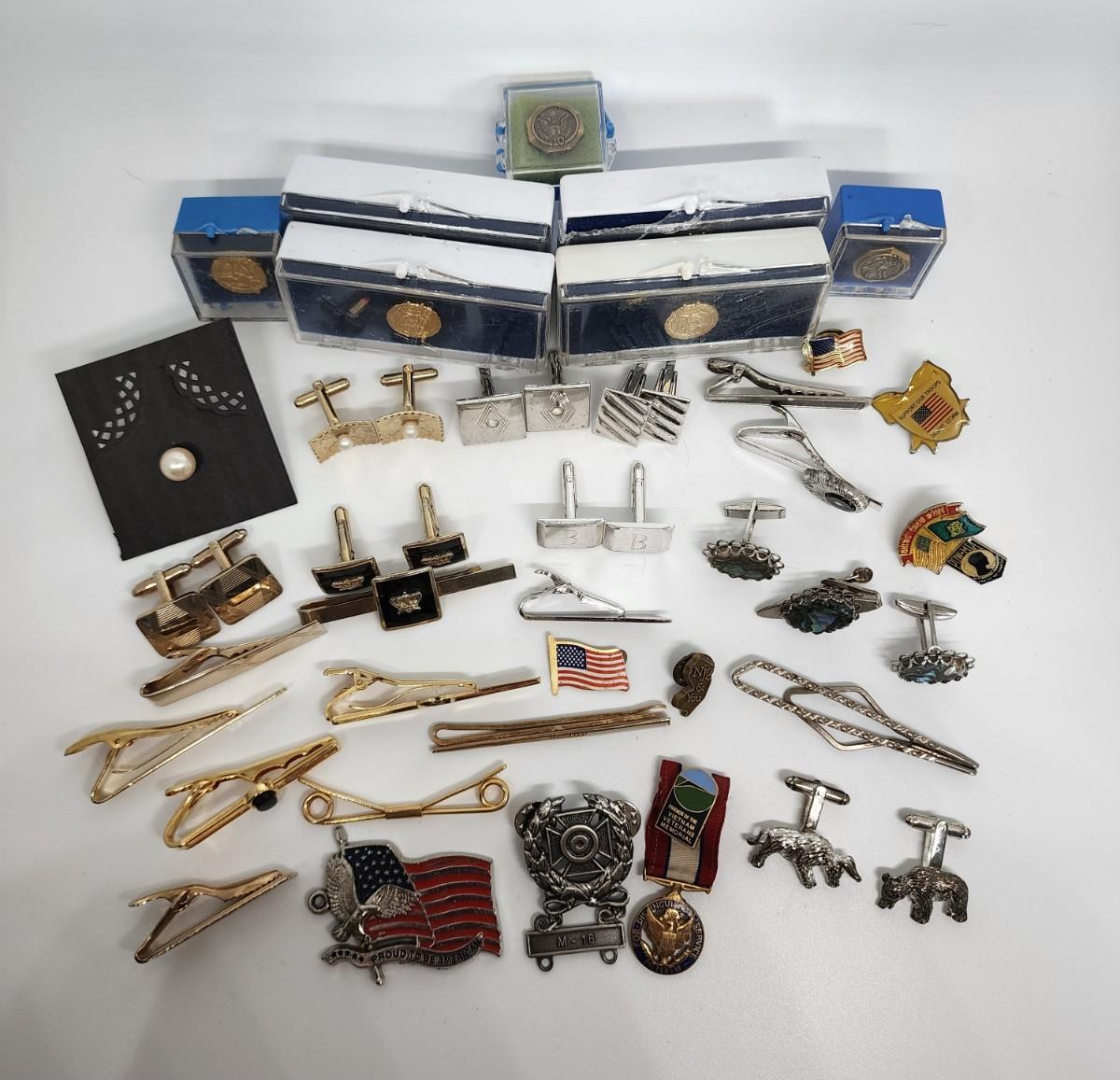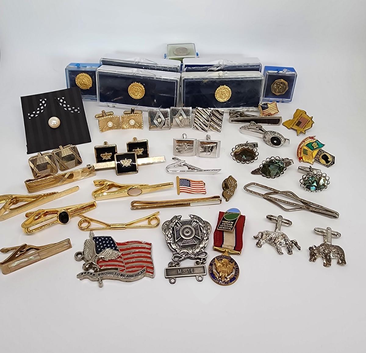 LOT 21:: Large lot Mens jewelry, military medals and pins