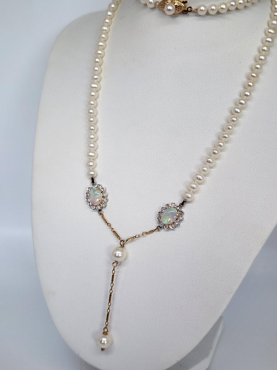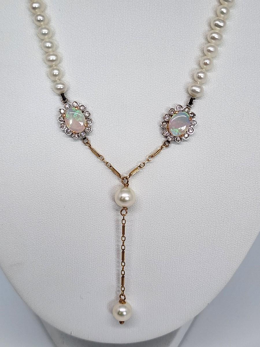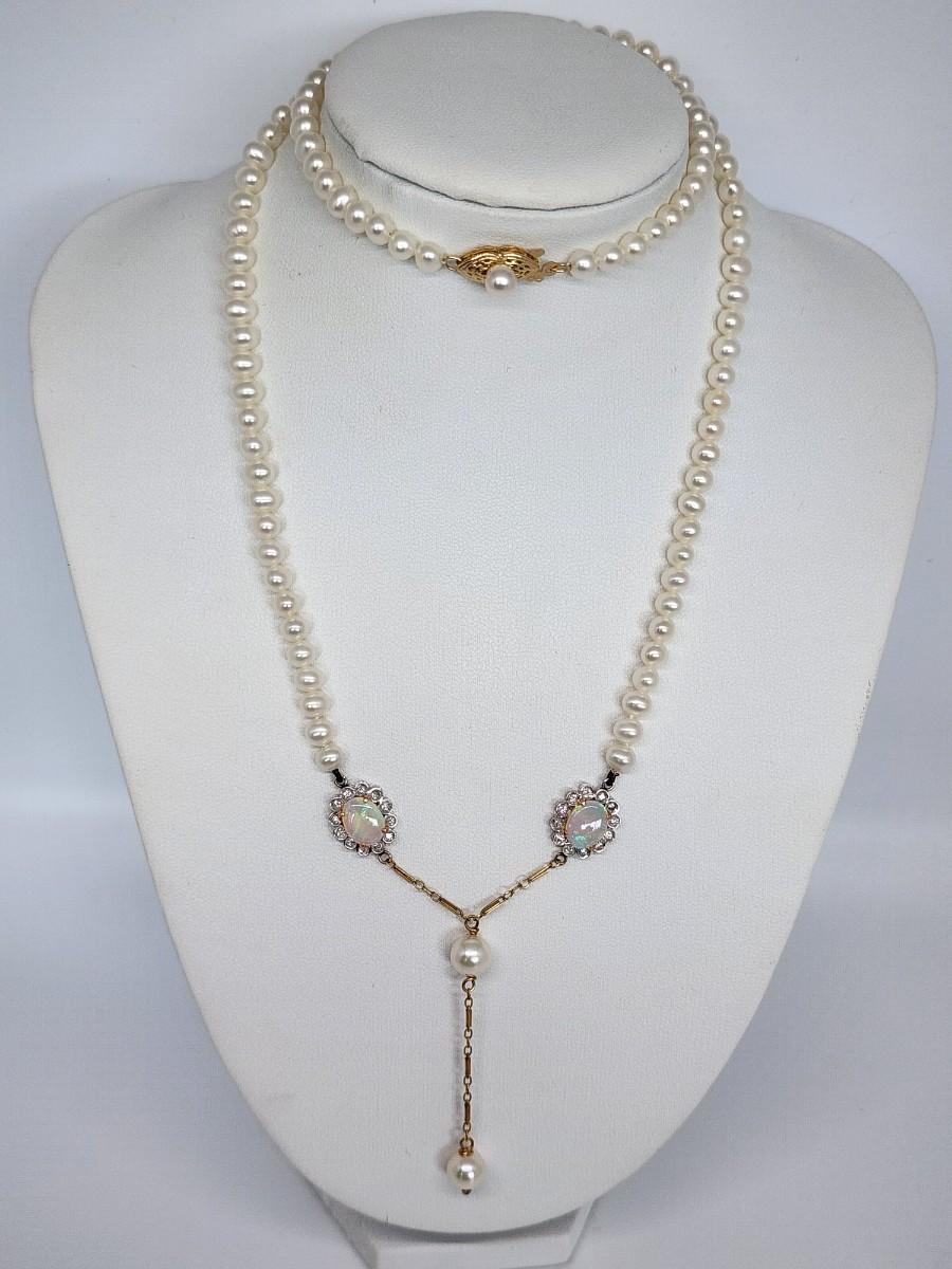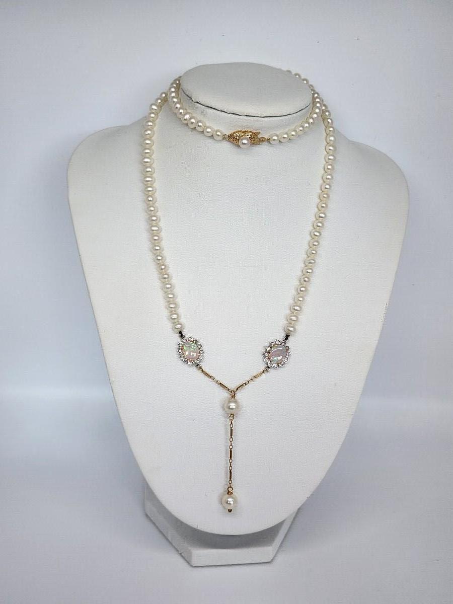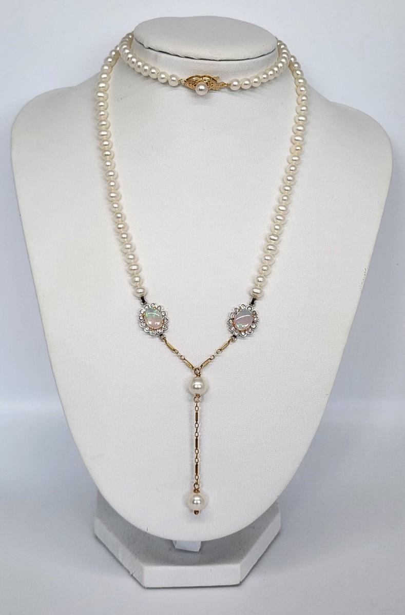 LOT 24:: 14k -Beautiful 22"L Strand of Cutured Pearls Accented by Opals and Diamonds & 14k gold