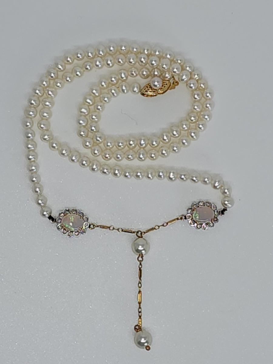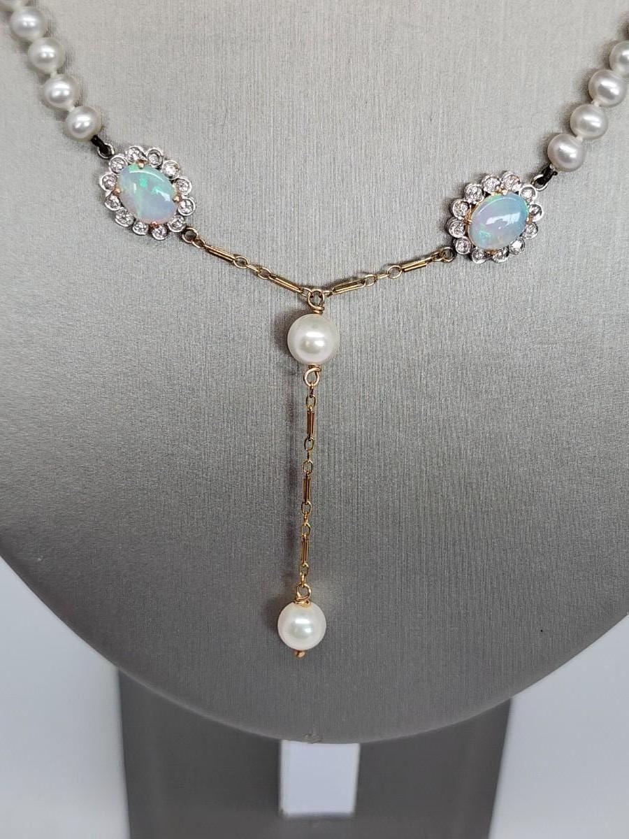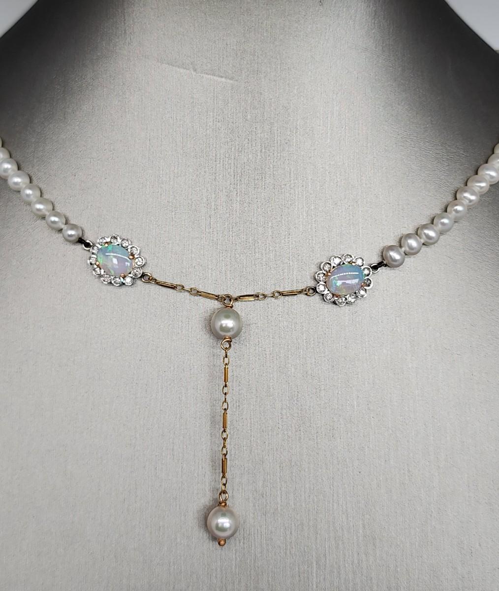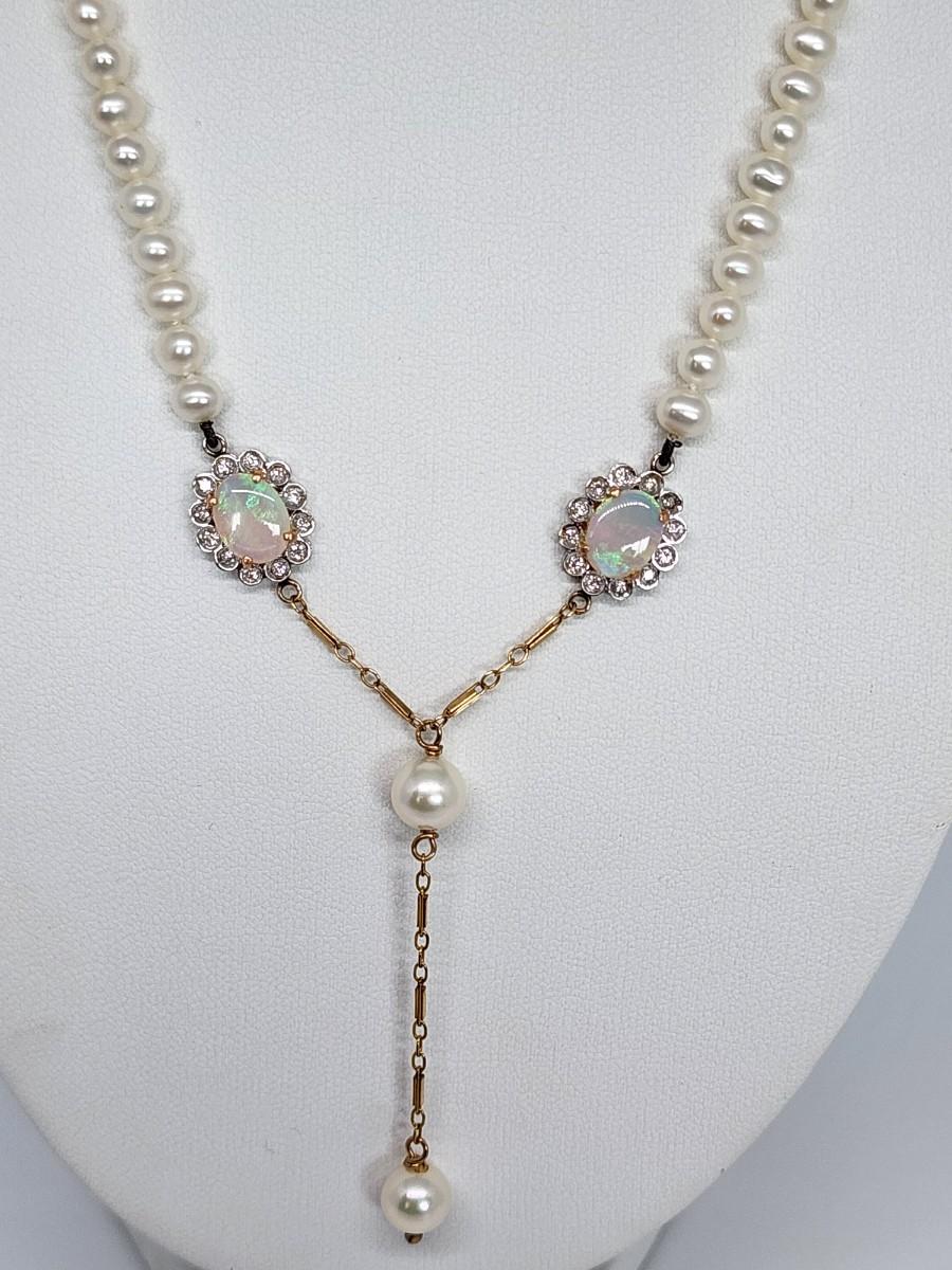 LOT 24:: 14k -Beautiful 22"L Strand of Cutured Pearls Accented by Opals and Diamonds & 14k gold