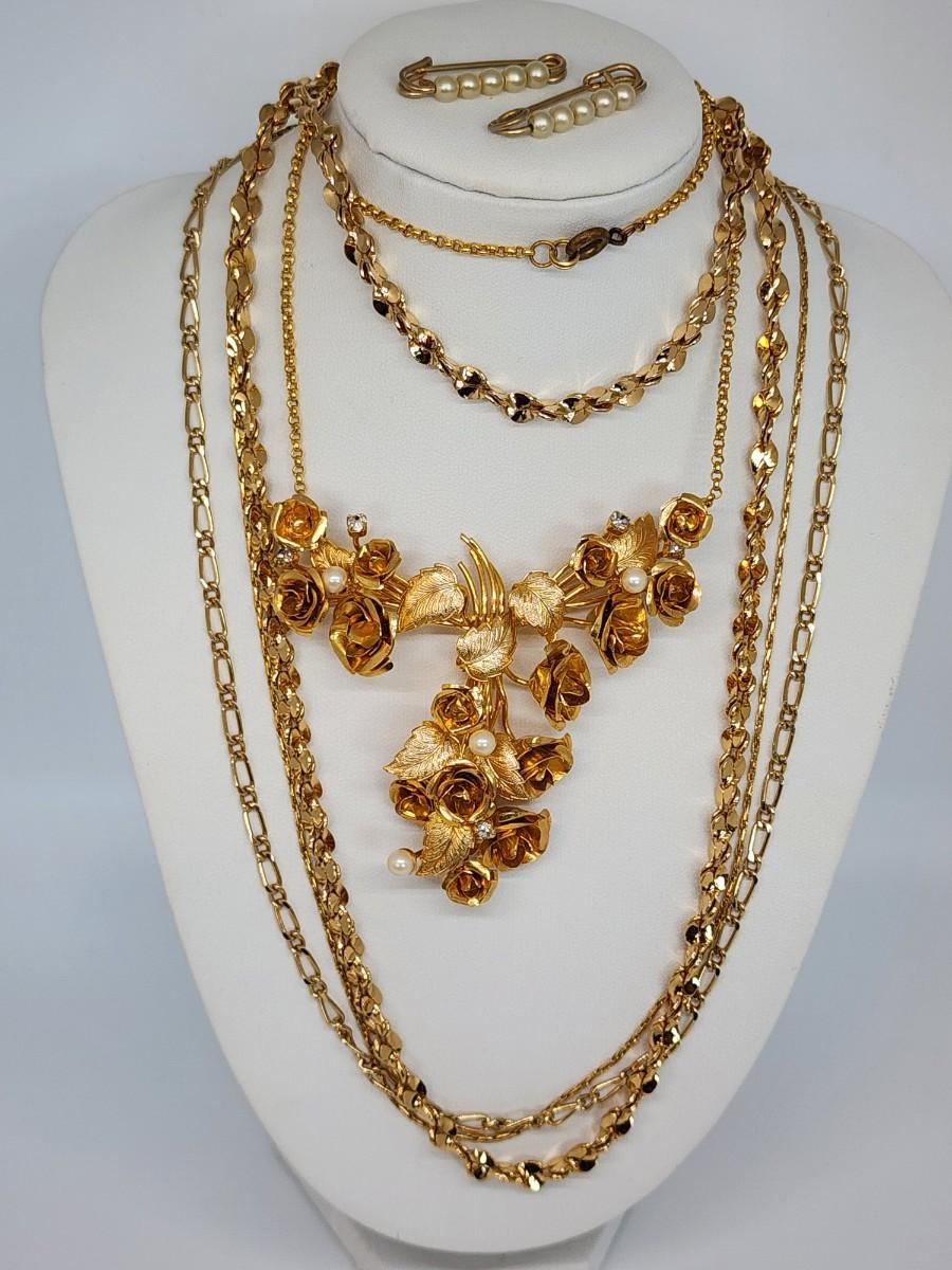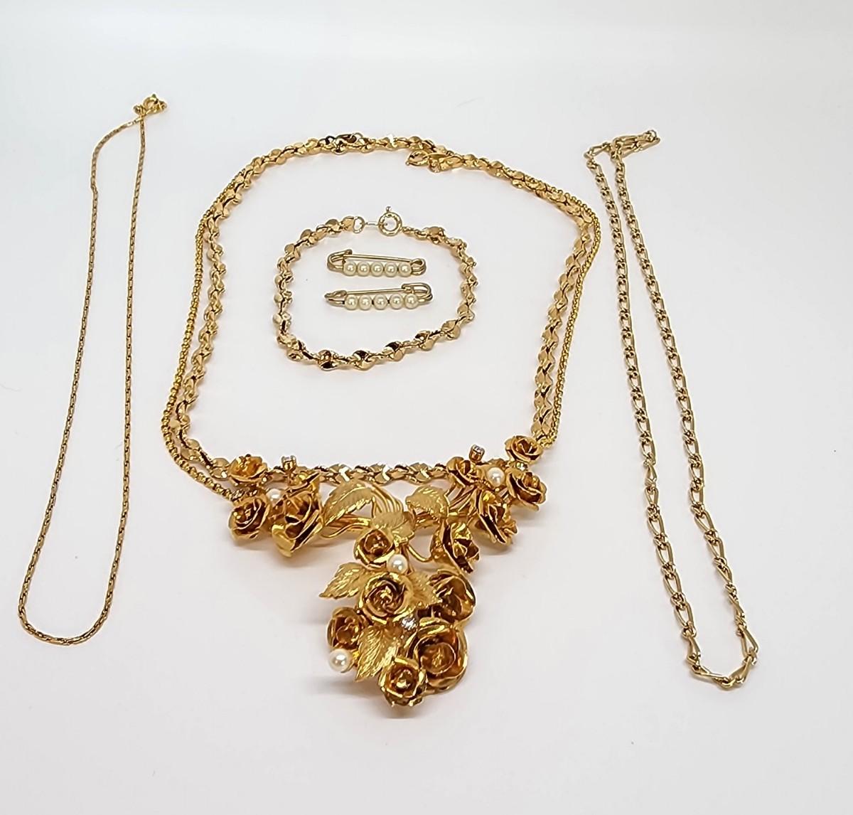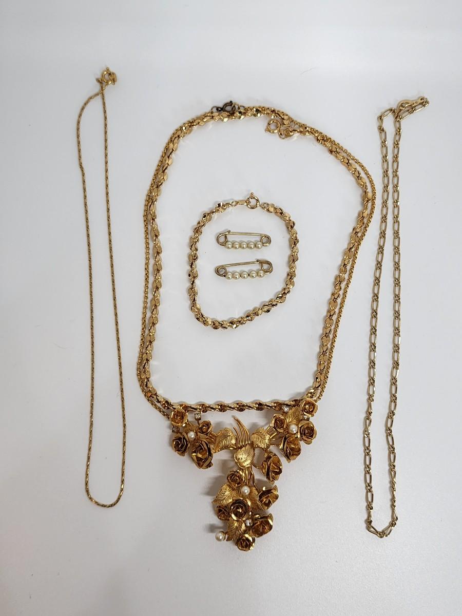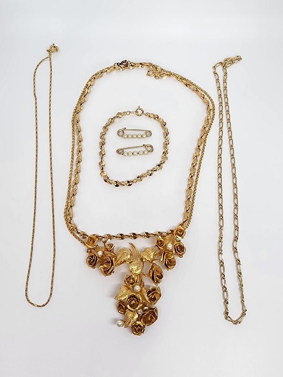 LOT 25:: Goldtone Floral Pendant Necklace Accented by Pearls and CZ's, Pudore Chain and bracelet set and more