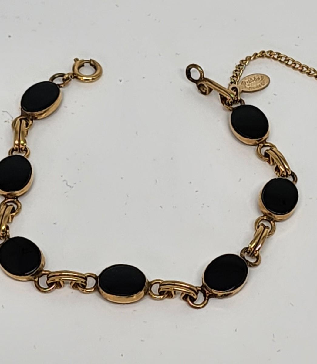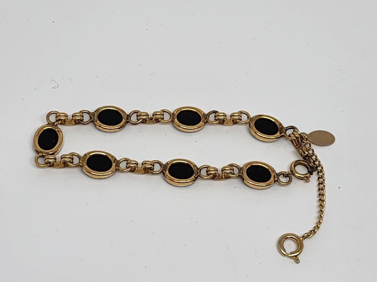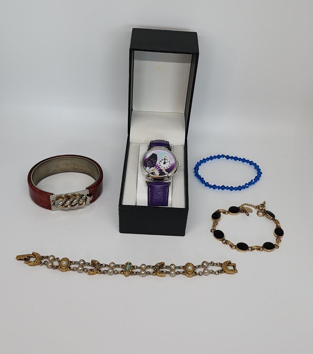 LOT 28:: Vintage Goldette bracelet, Vintage Russell Goldfilled onyx bracelet, New Butterfly Watch and more