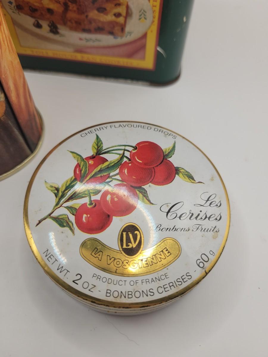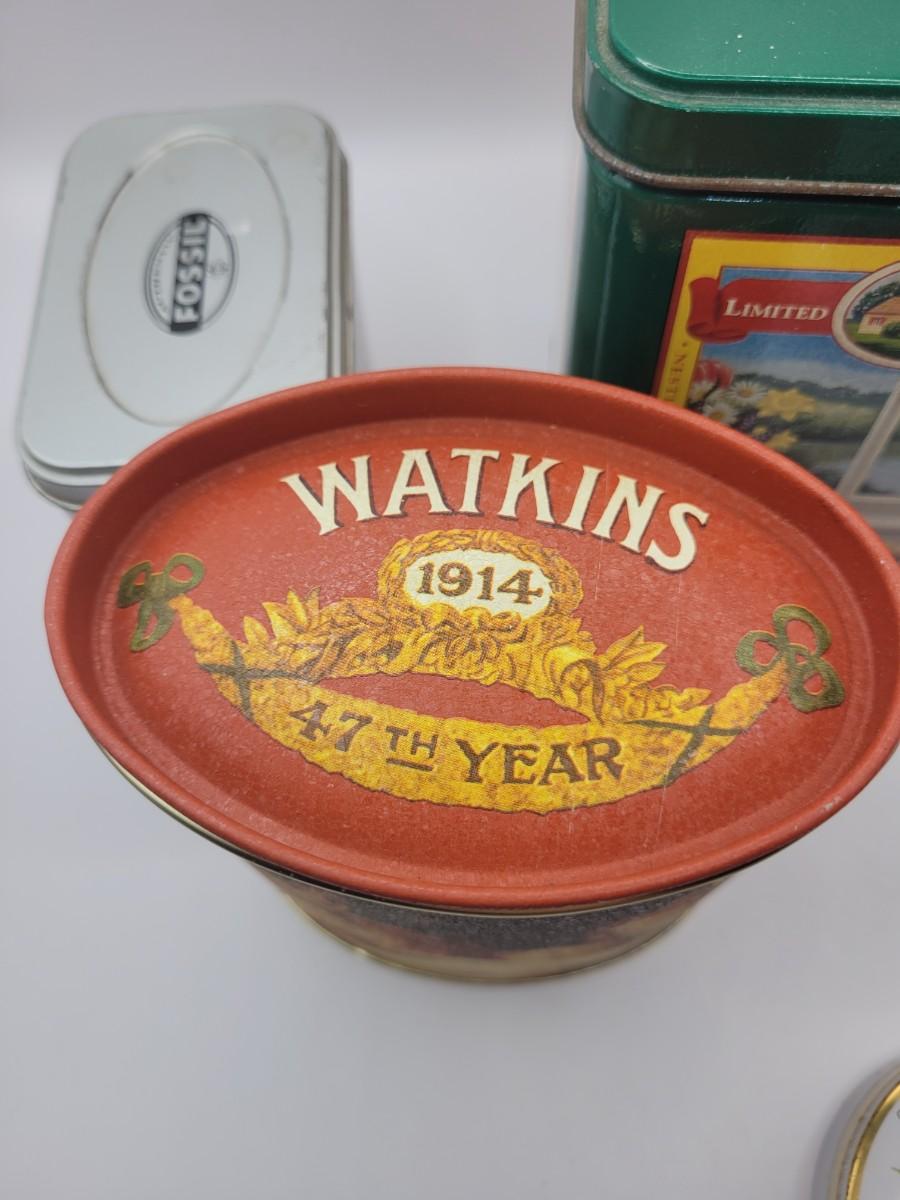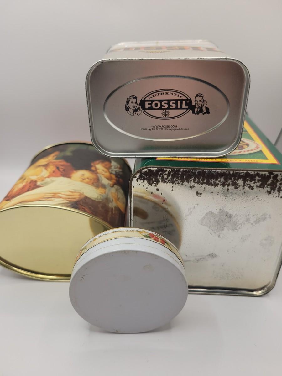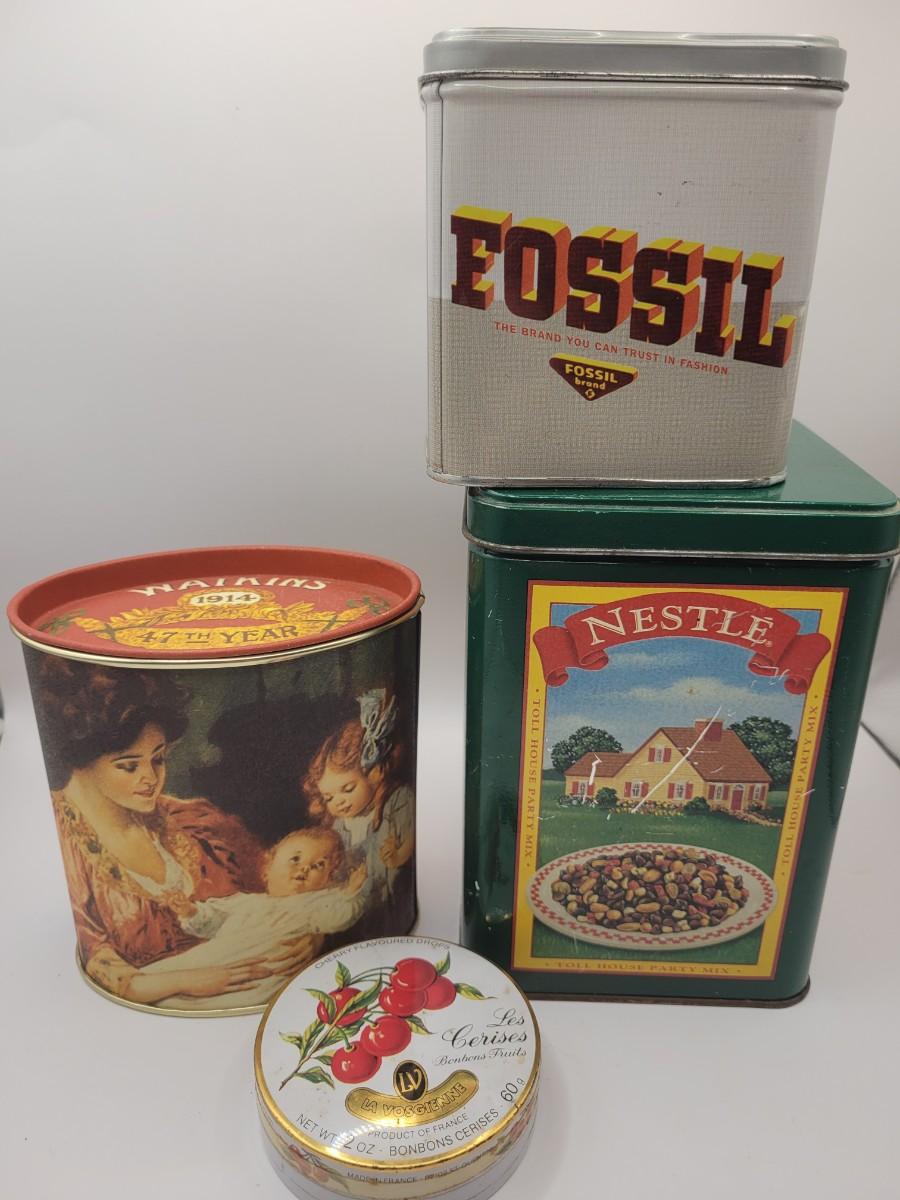 LOT:: 88 Four Vintage Tin Cans Containers Nestlé Fossil Watkins