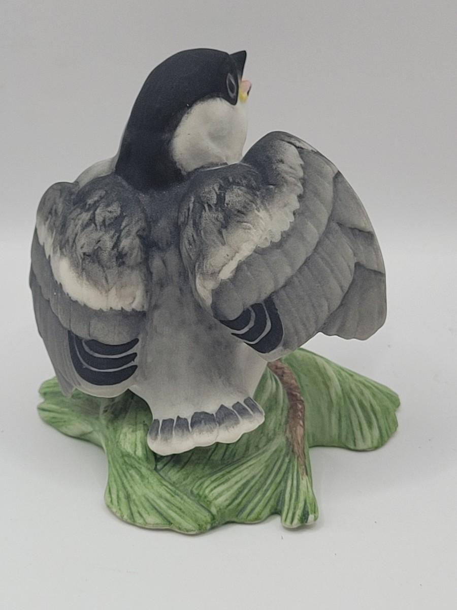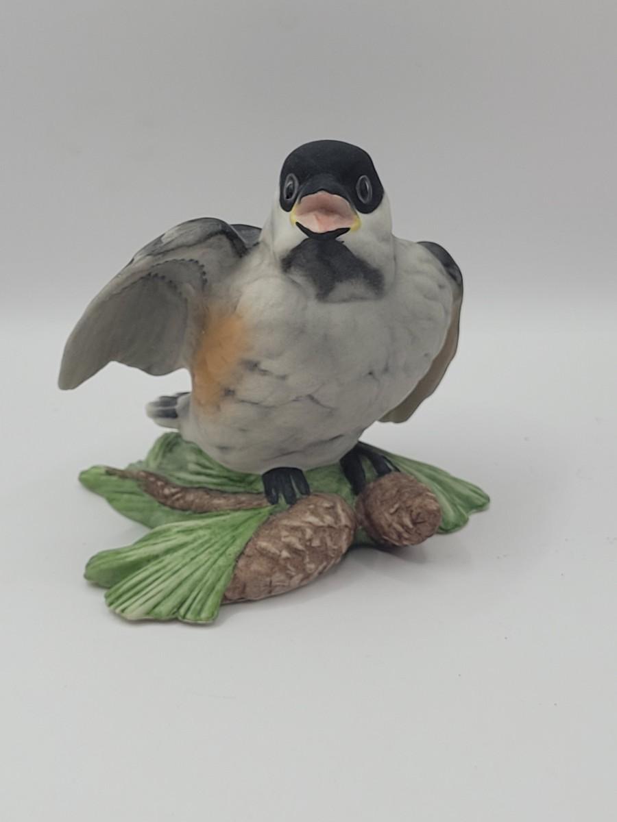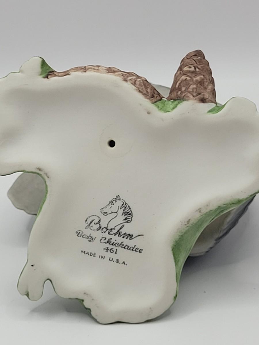 This cute baby chickadee, Hallmark #461, circa 1962 - 1973, is from a series of fledglings created by the Boehm company during this time period. Bravely perched on a pine branch, the baby chickadee with hungry mouth open is fluttering his young wings to draw attention to the fact he is ready for more to eat. Created with the exquisite attention to detail for which Boehm is noted, this is a must have for the bird watcher in all of us. The fledgling measures 3 1/4" in height and 3 1/2" across and is fully marked with the Boehm insignia of that era