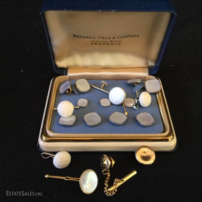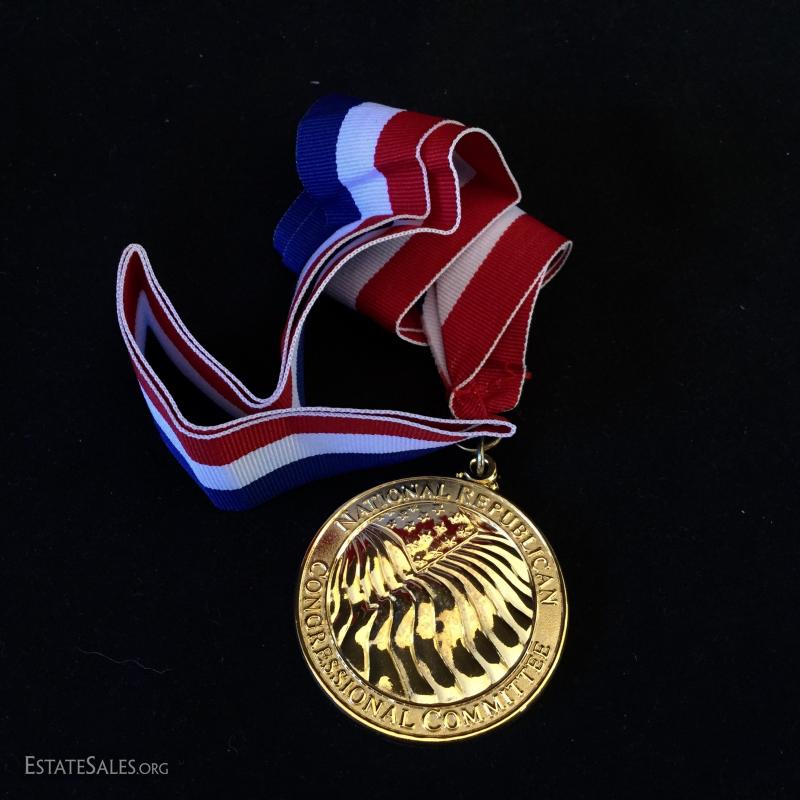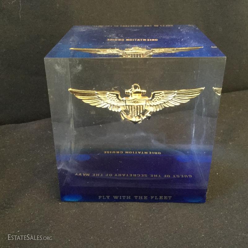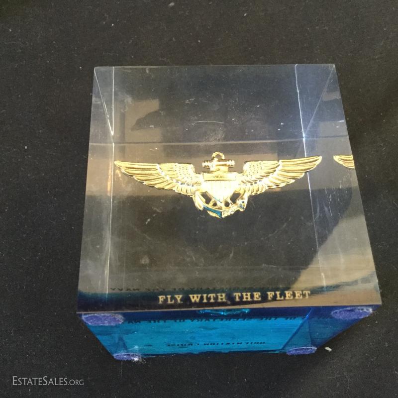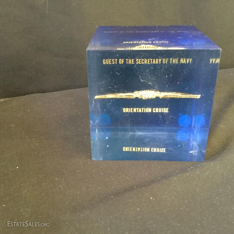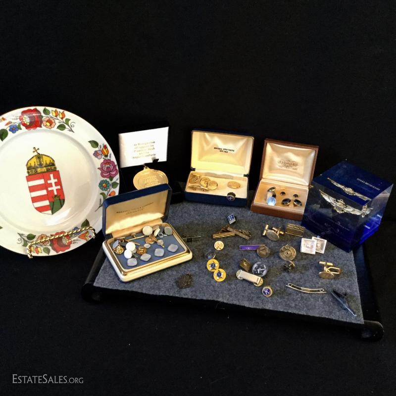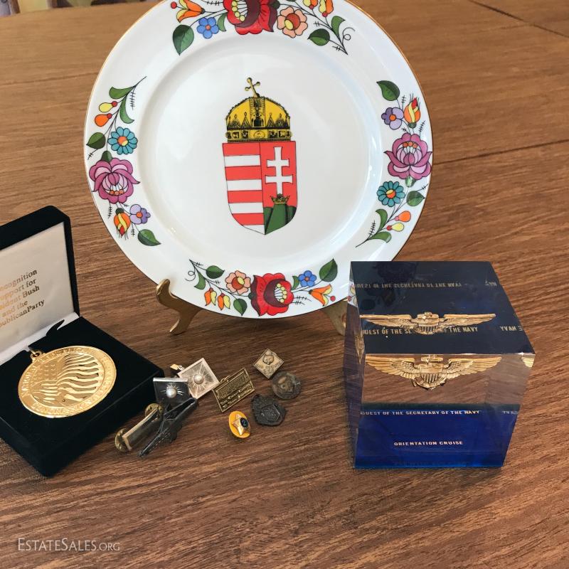 A large assortment of pins, buttons and cuff links. Some sterling. See photos. Also includes Republican Medal and very interesting paperweight that was given to the Guest of The Secretary of the Navy (3" cube). You'll also find a collectible hand-painted plate from Hungary (8"d). Shipping available or local pick up in Flat Rock, NC.
