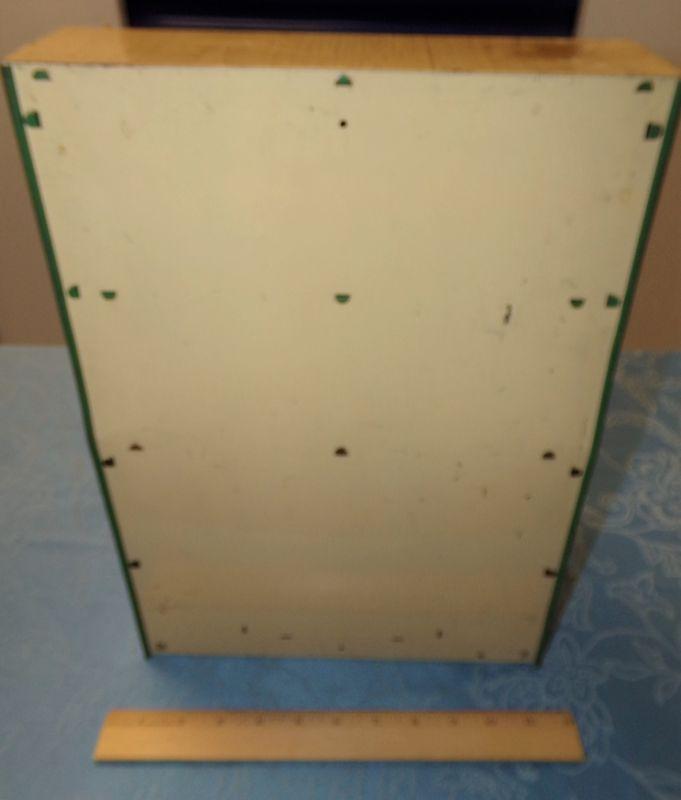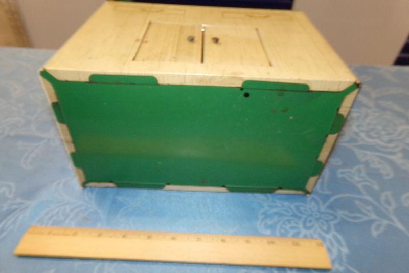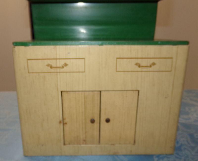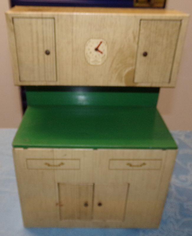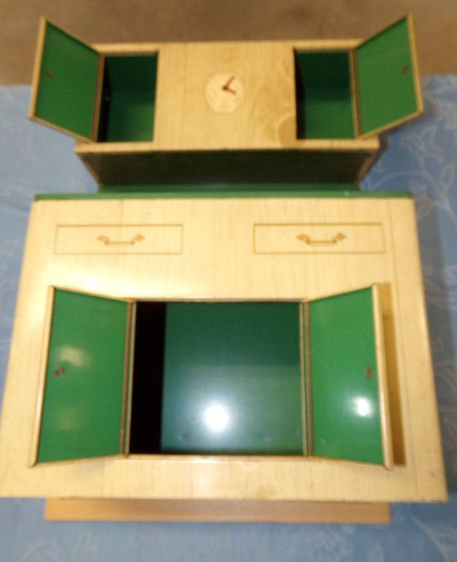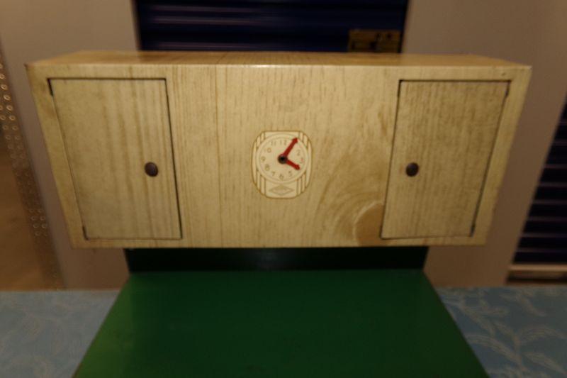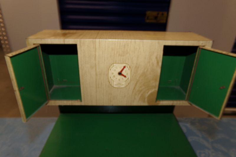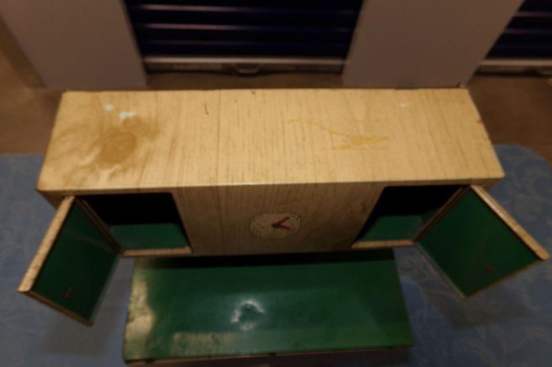 VINTAGE TIN TOY KITCHEN CABINET WITH 4 CABINET DOORS THAT OPEN AND THE CLOCK HAS METAL HANDS THAT MOVE WITH A FINGER.