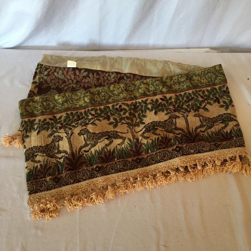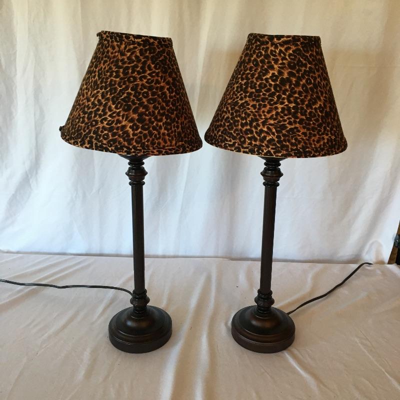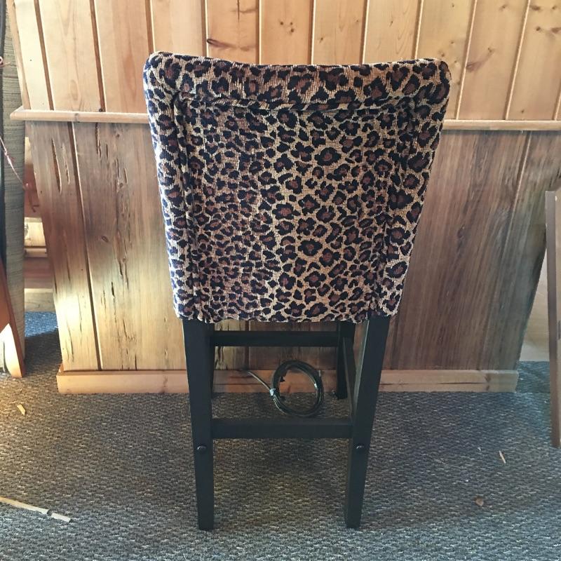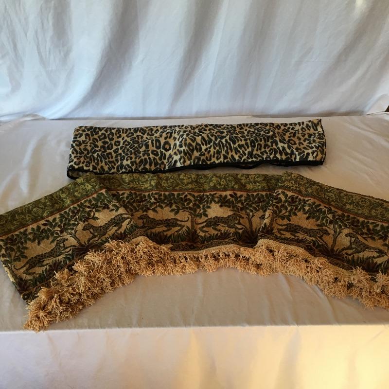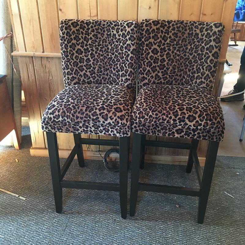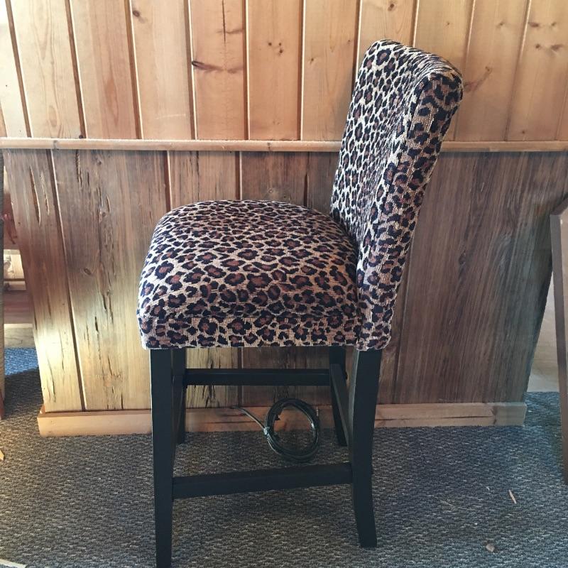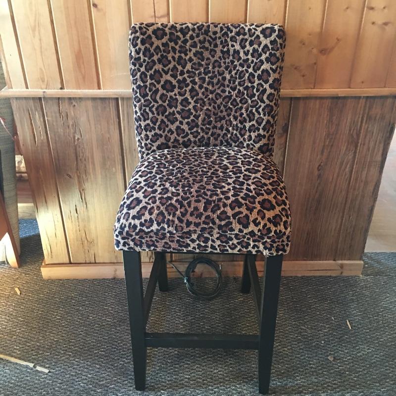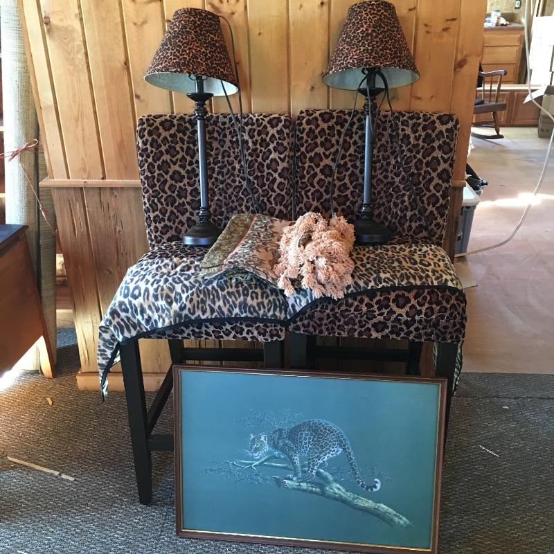 This leopard print collection includes two barstools, two table lamps, Kim Brooks framed print and a three piece valance. Welcome to the jungle with this ferocious collection. Barstools measure 19” x 19” x 43” with a 29” seat height. Each valance is approximately 50” x 13” (not including tassels). One leopard valance may be missing one or two tassels.