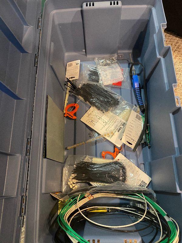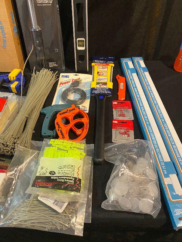 Craftsman 25 - 250 ft-lb torque wrench, level, outdoor electrical wire, sandpaper, hammer, large flashlight, Quick Grips, saw, zip ties, towel bars, mini hand saw, knife, extension cord adapter and more