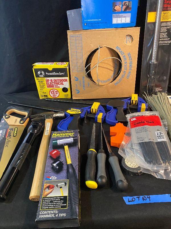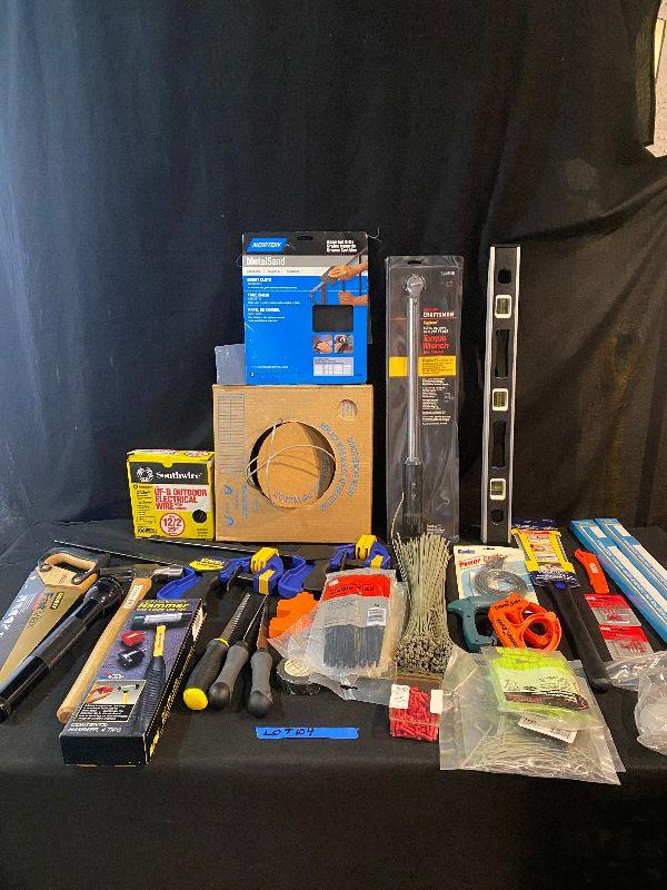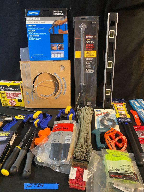 Lot 104 - Tools (Craftsman 25 - 250 ft-lb torque wrench, level, outdoor electrical wire, sandpaper, hammer, large flashlight, Quick Grips, saw, mini hand saw, knife, and much more!)