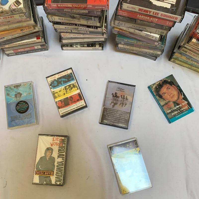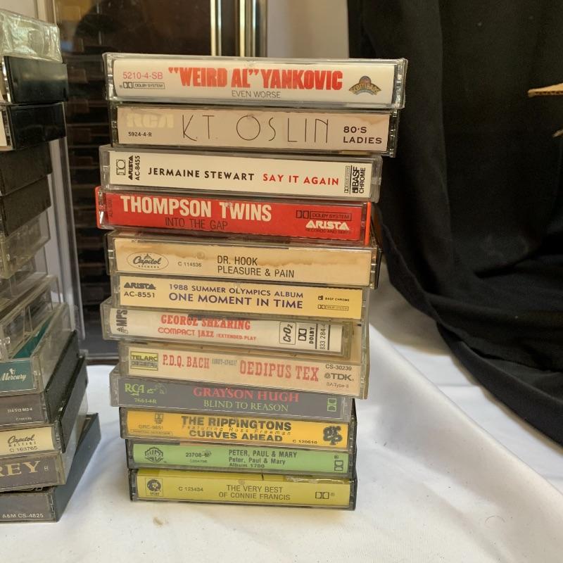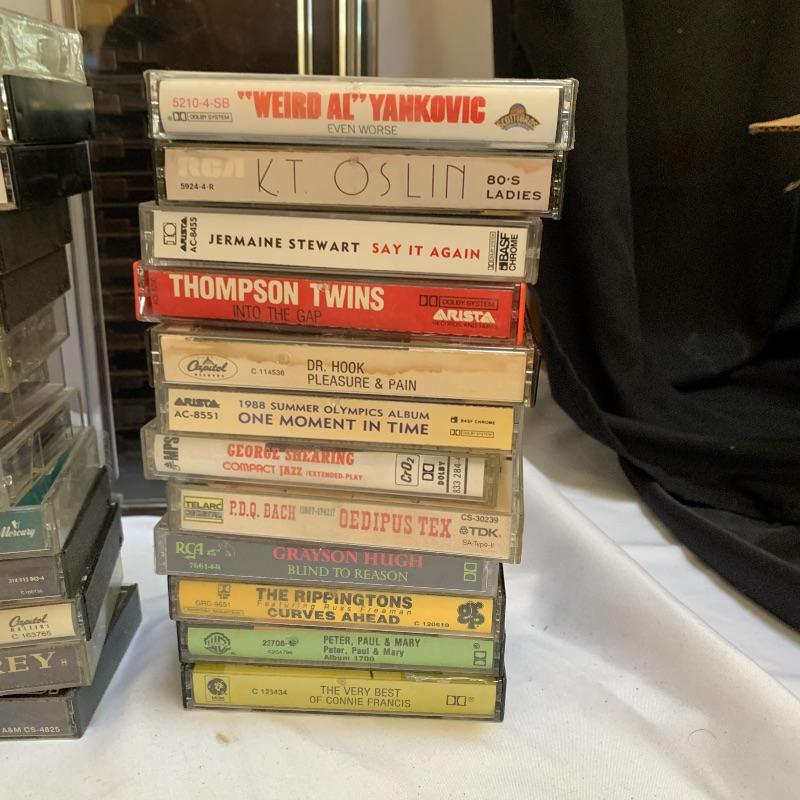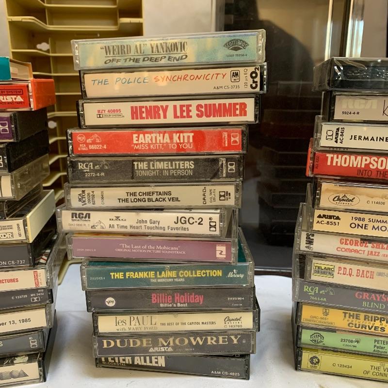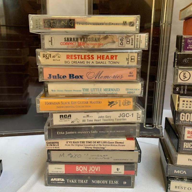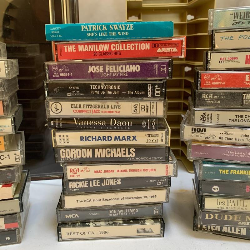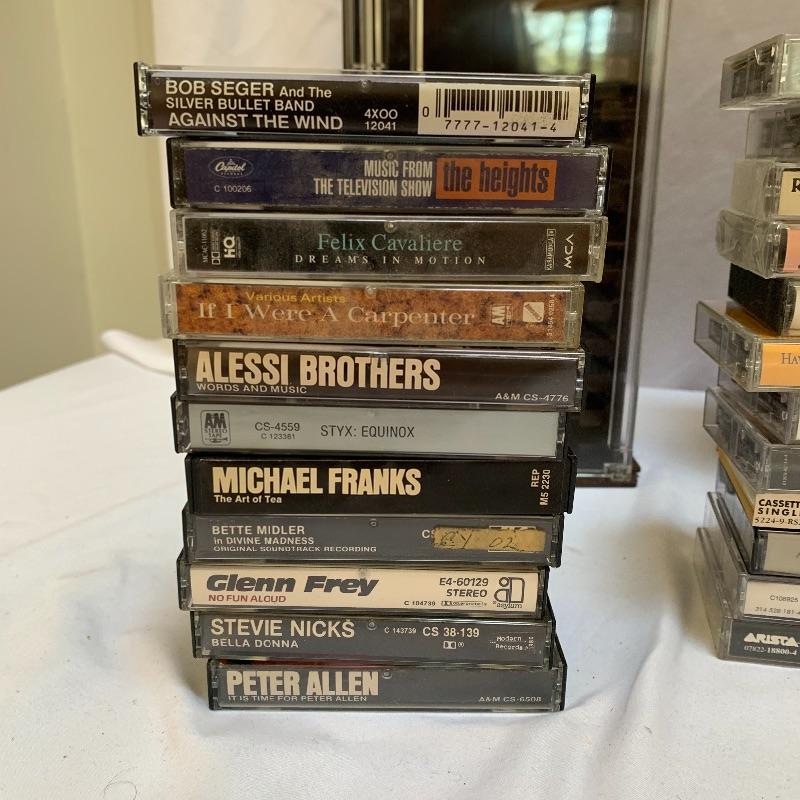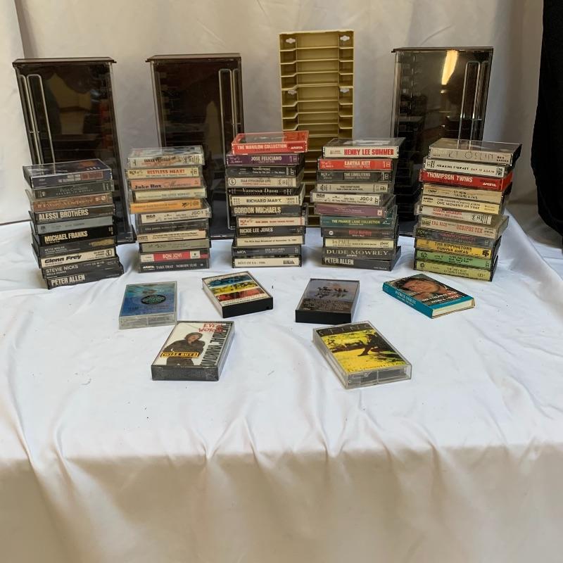 Break out the old cassette player! Lot 104 includes music from top selling recording artists such as Richard Marx, Rickie Lee Jones, Billie Holiday and many more. There are 64 cassettes in all. This lot also includes four cassette storage racks. Shipping available.