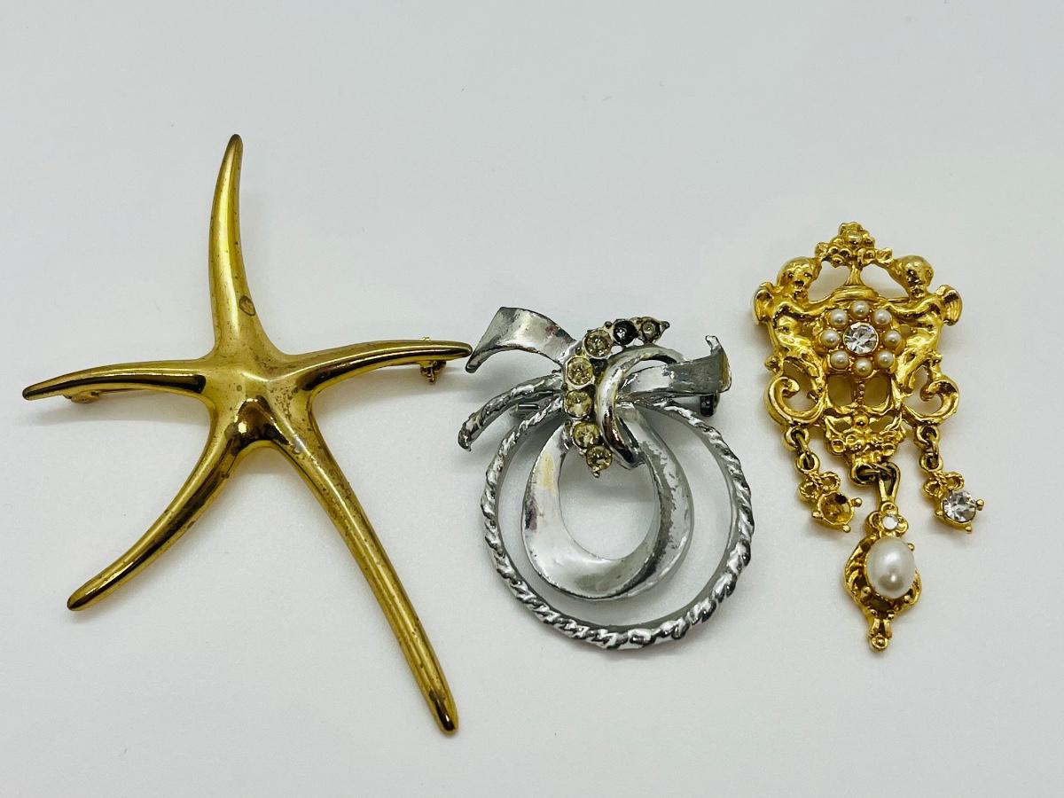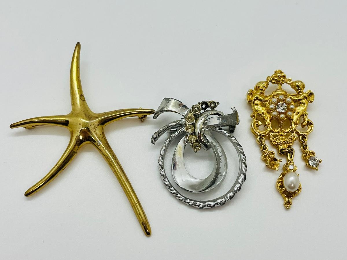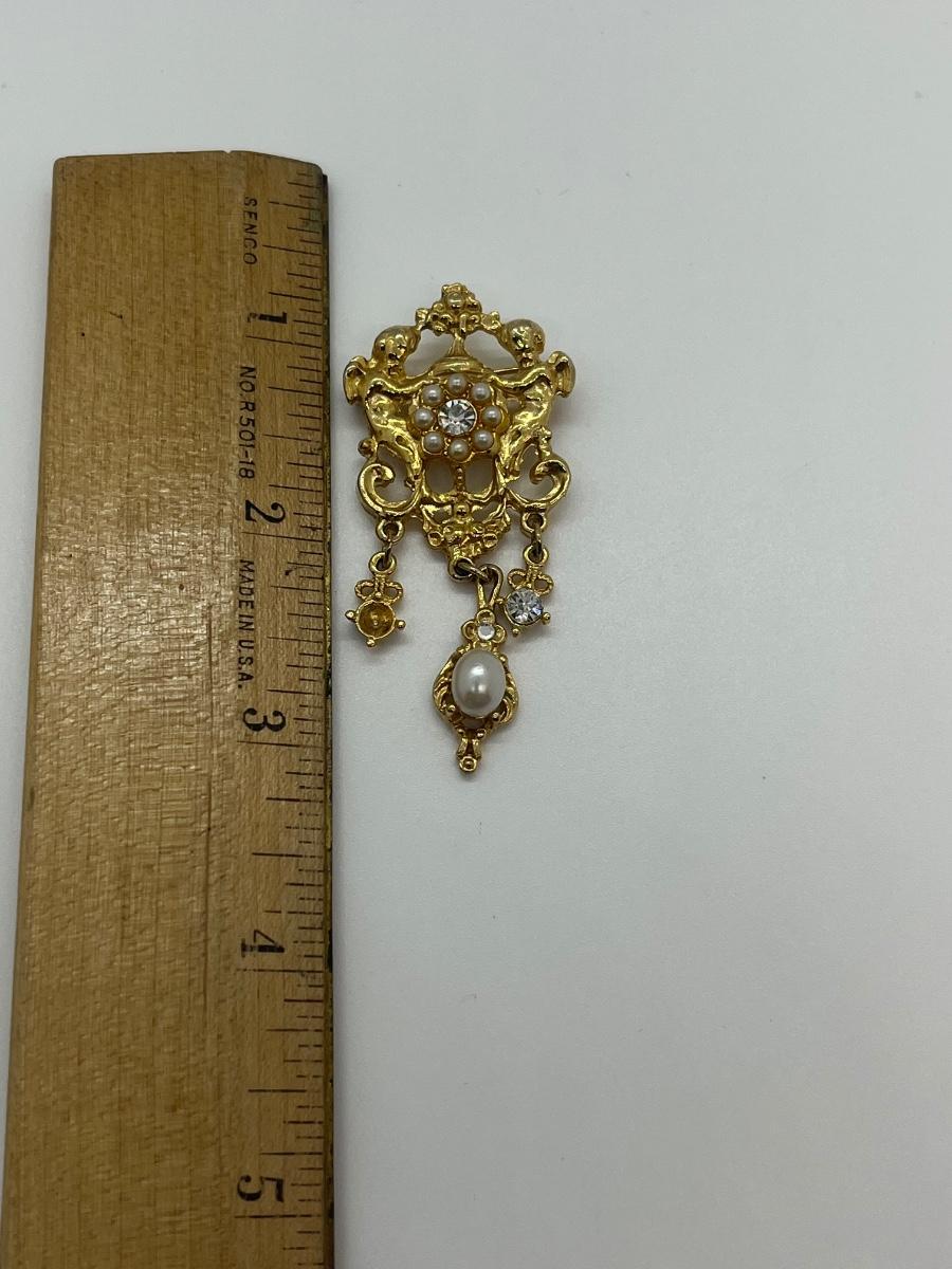 Silvertone and Cherub brooches each are missing one rhinestone. The pictures show condition, measurements if taken, and what is included in the lot. Due to the large amount that we photograph and the time frame, we are not always able to take measurements. All items unless noted, are pre-owned and have been used, and are untested. Thank you