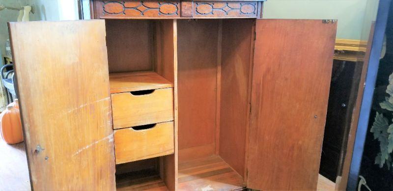 Antique 1920's Chiffarobe with 2 interior drawers - has original castors - 37.5" wide, 69" tall, 19.5" deep. Has been sitting in this home for years - could use some love. Please look at all photos. Piece is sturdy and HEAVY.