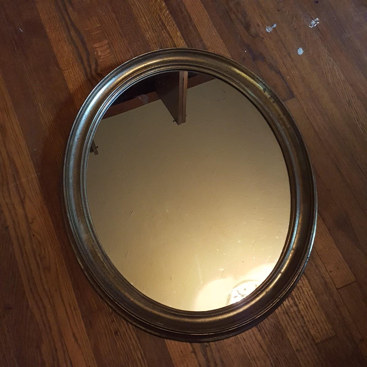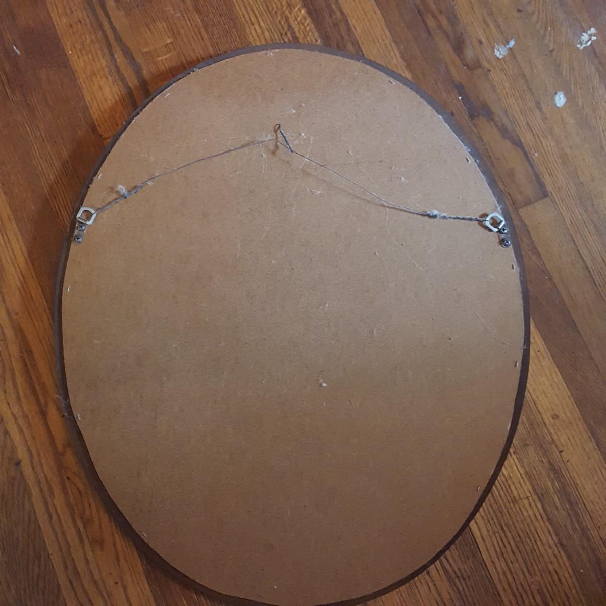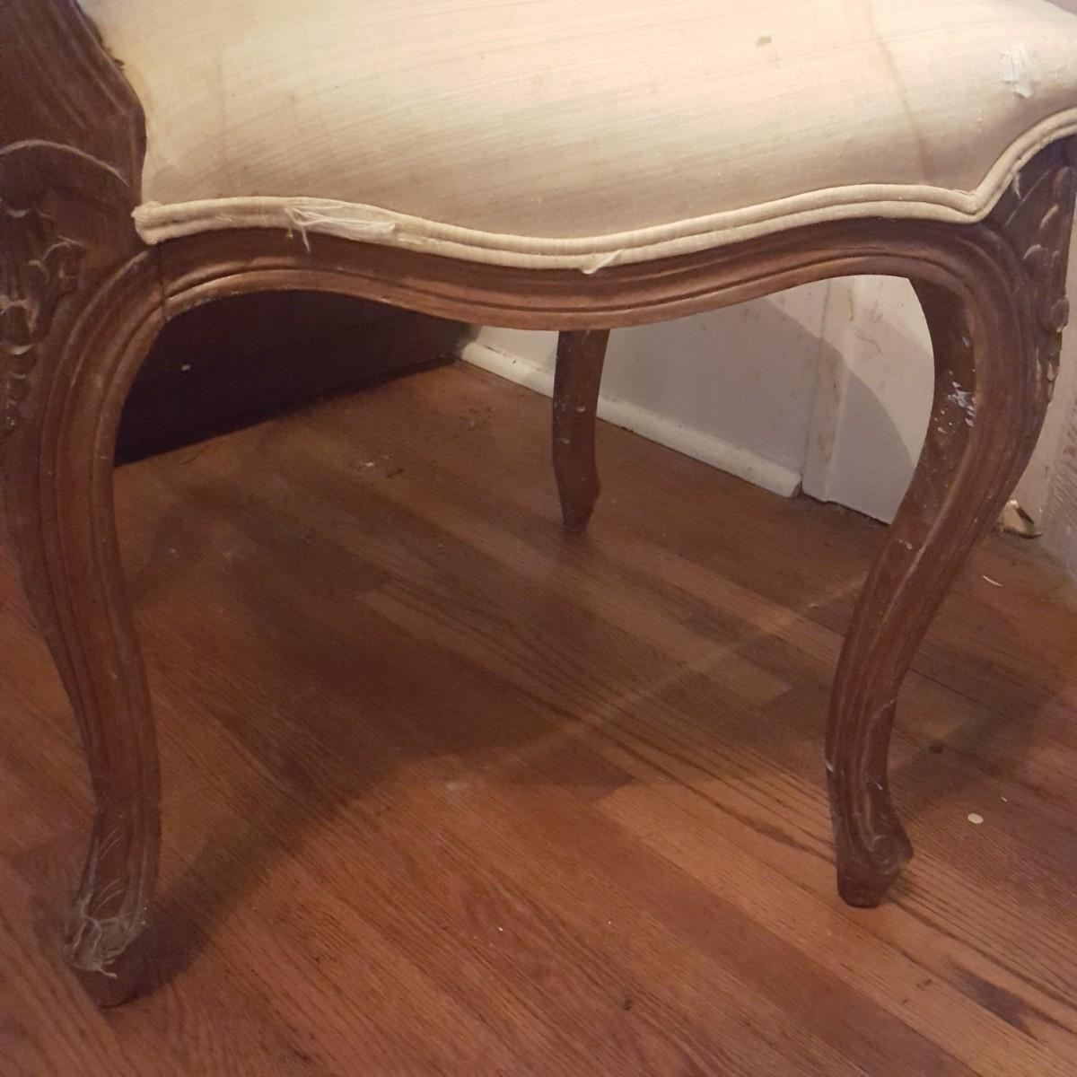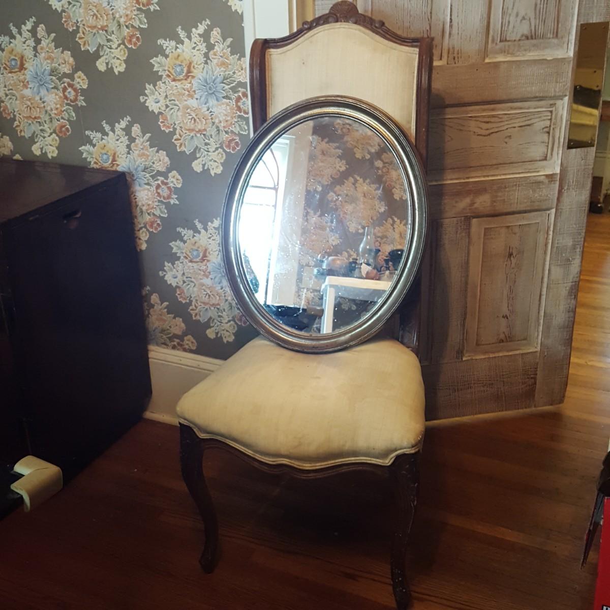 This lot contains a beautiful wooden chair carved with details! The chair measures 17x20x44 inches. The seat is 18 inches off the ground. The upholstery in highly stained, but could be replaced to enhance this unique chair. The mirror with a goldish finish measures 1 1/4x18x22 inches and would look beautiful above a mantel or by your front door! Local pick up only.