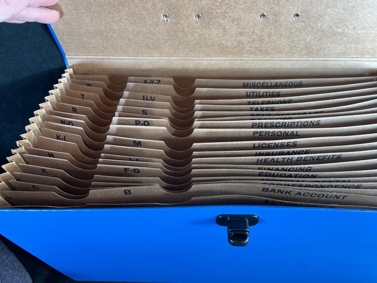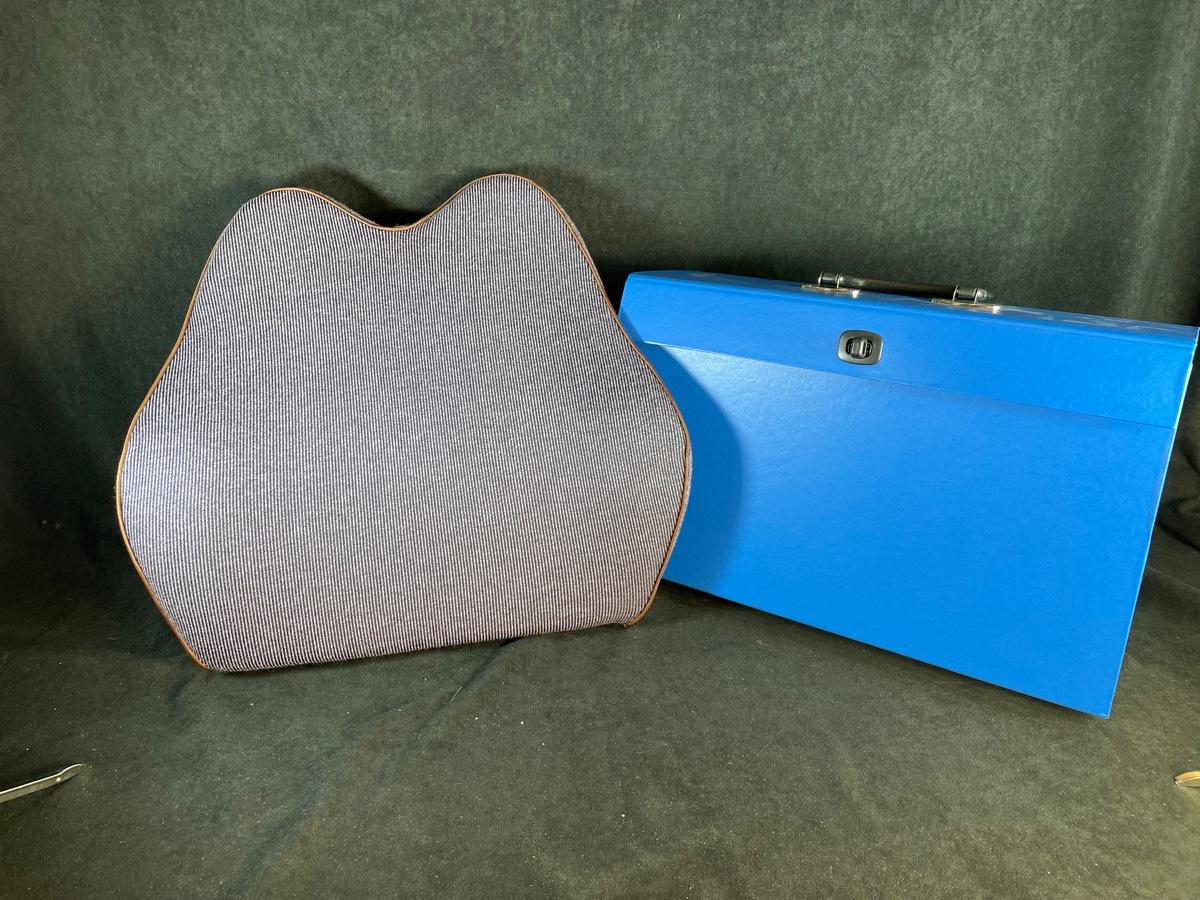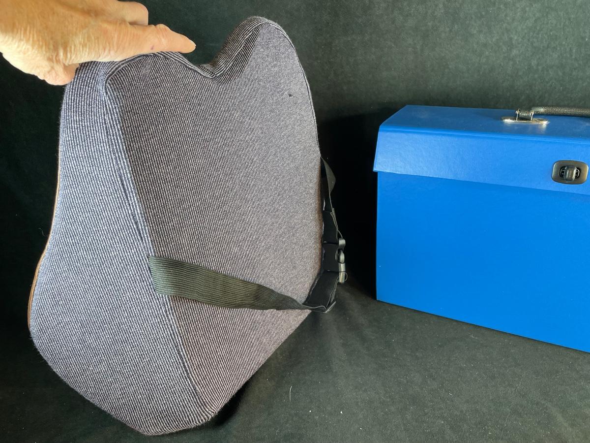 Lower-back cushion with chair strap plus expanding file in a cardboard case--like new
