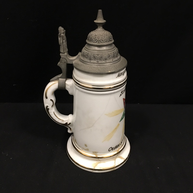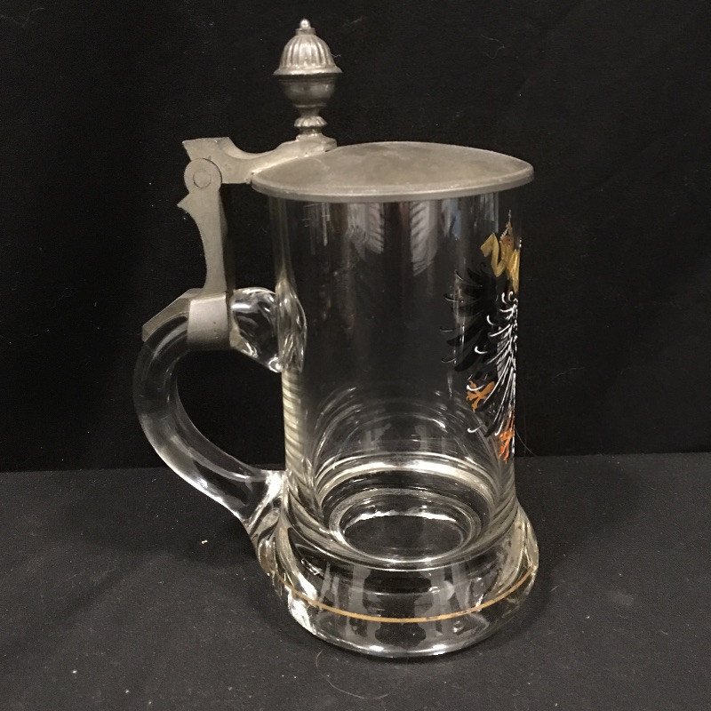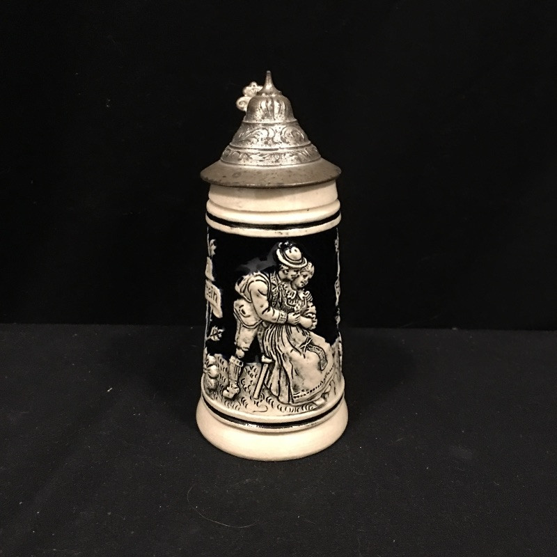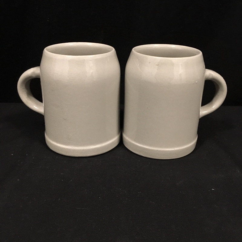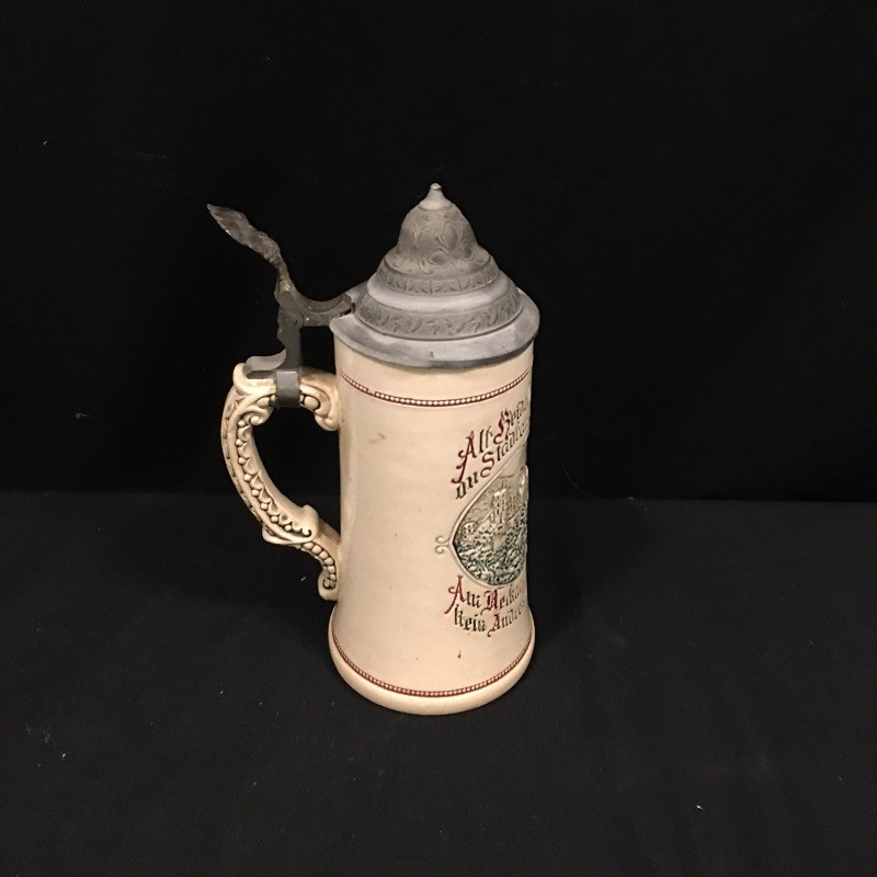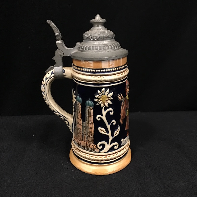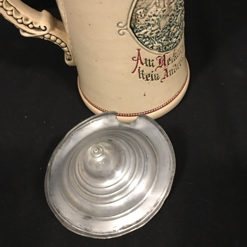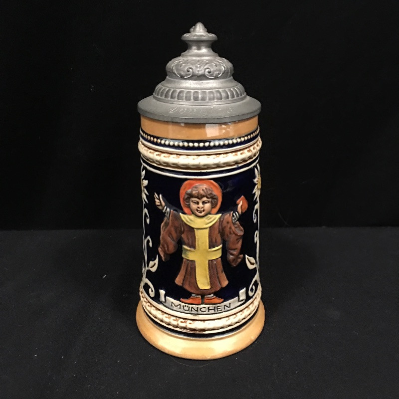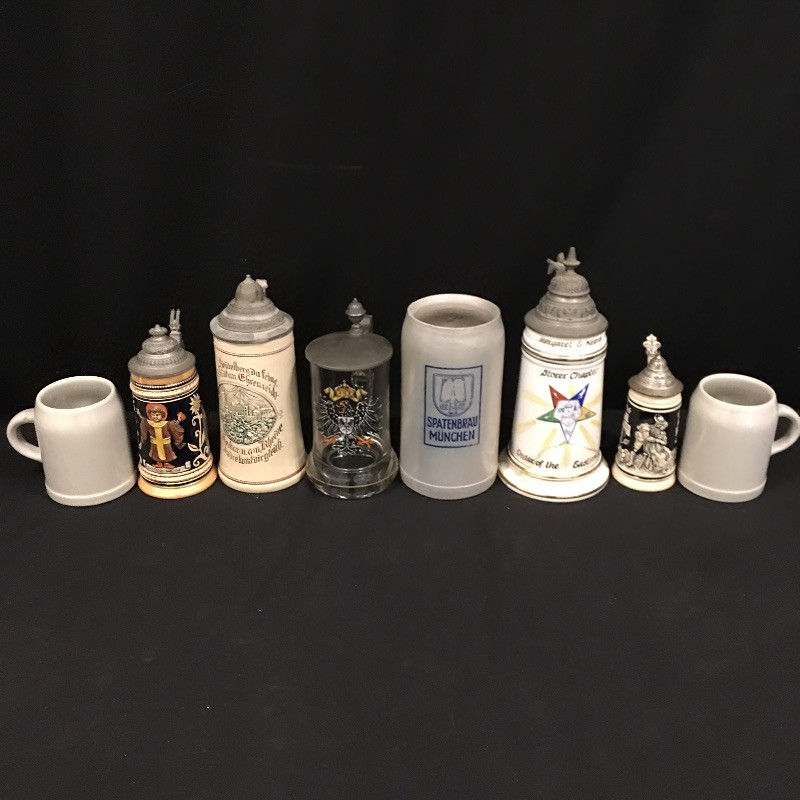 A unique collection of mostly German beer steins and mugs. Five beer steins with lids and three mugs complete this ensemble. One stein lid is not attached and one stein has been repaired, see pictures. Largest stein measures 4.5”D x 10” tall.
