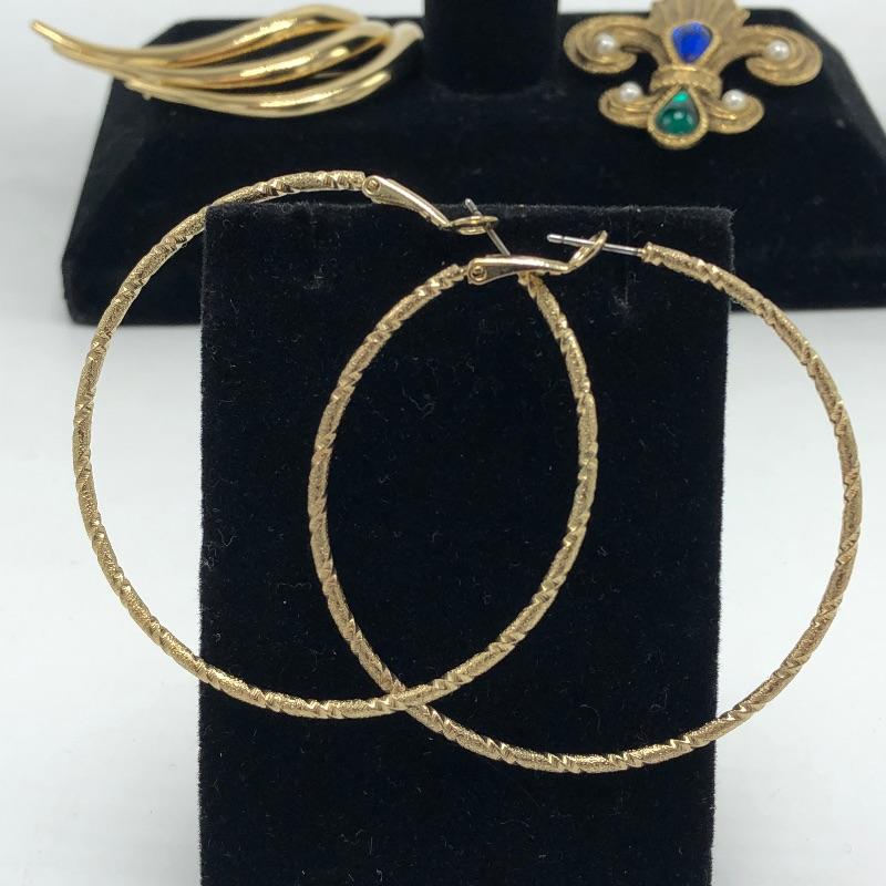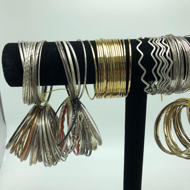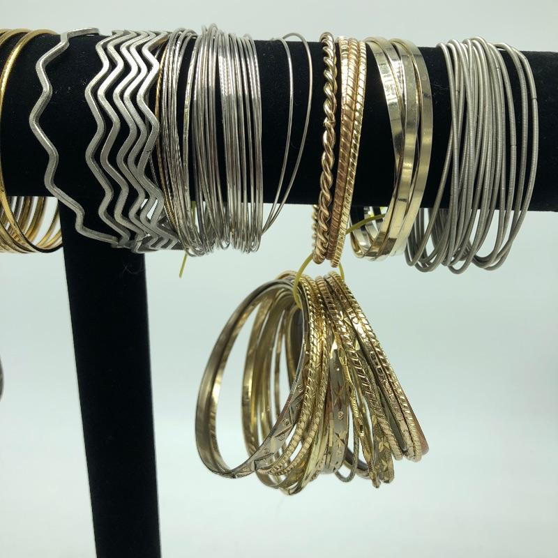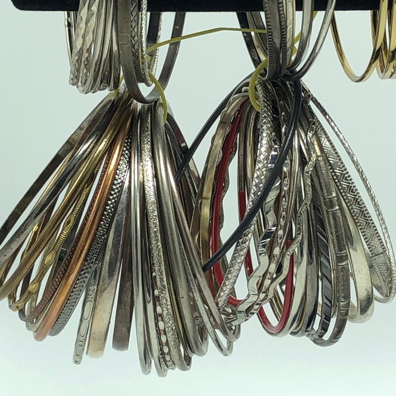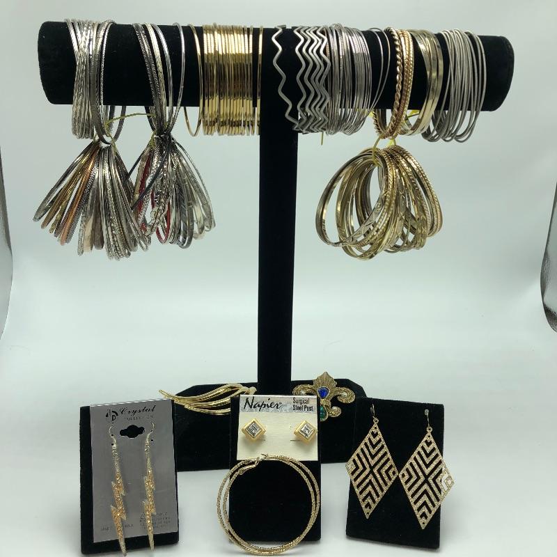 If 80s glam is your jam then rock it like the material girl in this huge assortment of different styles of silver, gold, bronze looking bracelets. Mix and match them with 4 pairs of pierced earrings and the two groovy pins.