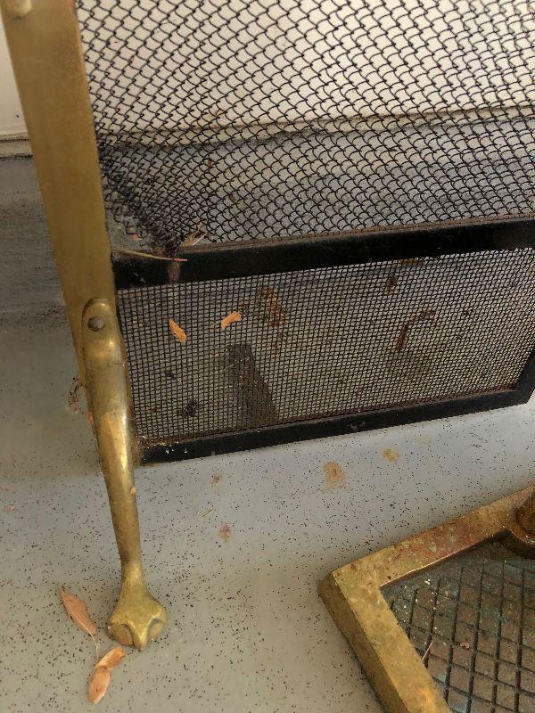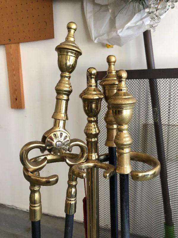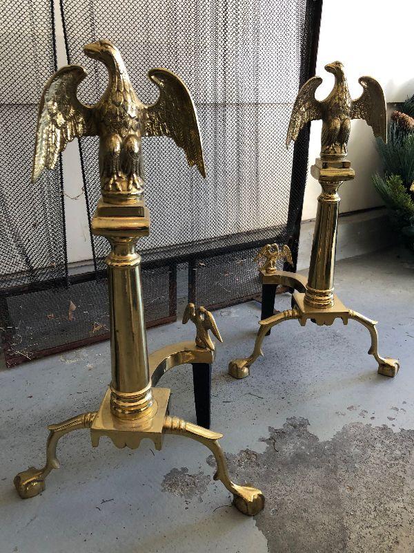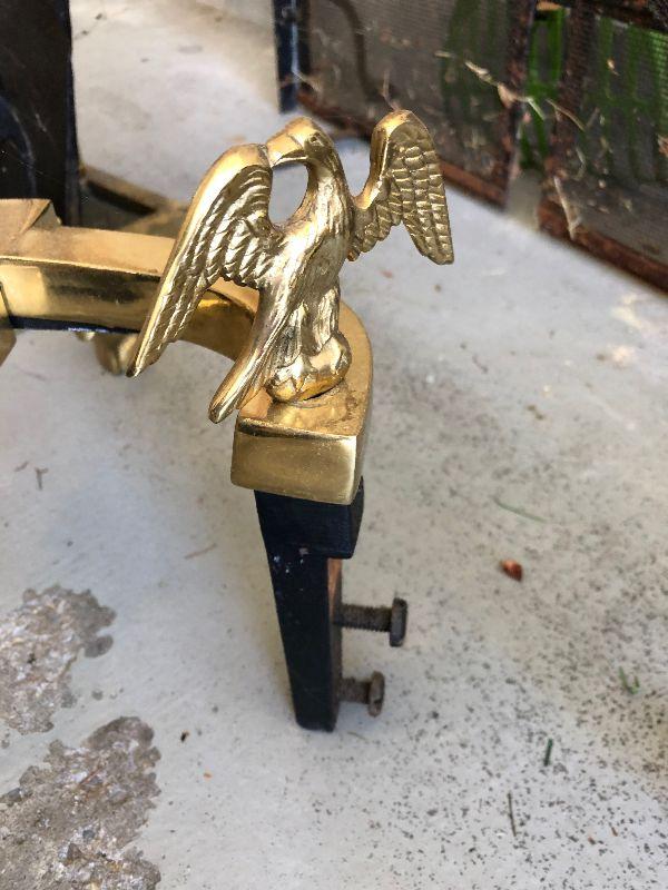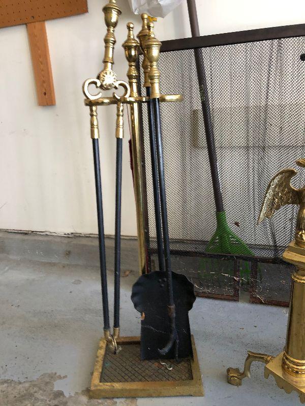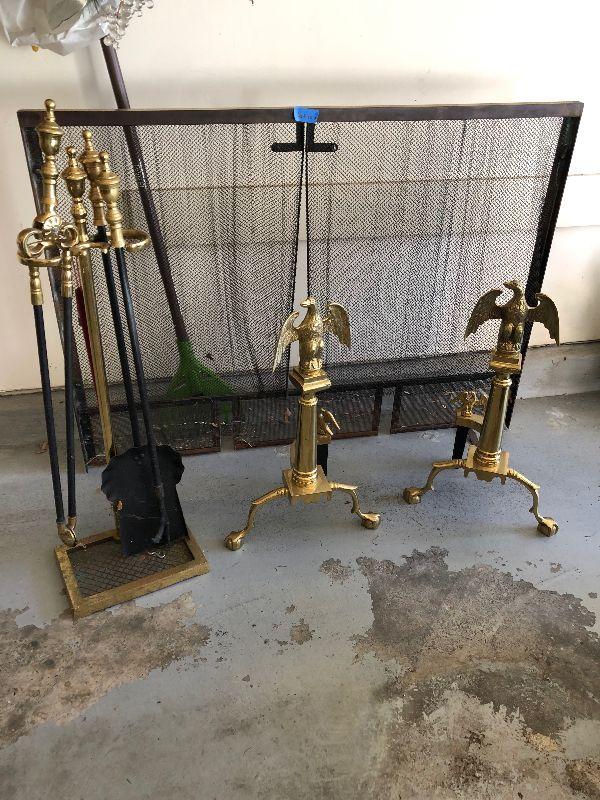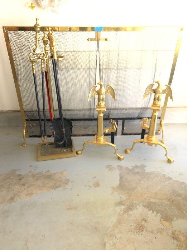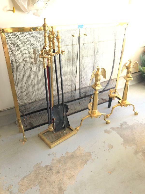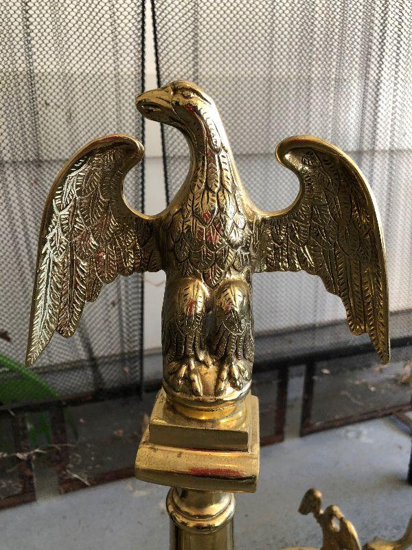 Brass Set Contains Eagle Andirons, Screen and Tools