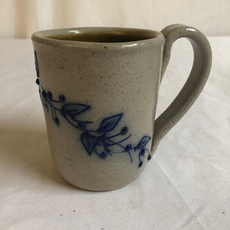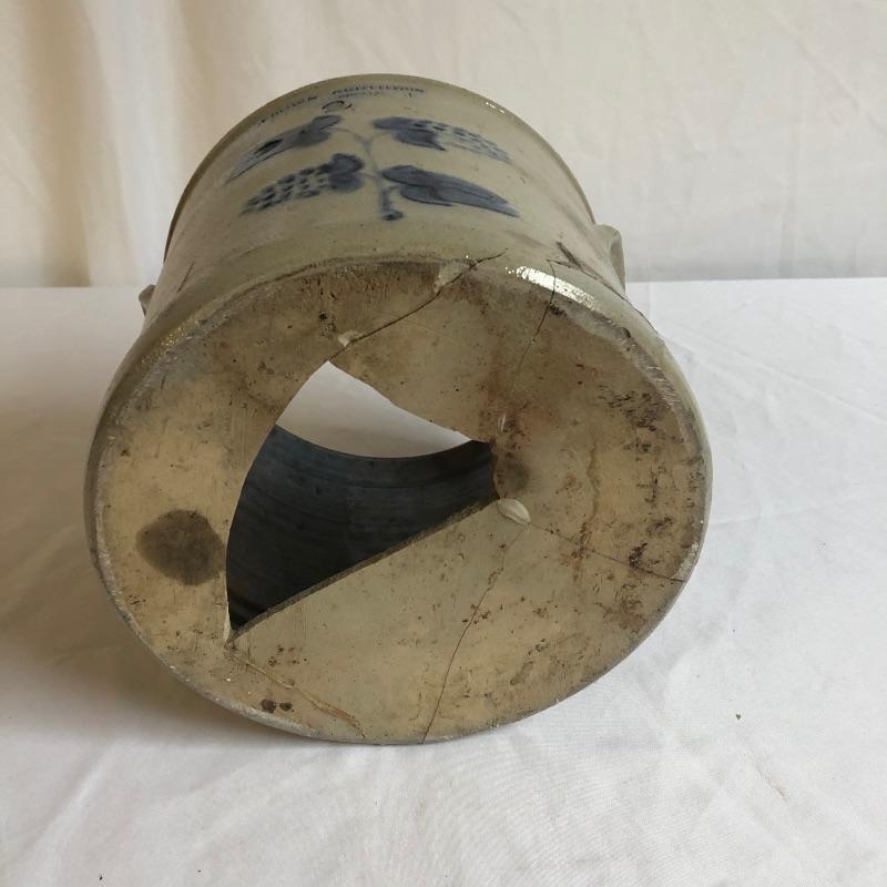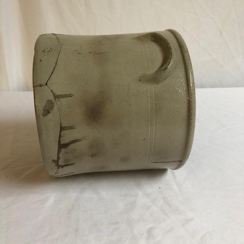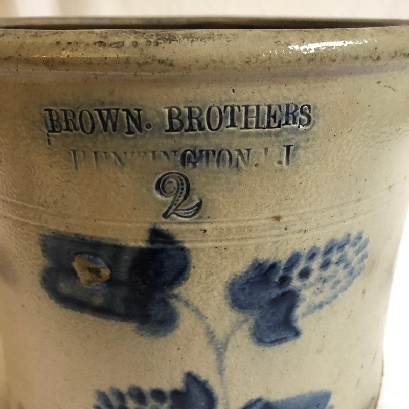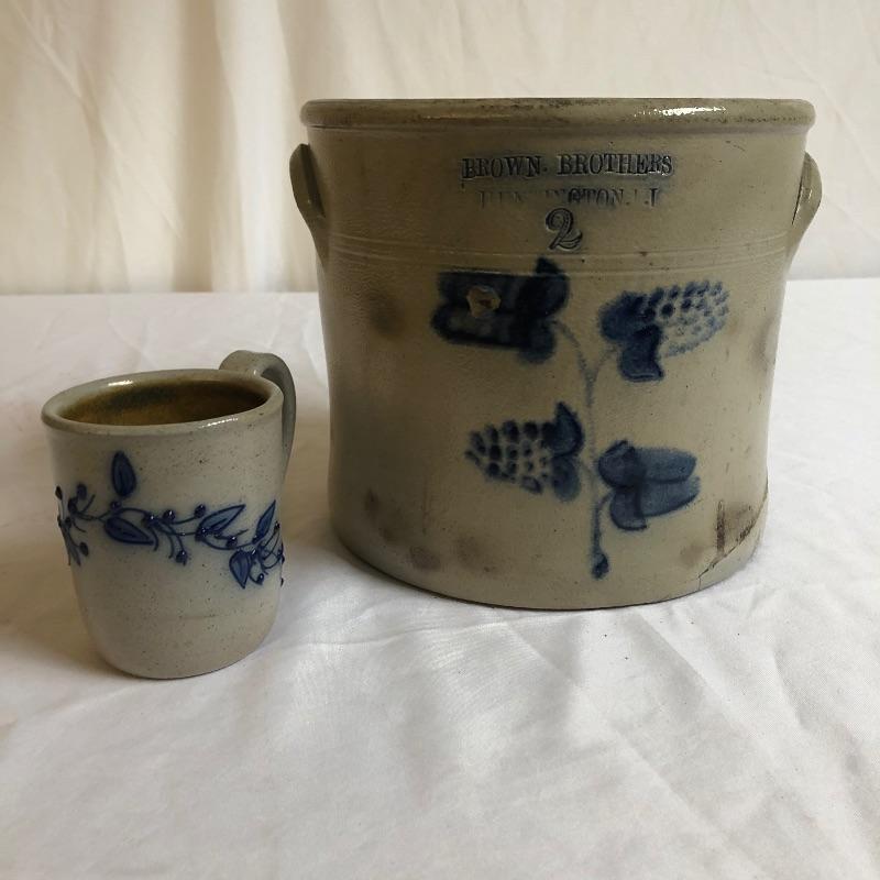 These pieces both feature a blue floral pattern. The crock would be great as a planter. It stands 9” tall and has a 10”d. There are some cracks in the bottom that had been glued back together and a missing piece but the crock itself seems quite sturdy. The crock is stamped with “˜Brown Brothers 2”. The cup is in great shape and stands about 5” tall. Shipping Available.
