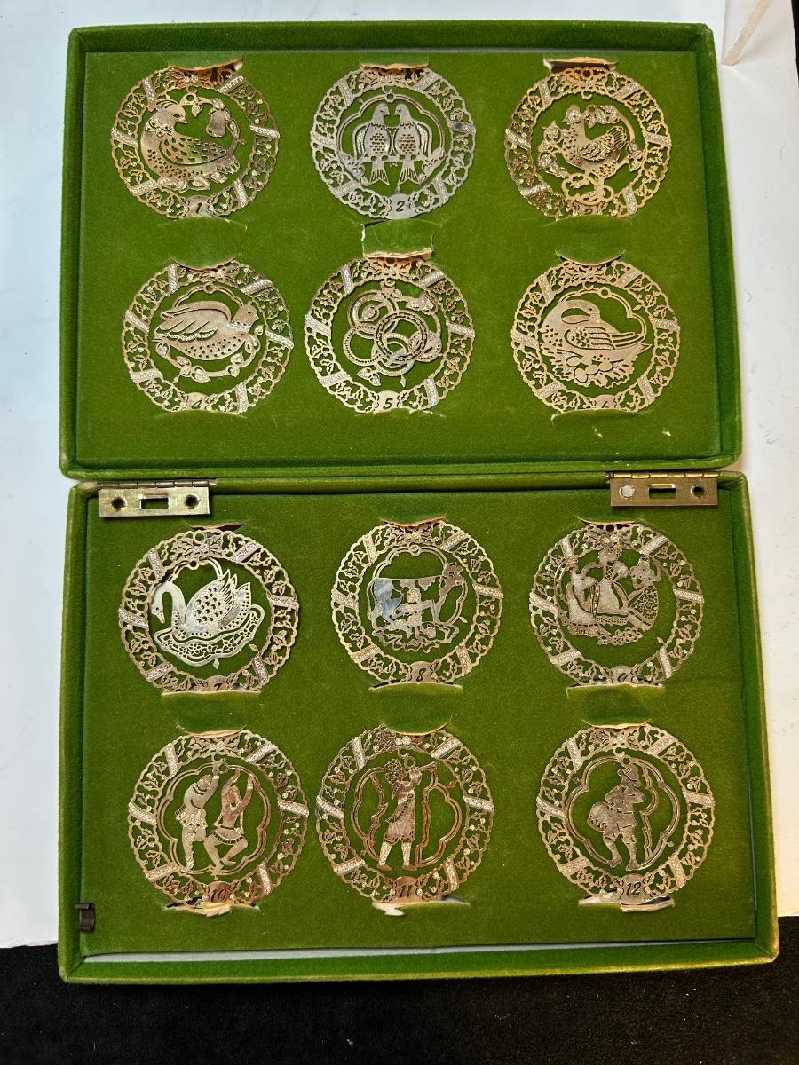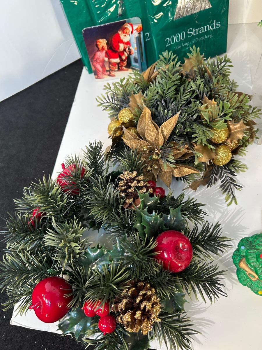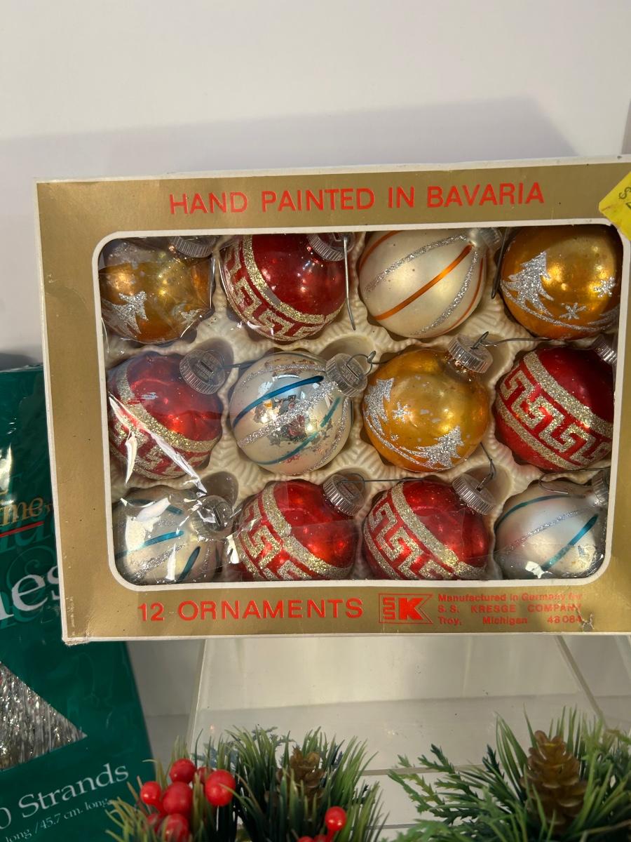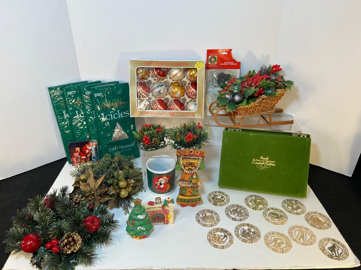 Includes Oneida 12 Days of Christmas Limited Edition ornaments, 4 things of candle greenery, Santa Coke cork coaster, Santa coffee mug, fireplace scene votive candle holder, 4 brand new packs of 2000 strands & 2 sets of 12 vintage ornaments hand-painted in Bavaria.