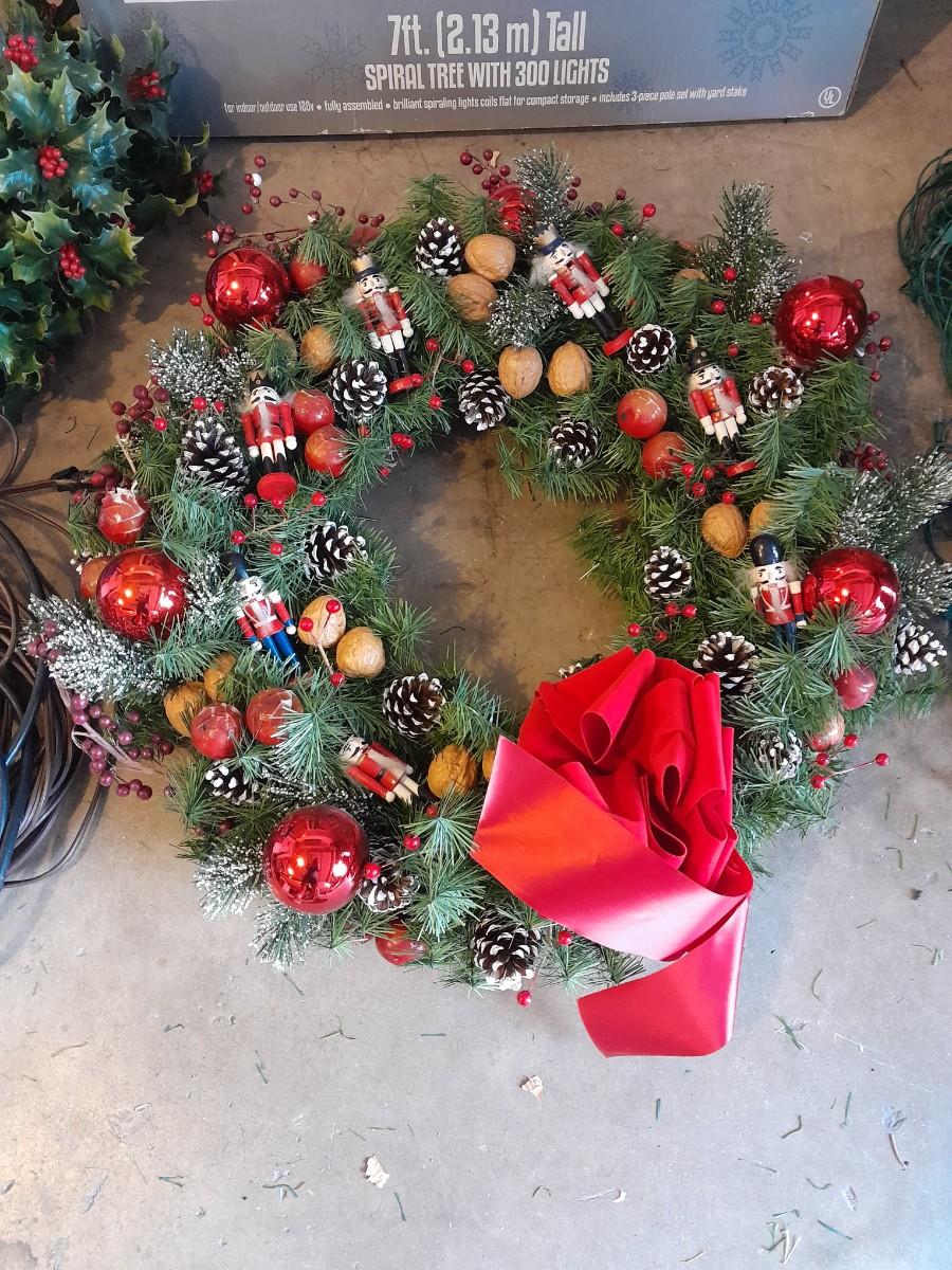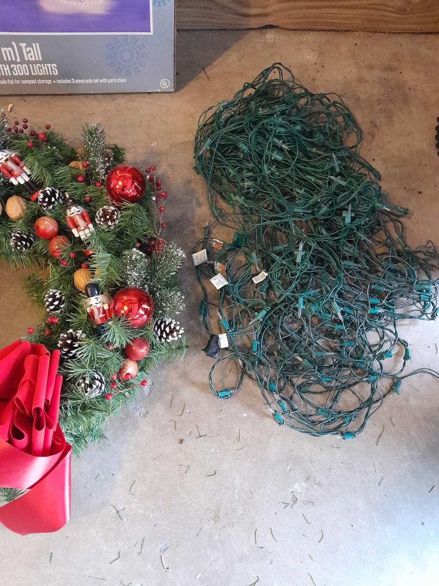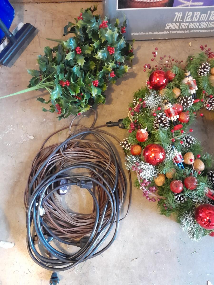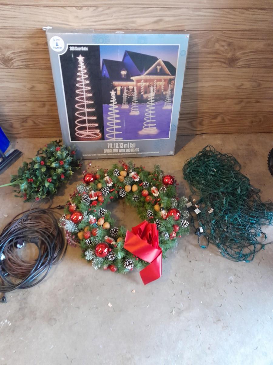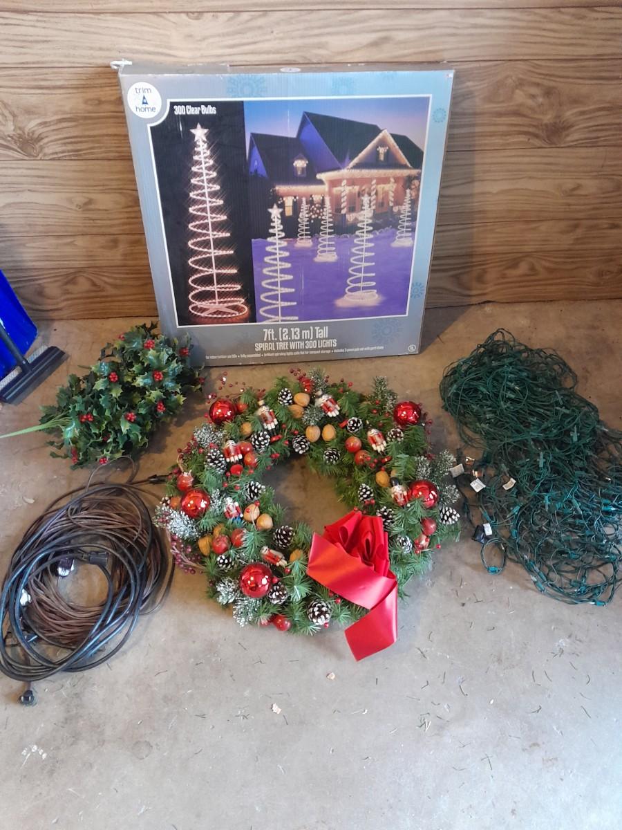 LOT 104 CHRISTMAS WREATH, 300 LIGHT SPIRAL TREE, LIGHTS AND MORE