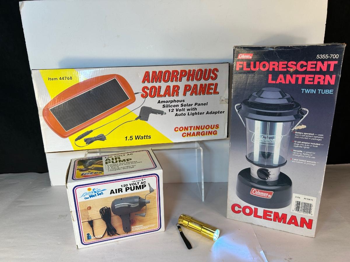 Lot 104. Coleman Lantern, Solar Panel, Air Pump